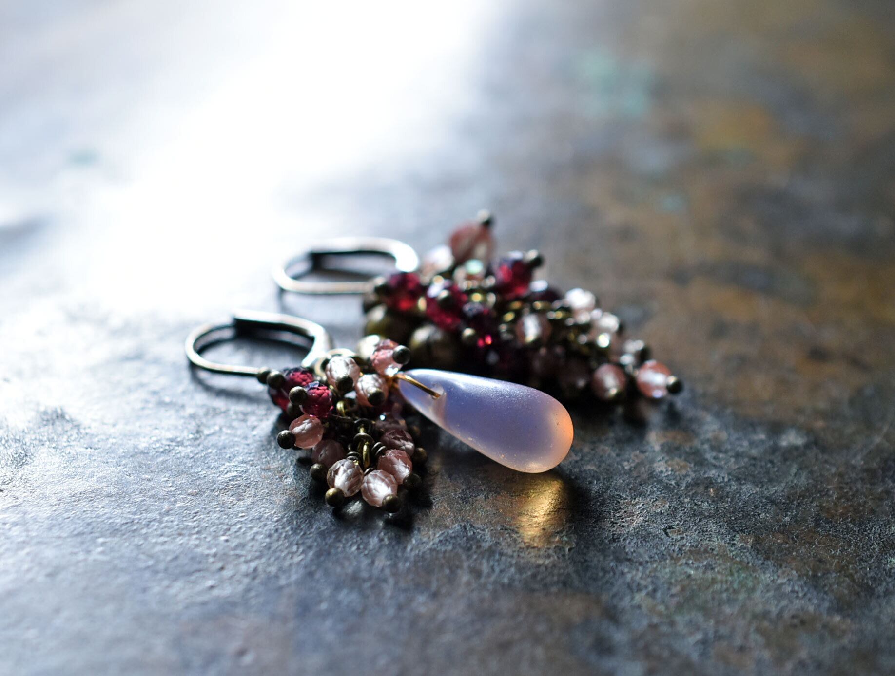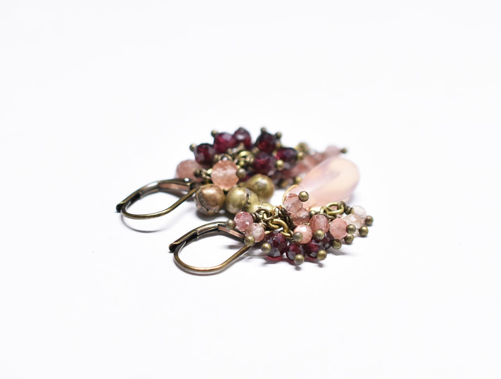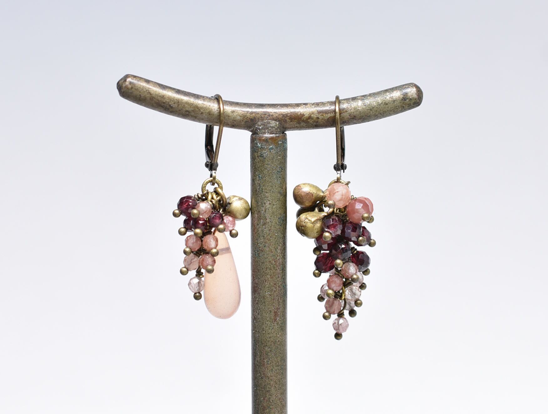 桃色ウエディングビーズとたわわなアンデシン&ガーネット、民族鈴のアンシメトリーピアス
