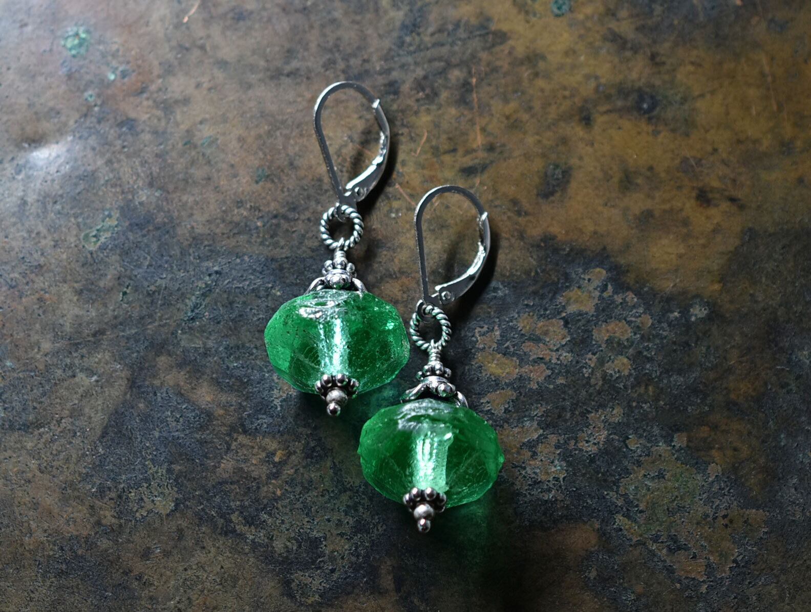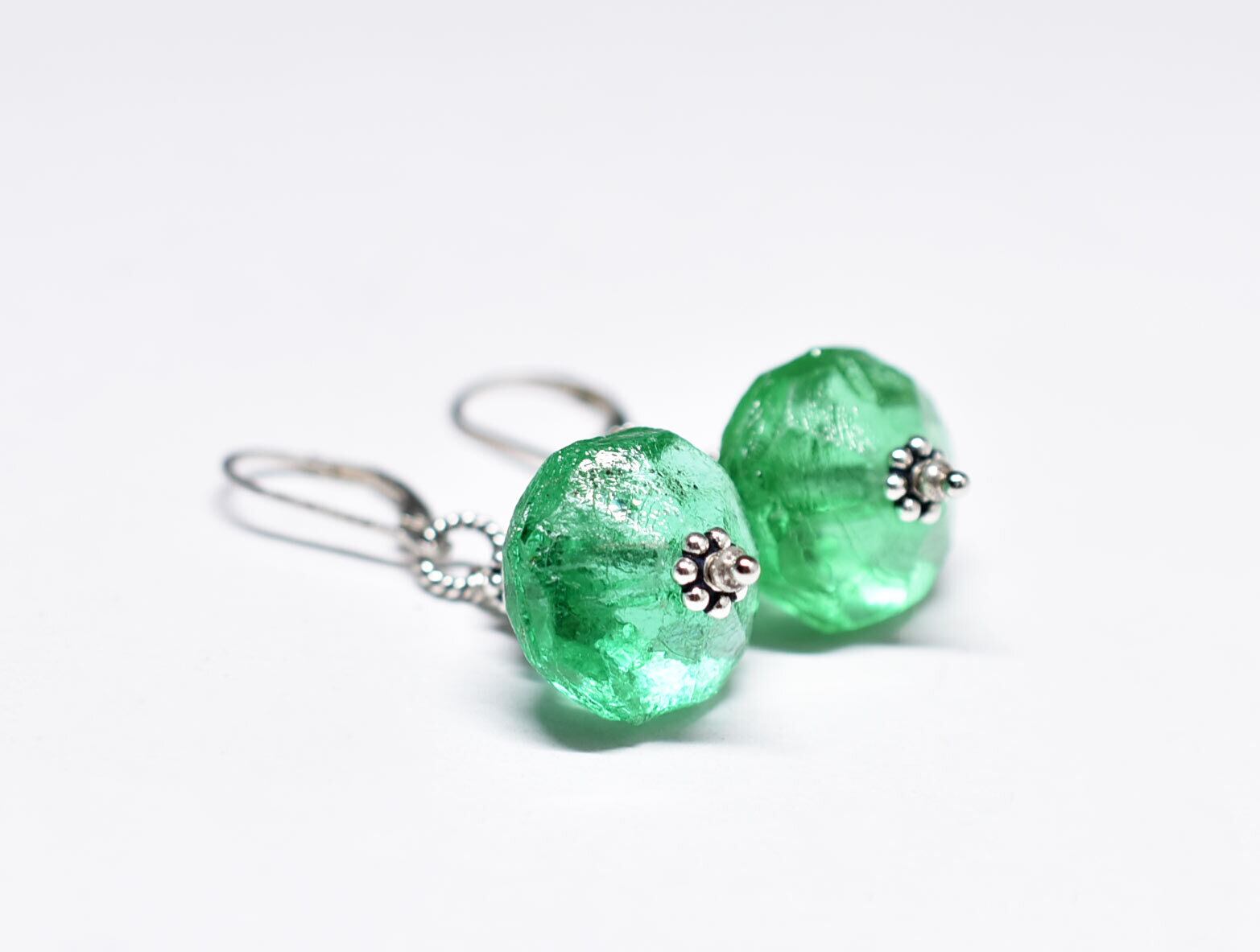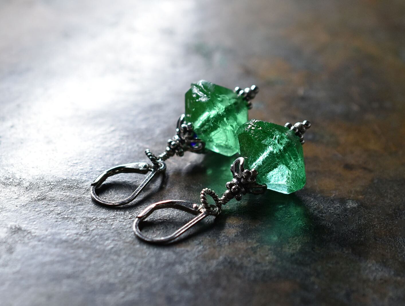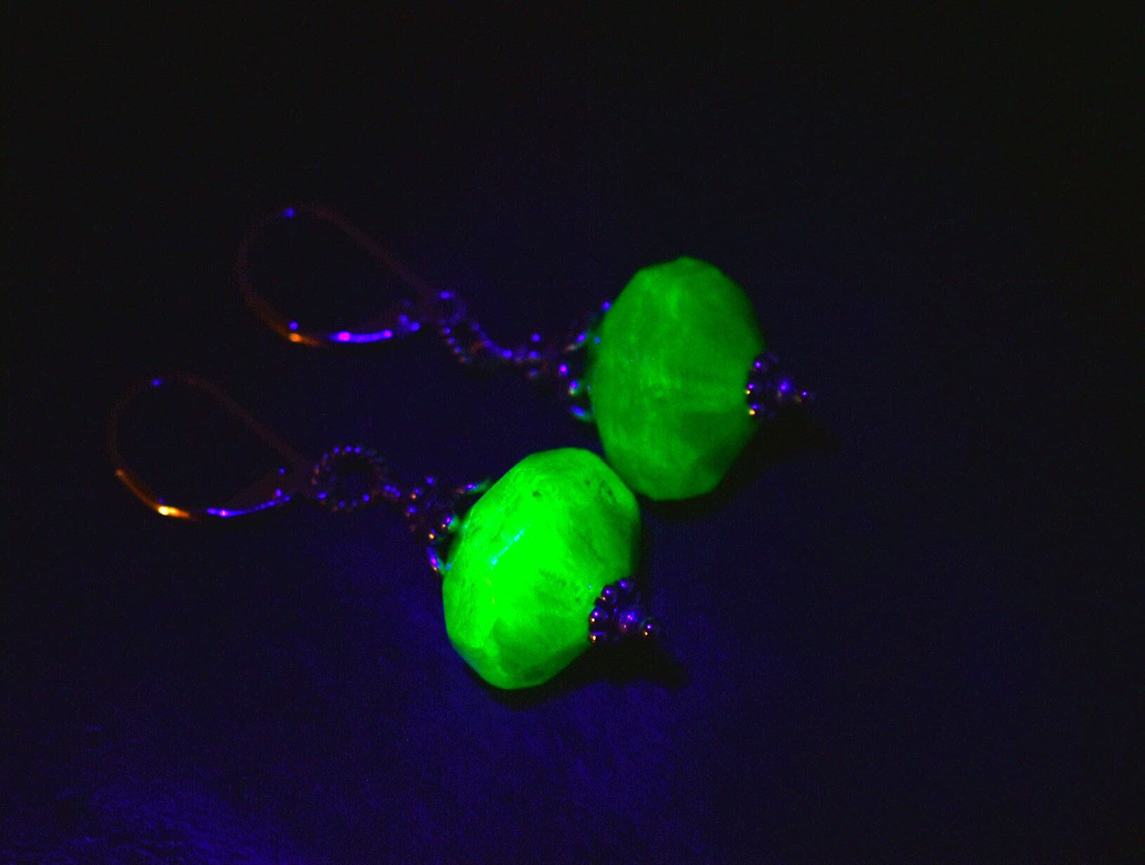 独特なセミクリアグリーンのビーズは、極々微量のウランで発色させています。ブラックライトを当てると光ります!