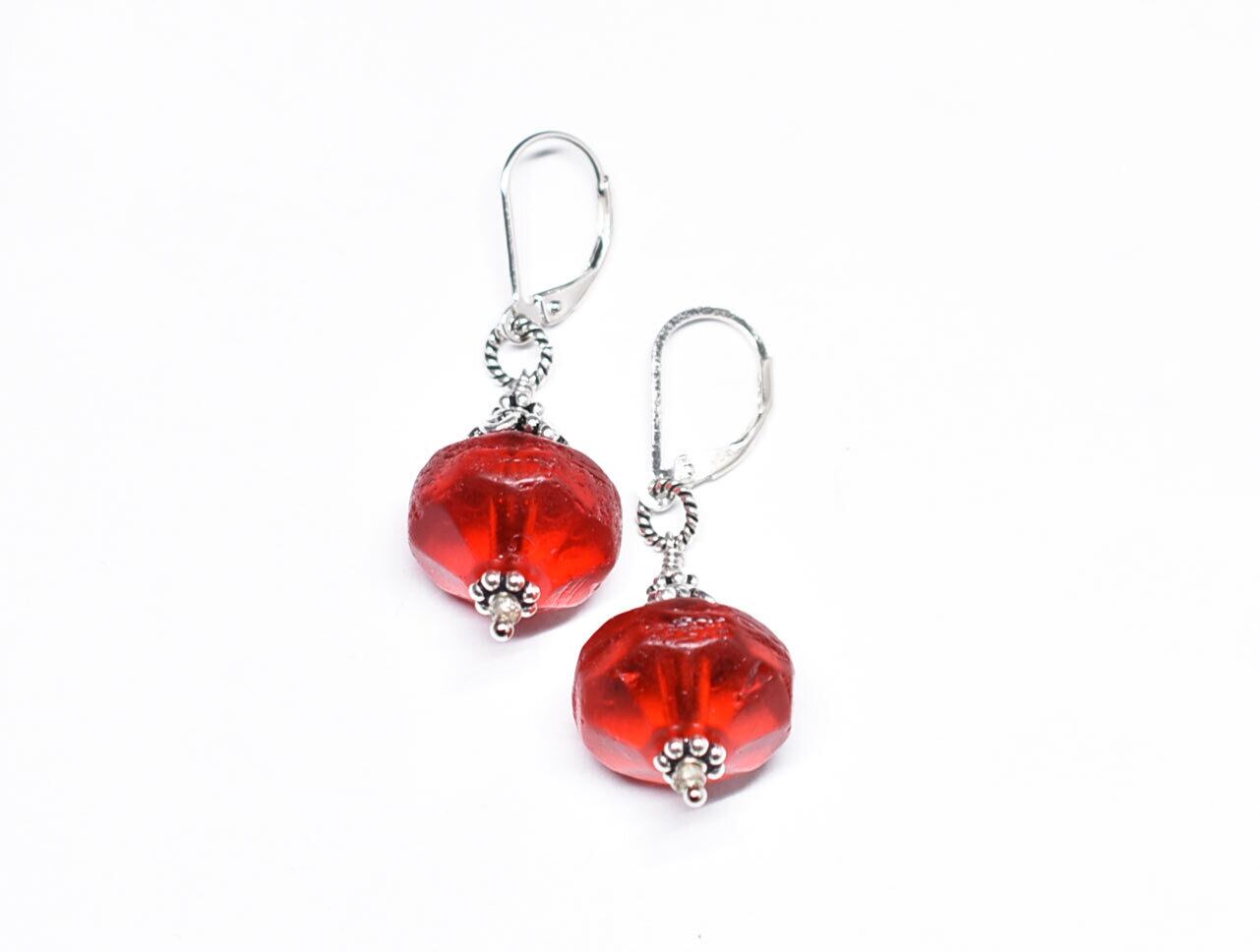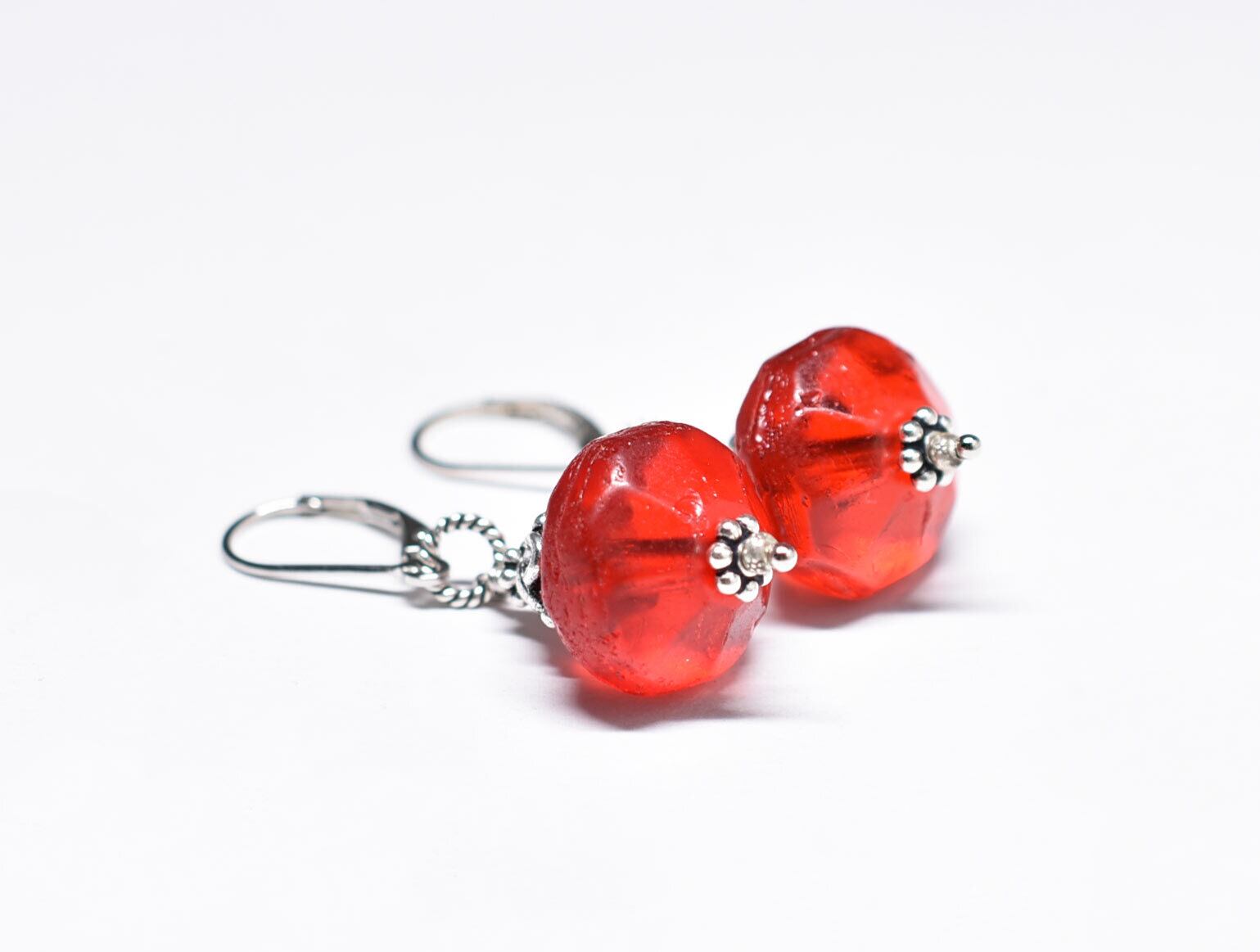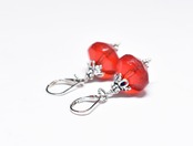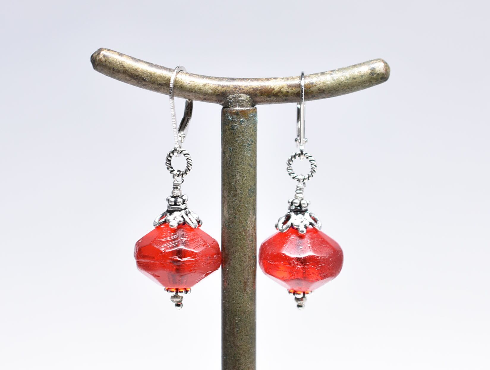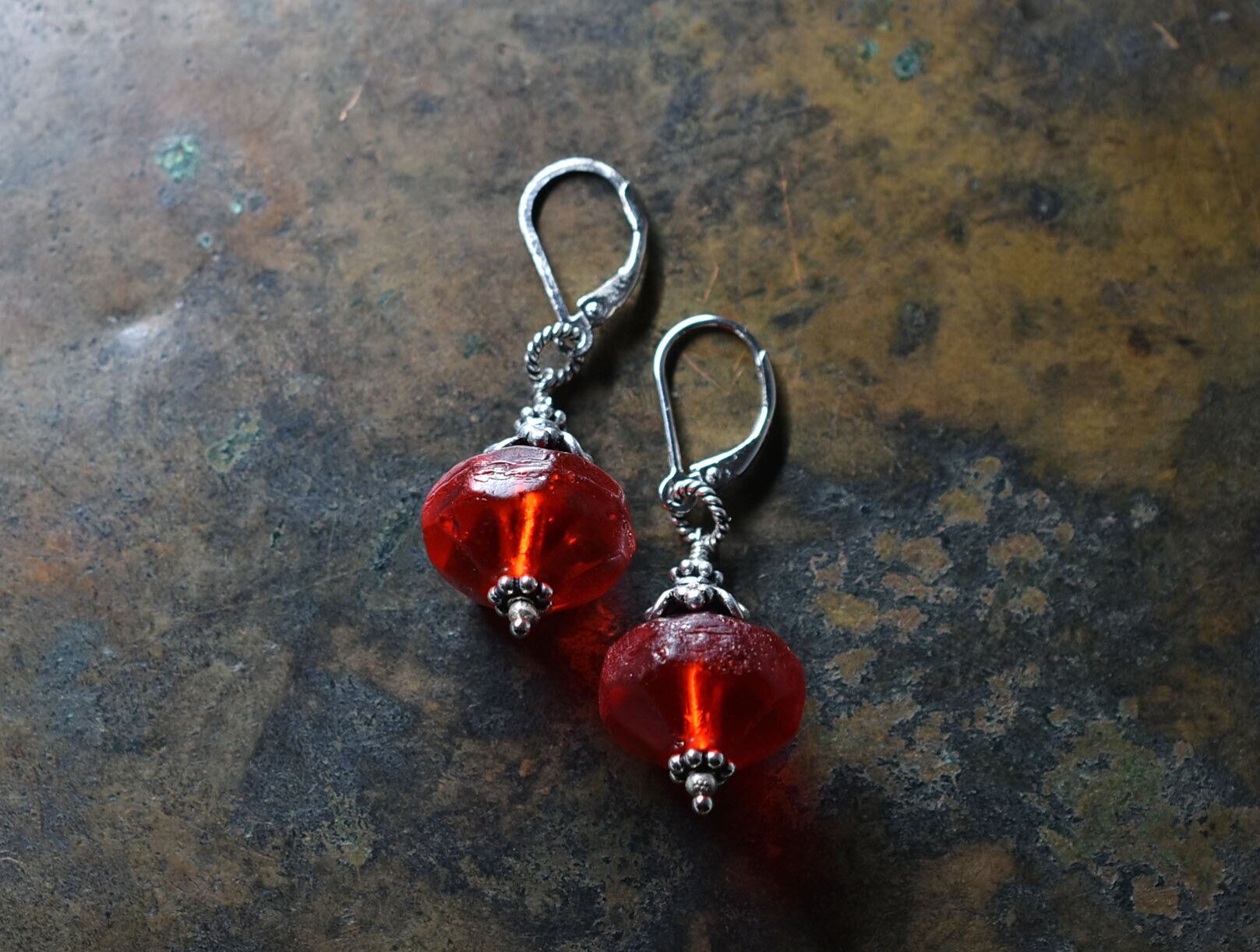 真っ赤な算盤型アンティークボヘミアビーズと隠しブルービーズのピアス