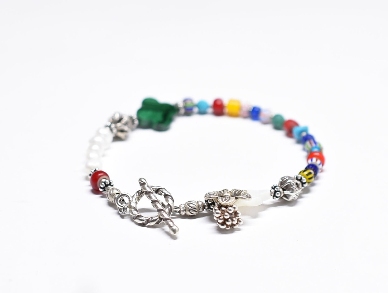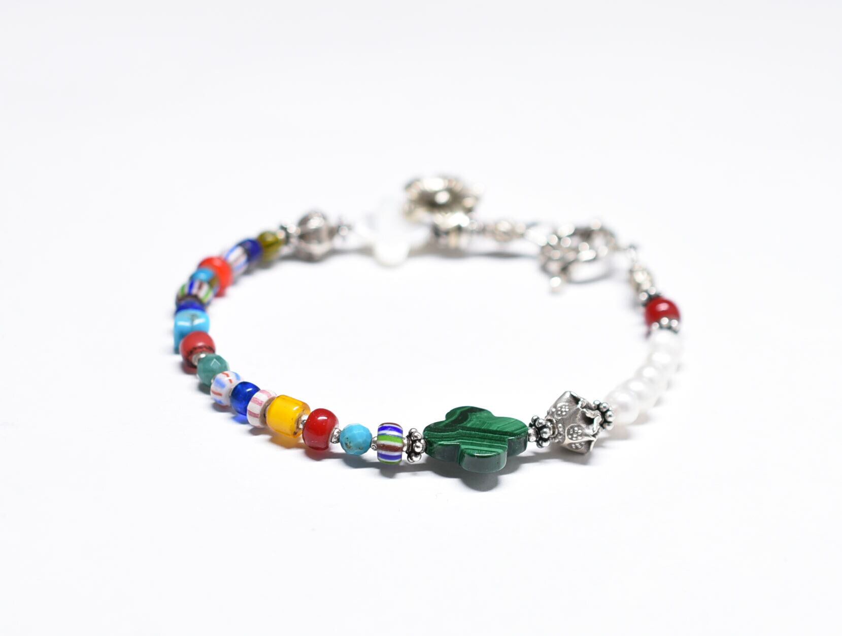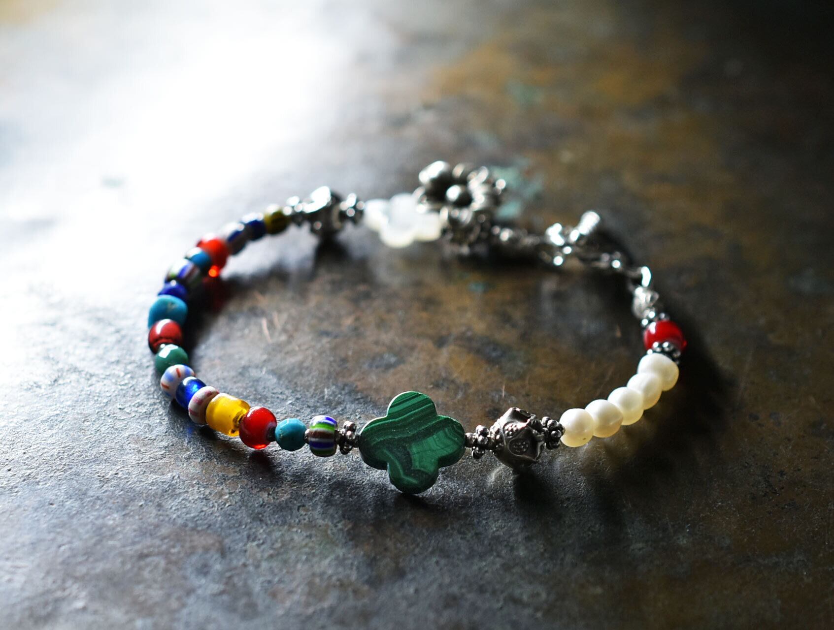 クロバーマラカイト&白蝶貝とパール、多彩ヴェネチアビーズ、カレンシルバーやターコイズなどを繋いだブレスです。