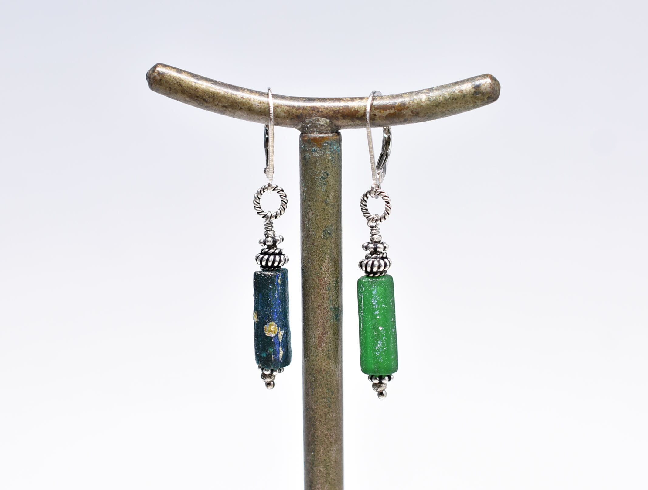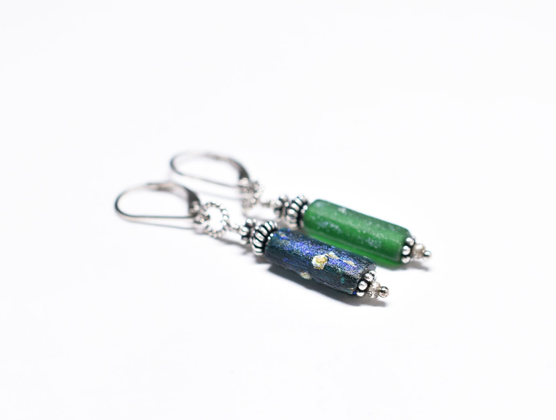 ブルーグリーン&グリーン銀化ローマングラスとシルバービーズのスリムなピアス