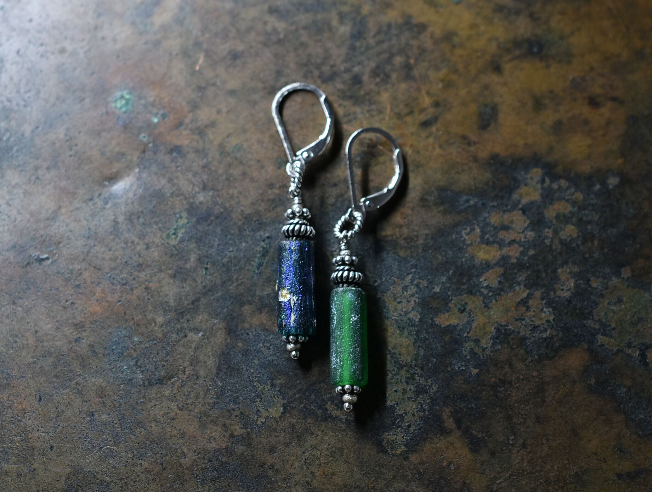 古代ガラスの輝きと、味わいのある質感を楽しめる、シュッとしたピアスです。