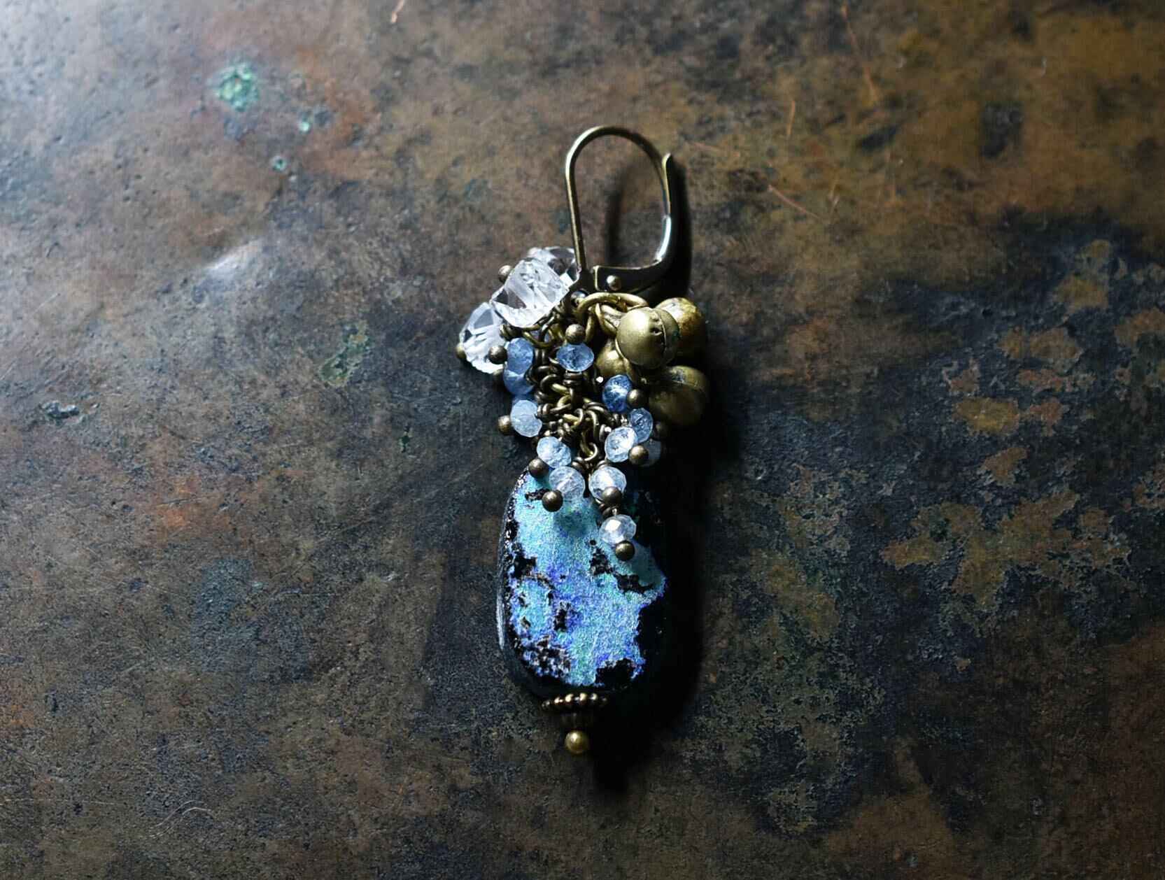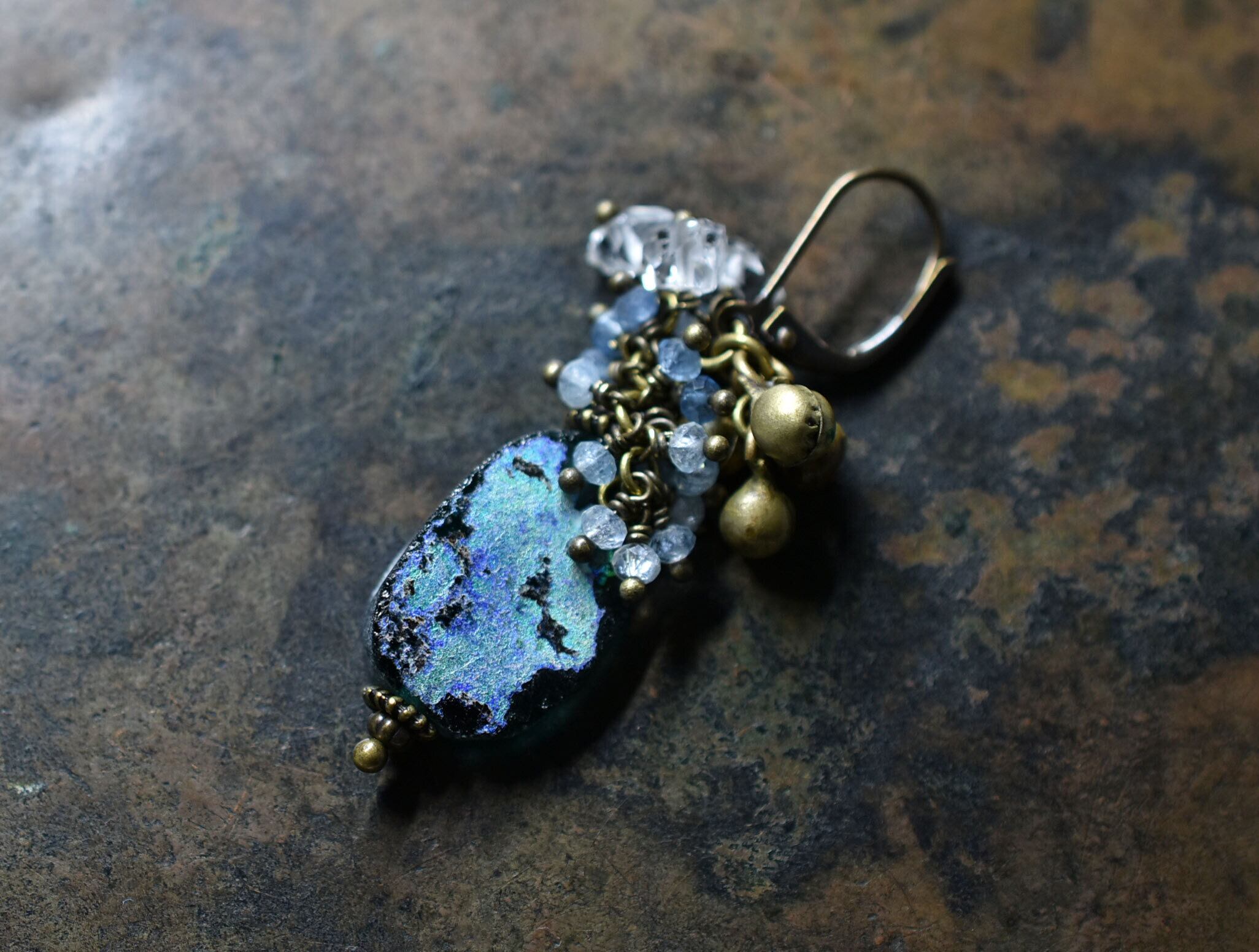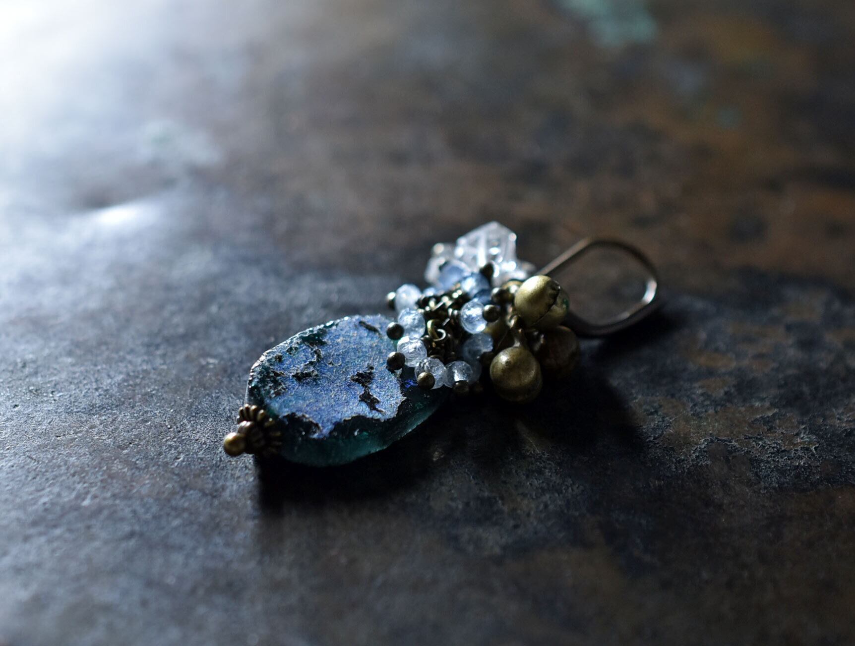 ブルーグリーン寒色系銀化ローマングラスとたわわなアパタイト、ハーキマーダイヤモンド、民族鈴を繋いだ片耳ピアスです。