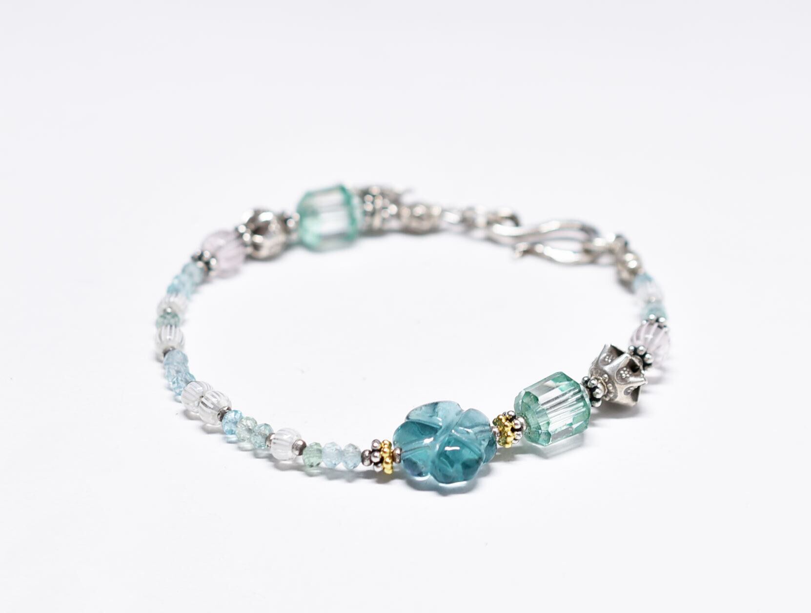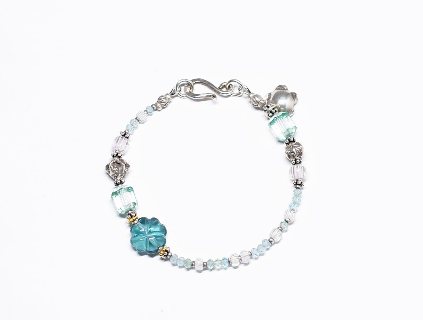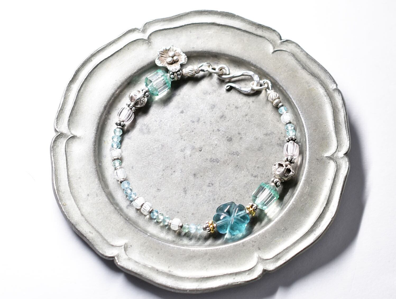 クローバーフローライトとクリア&オパールグリーンヴィンテージビーズ、グーズベリー、アパタイト、カレンシルバーを繋いだブレスです。