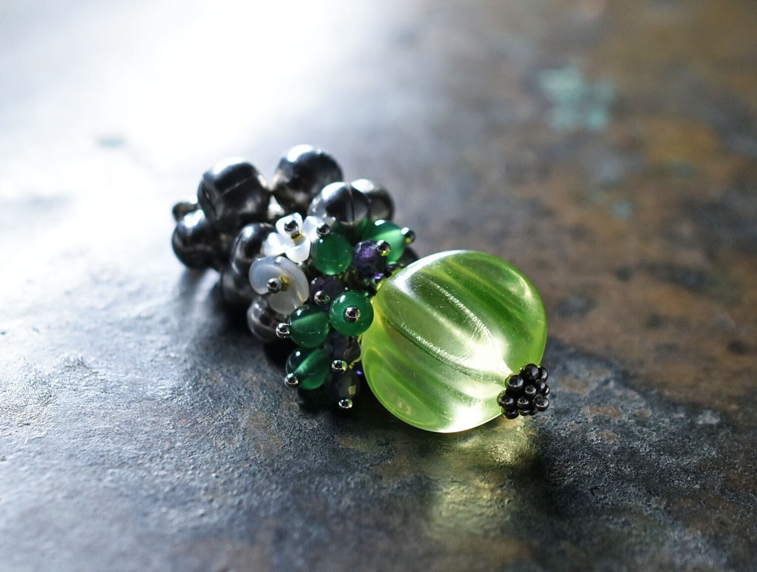ヴィンテージウランガラスとたわわな鈴、アメジスト&グリーン瑪瑙、白蝶貝の小花を繋いだペンダントトップです。