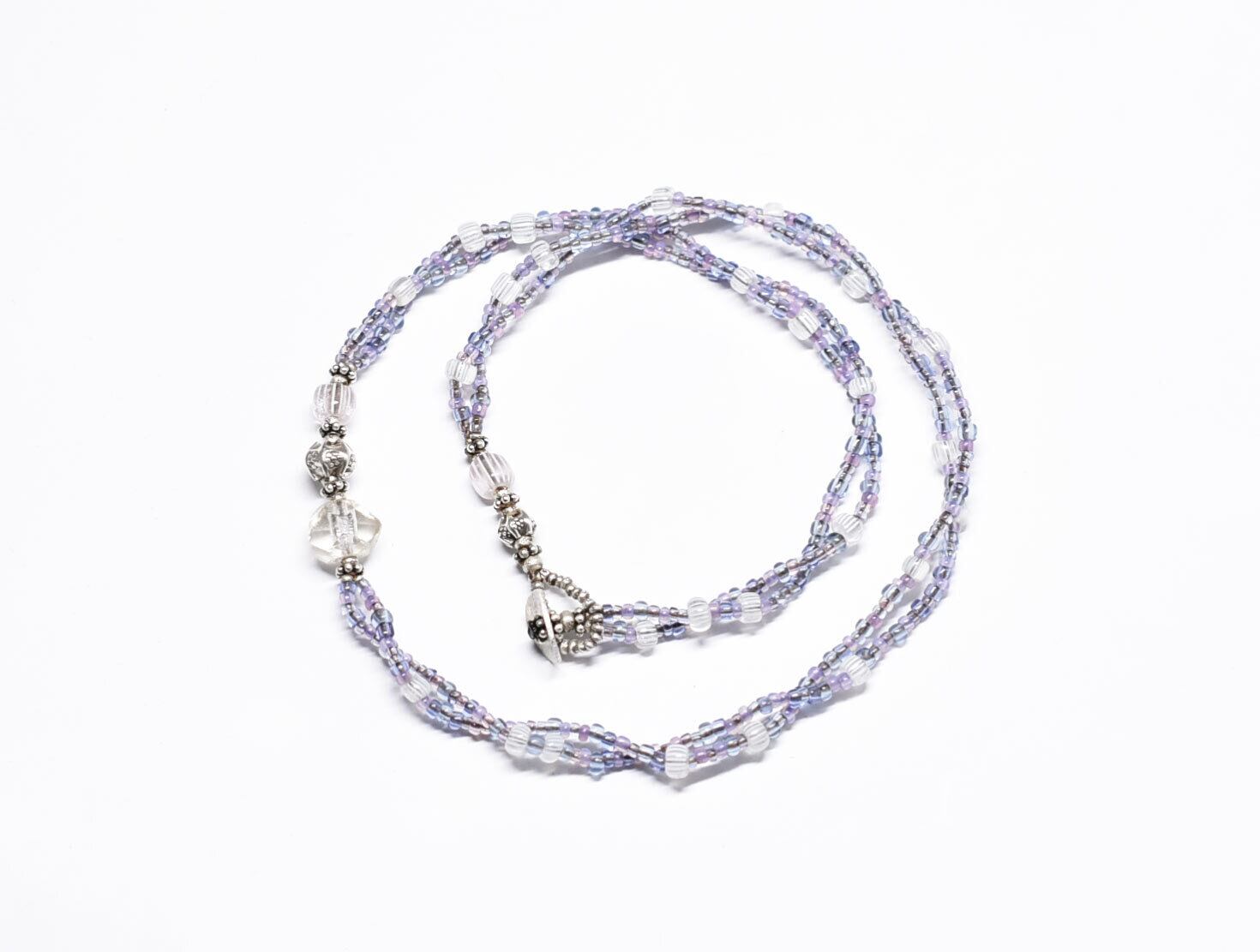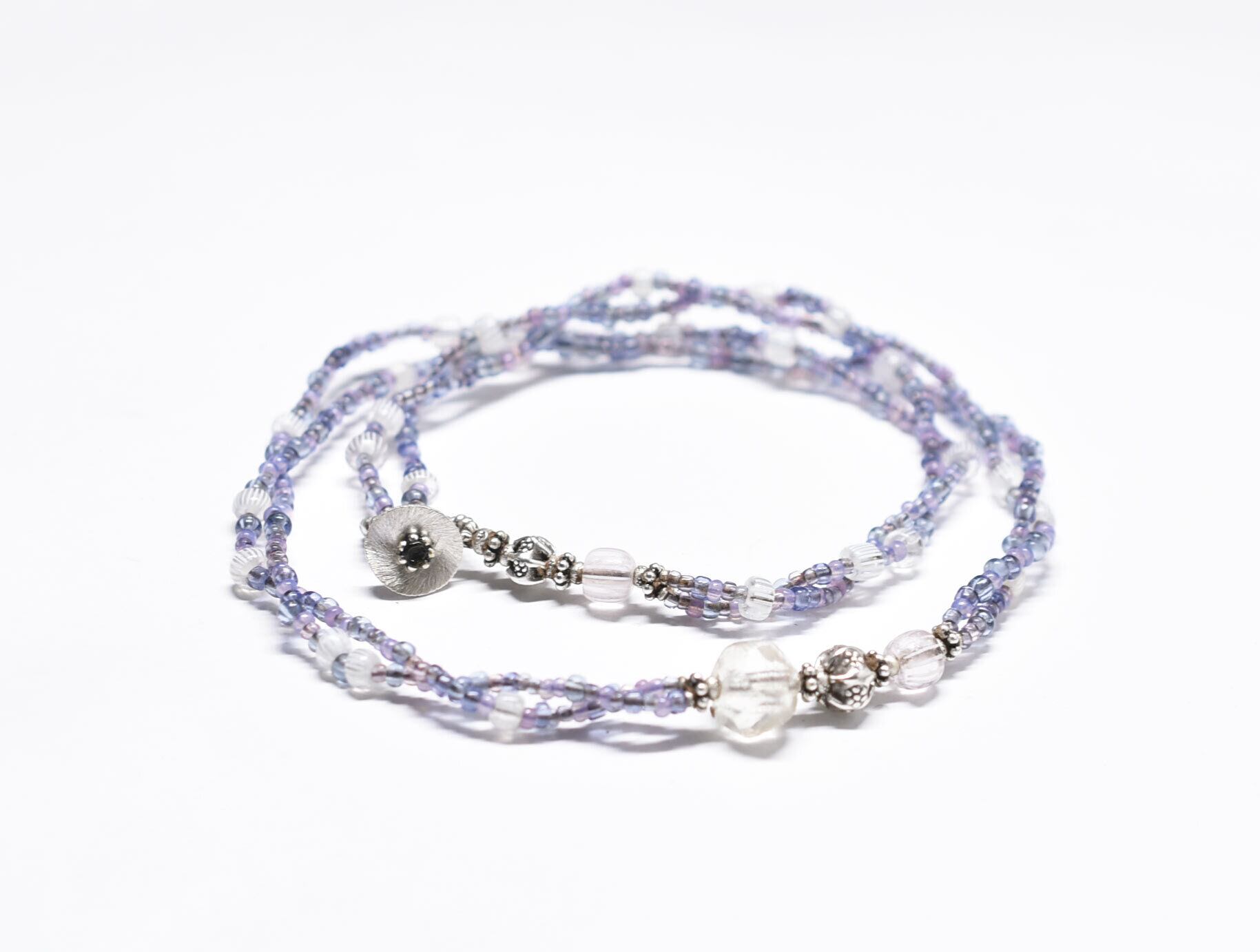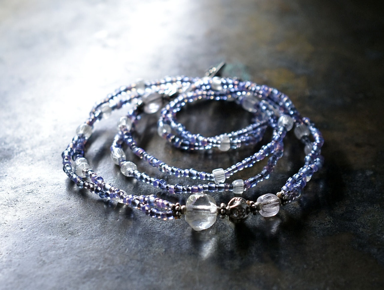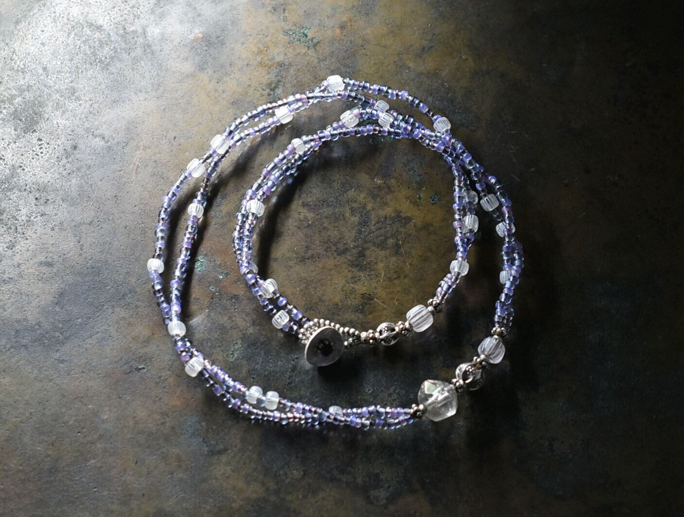 小さなパープルやピンクオパール、青藤色のビーズはフランスのヴィンテージビーズです。