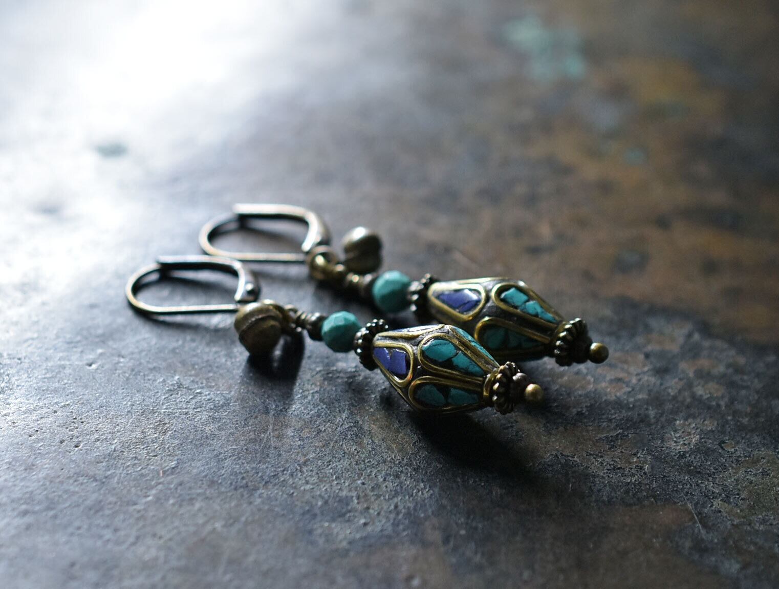 ラピス&ターコイズ象嵌ビーズとターコイズ、民族鈴のピアス