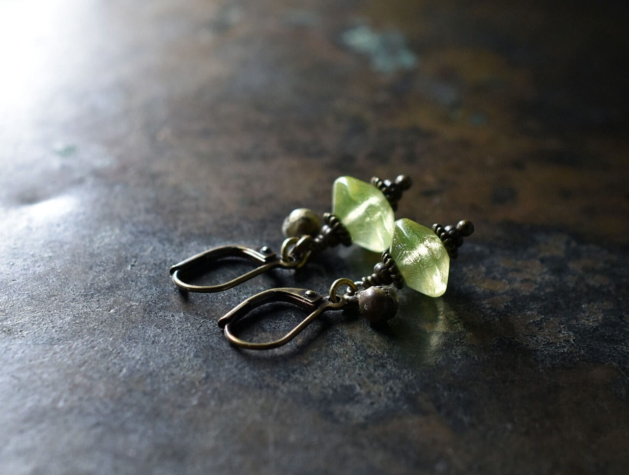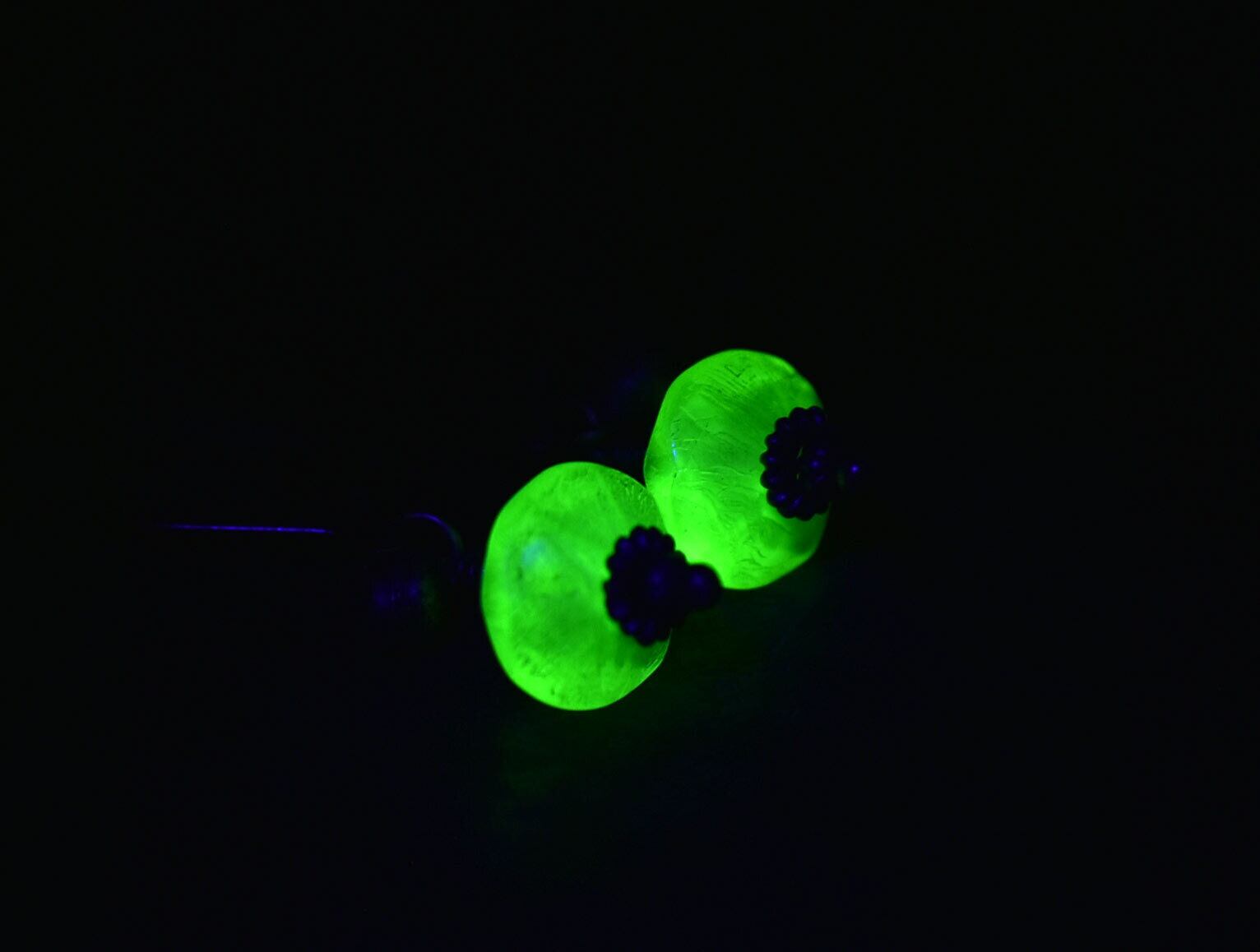 独特なセミクリアグリーンのビーズは、極々微量のウランで発色させています。ブラックライトを当てると光ります!