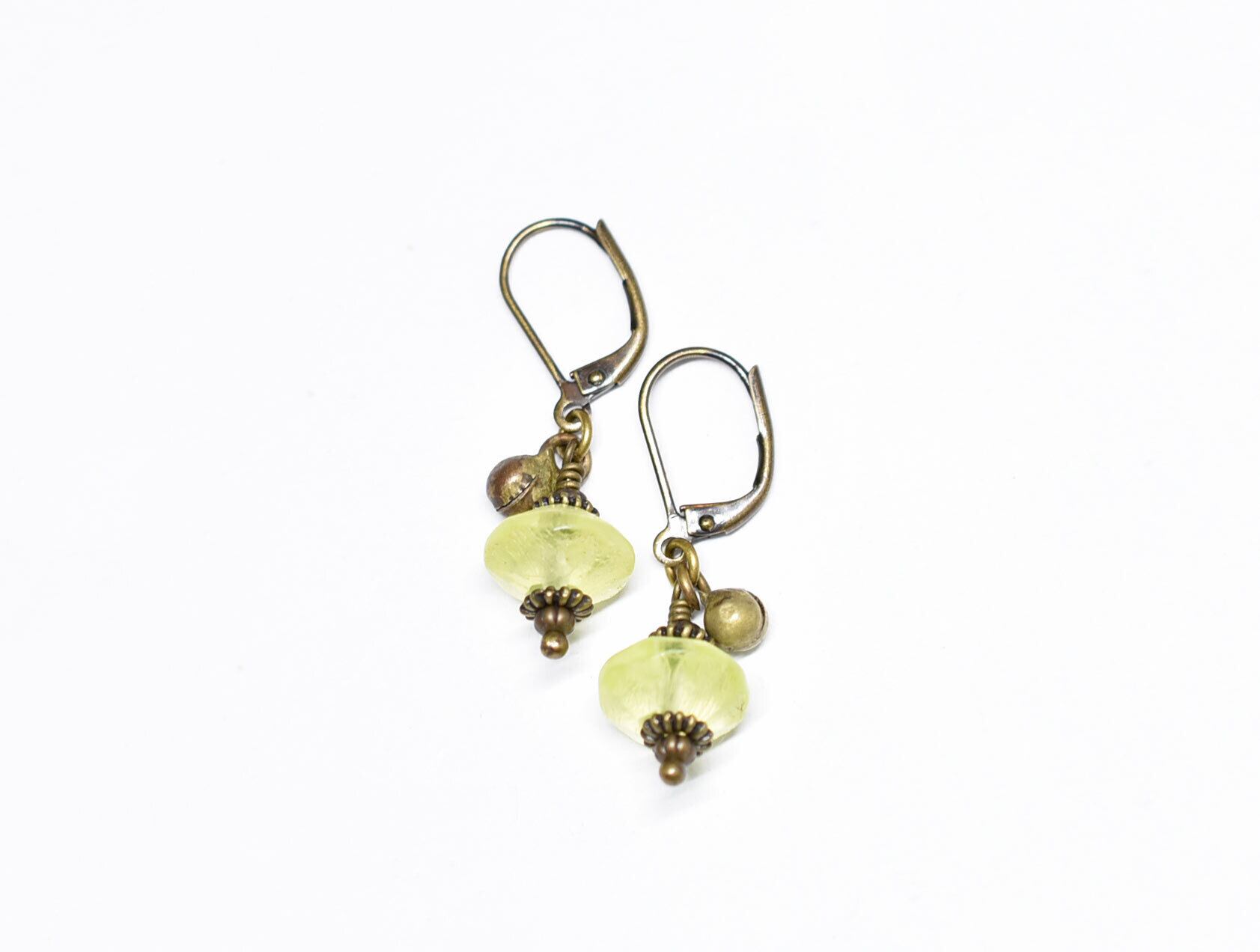 算盤型アンティークウランガラスと、民族鈴を繋いだピアスです。