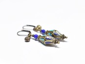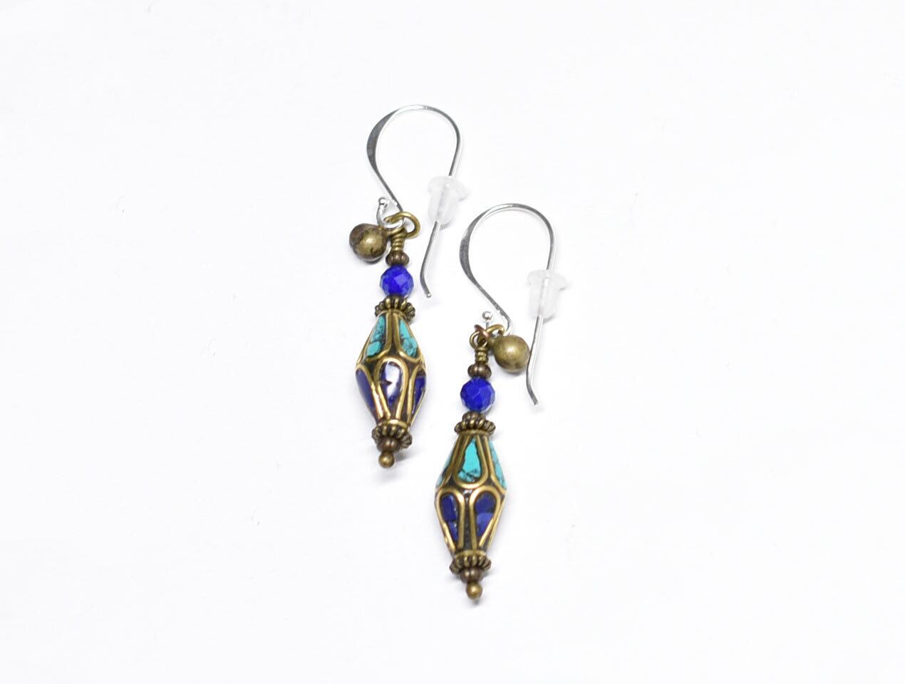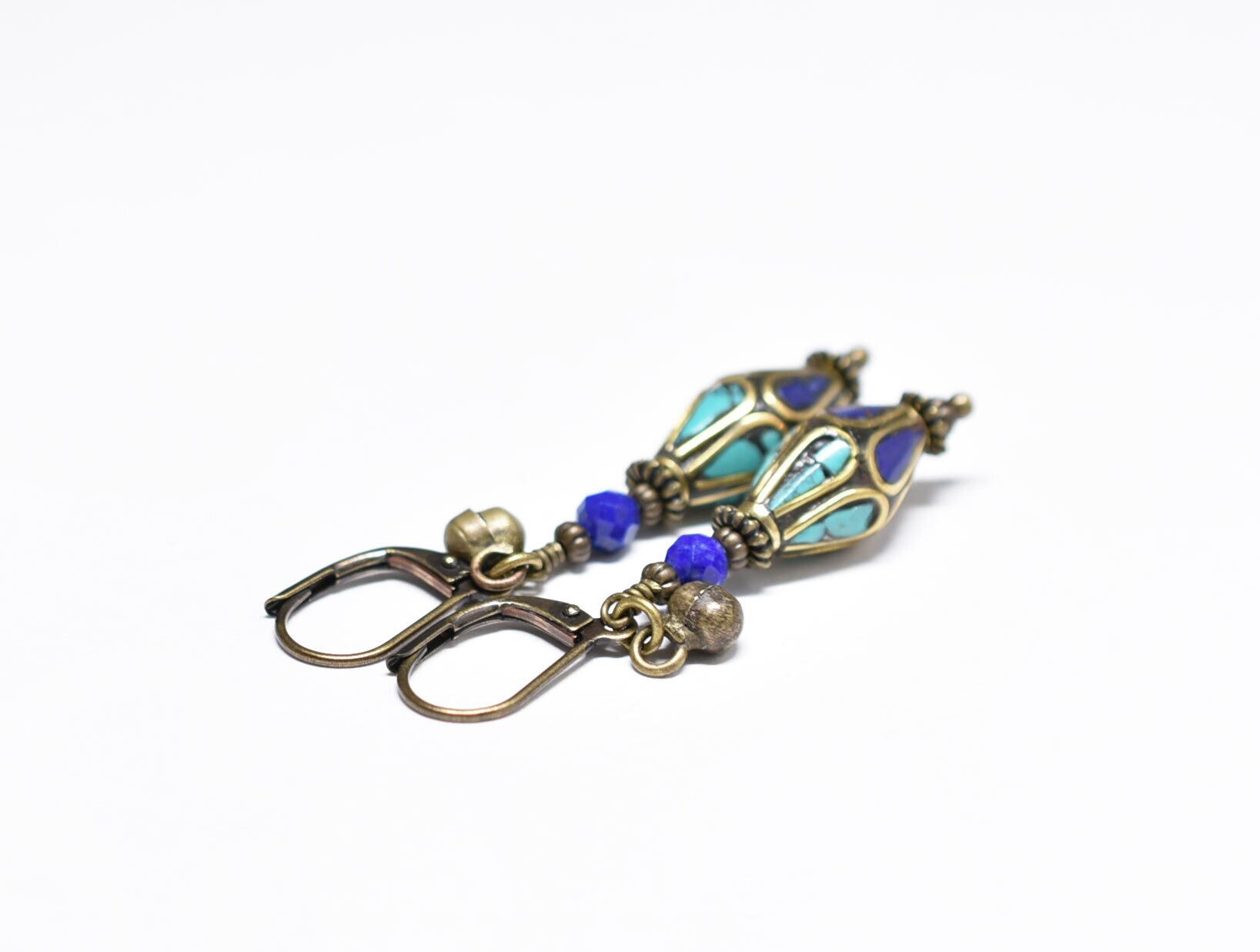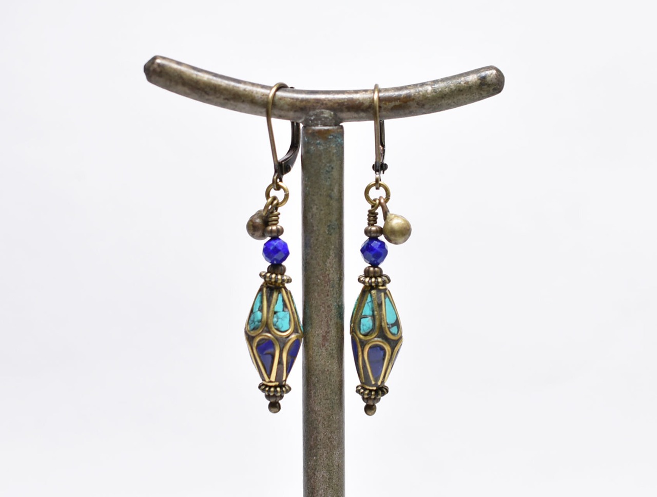 ラピス&ターコイズ象嵌ビーズとラピス、民族鈴を繋いだピアスです。