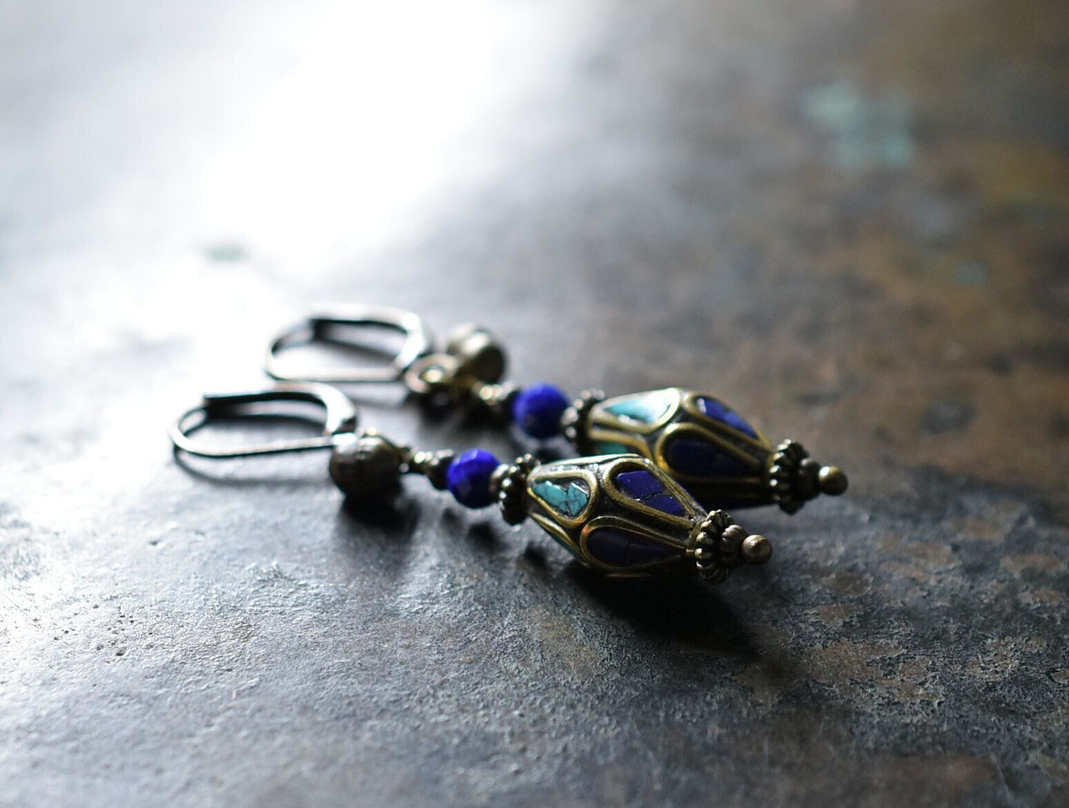 素材:ラピスとターコイズの象嵌ビーズ、ラピス、ミックスメタル、真鍮