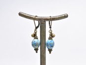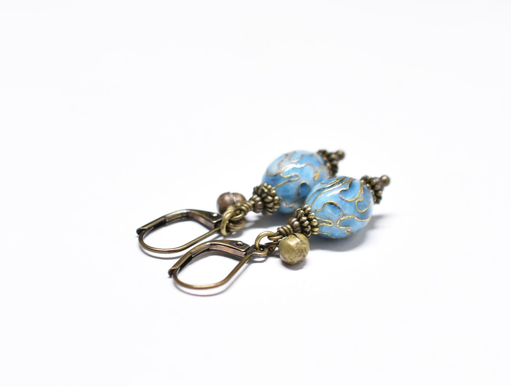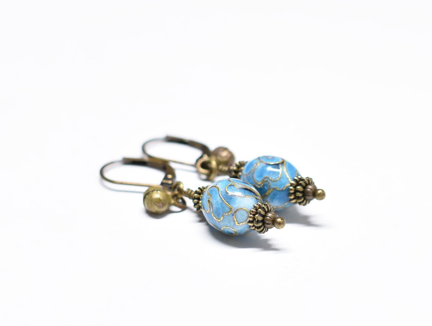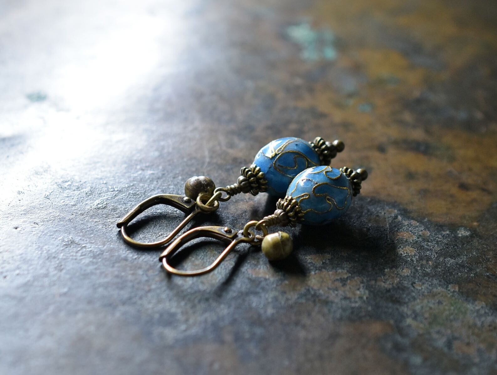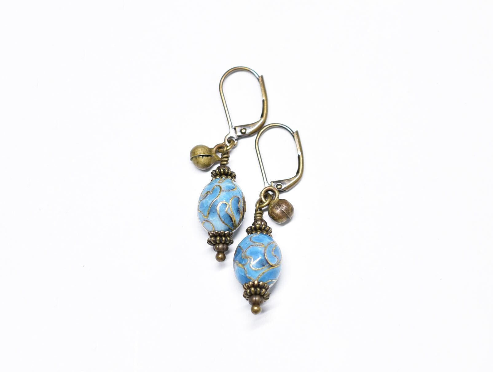 露草色中国七宝焼きと民族鈴を繋いだピアスです。