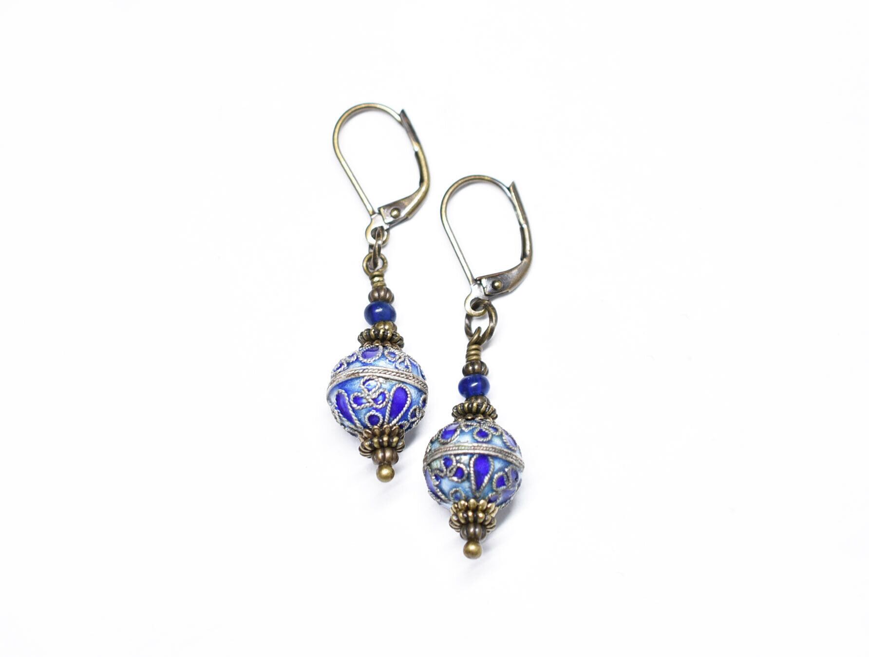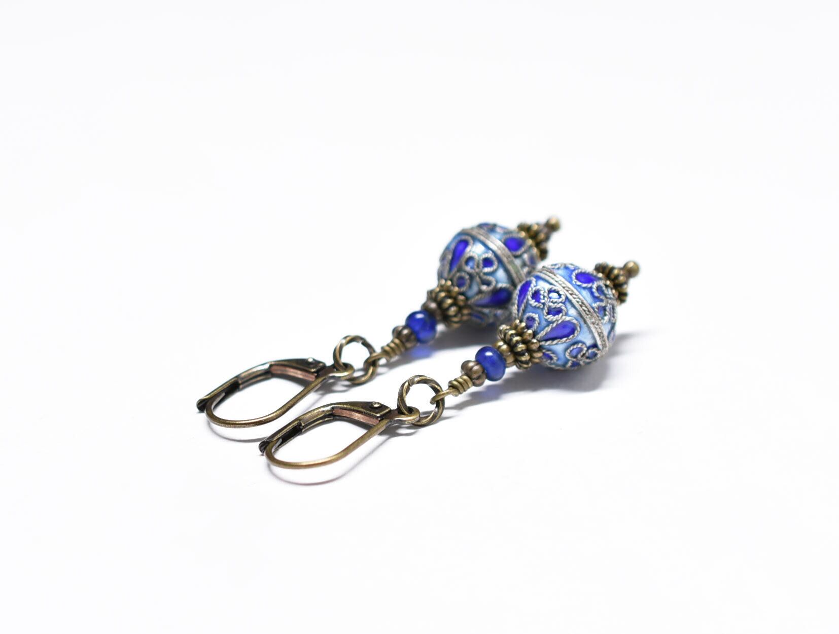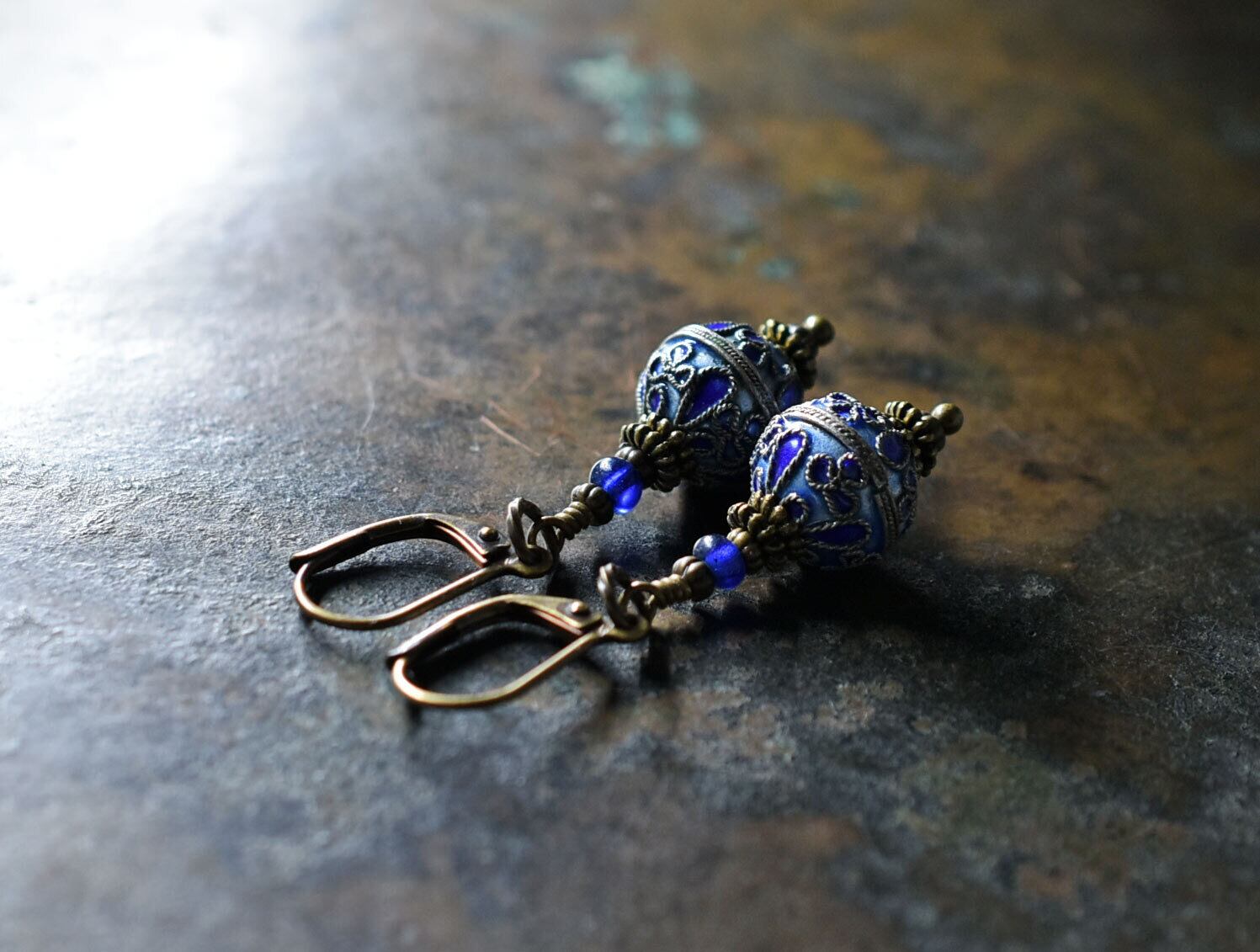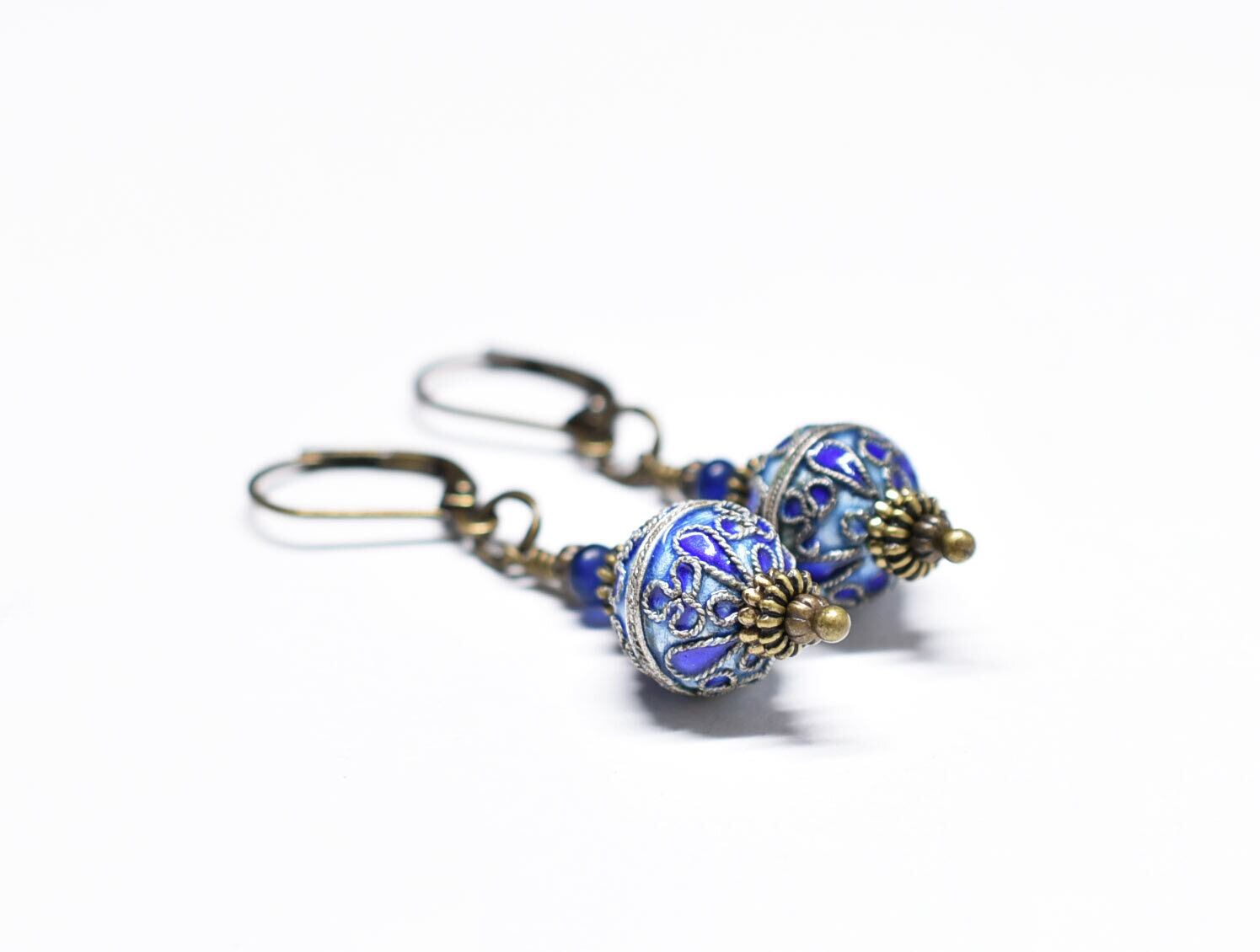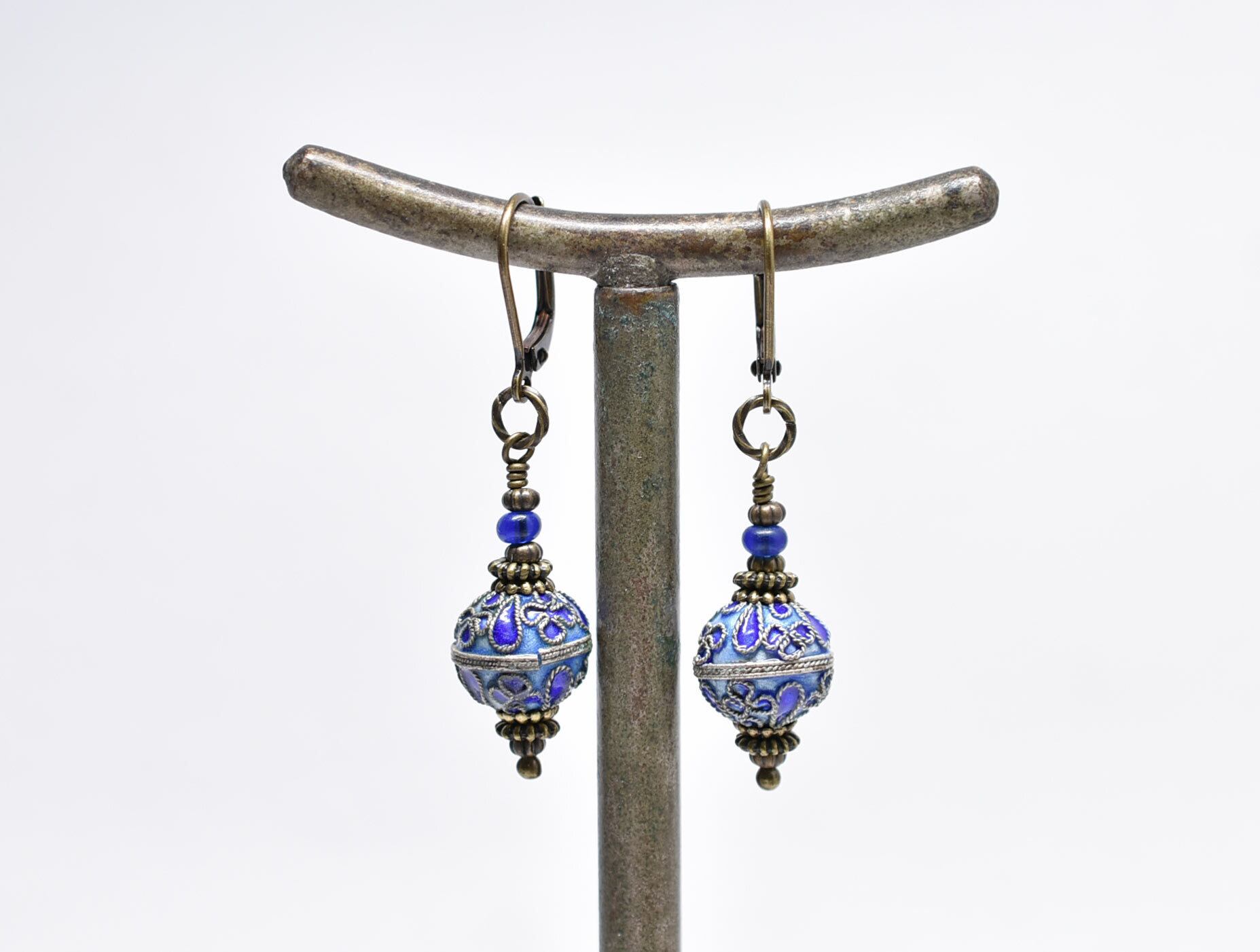 瑠璃色&水色中国七宝焼きとブルーアンティークビーズのピアス