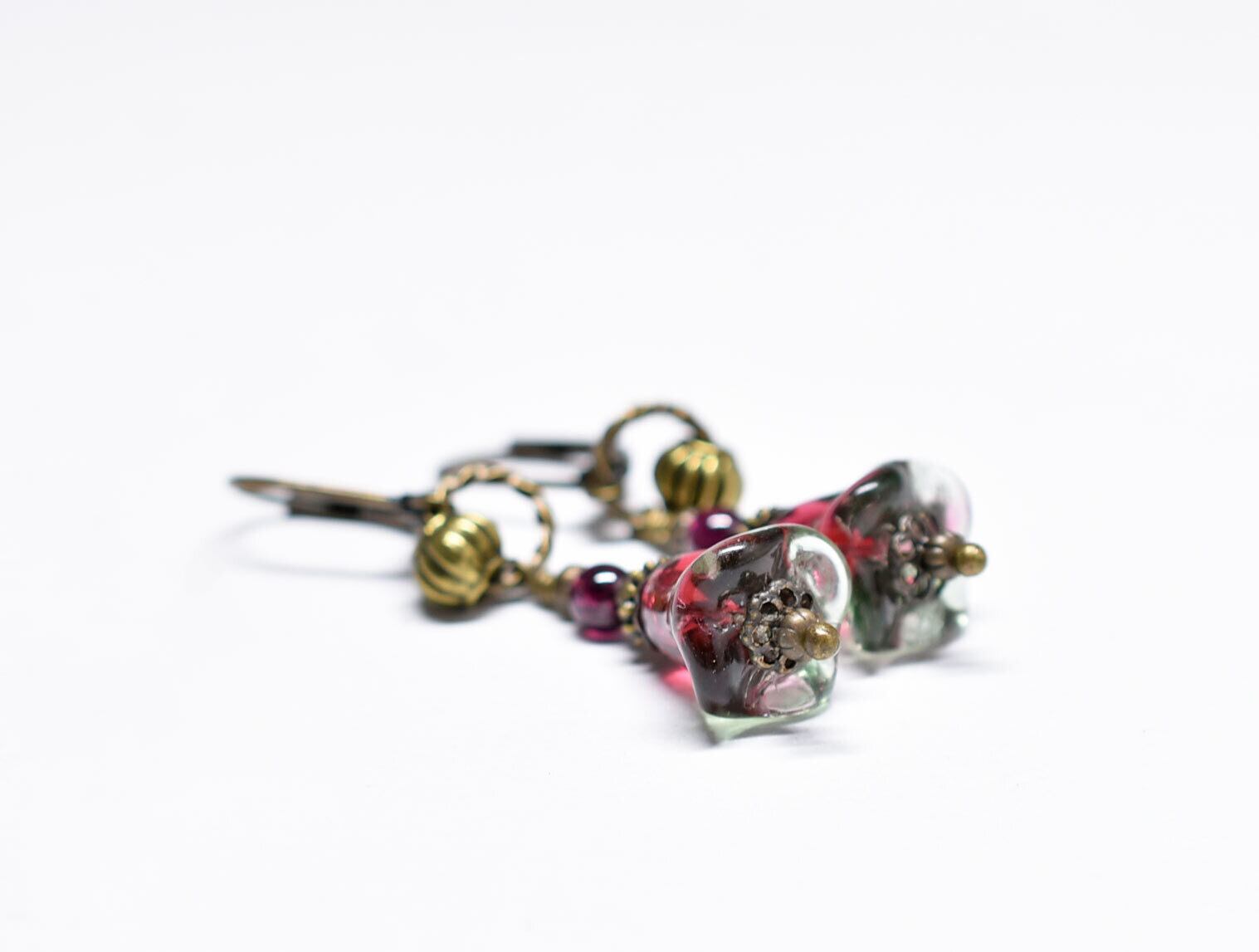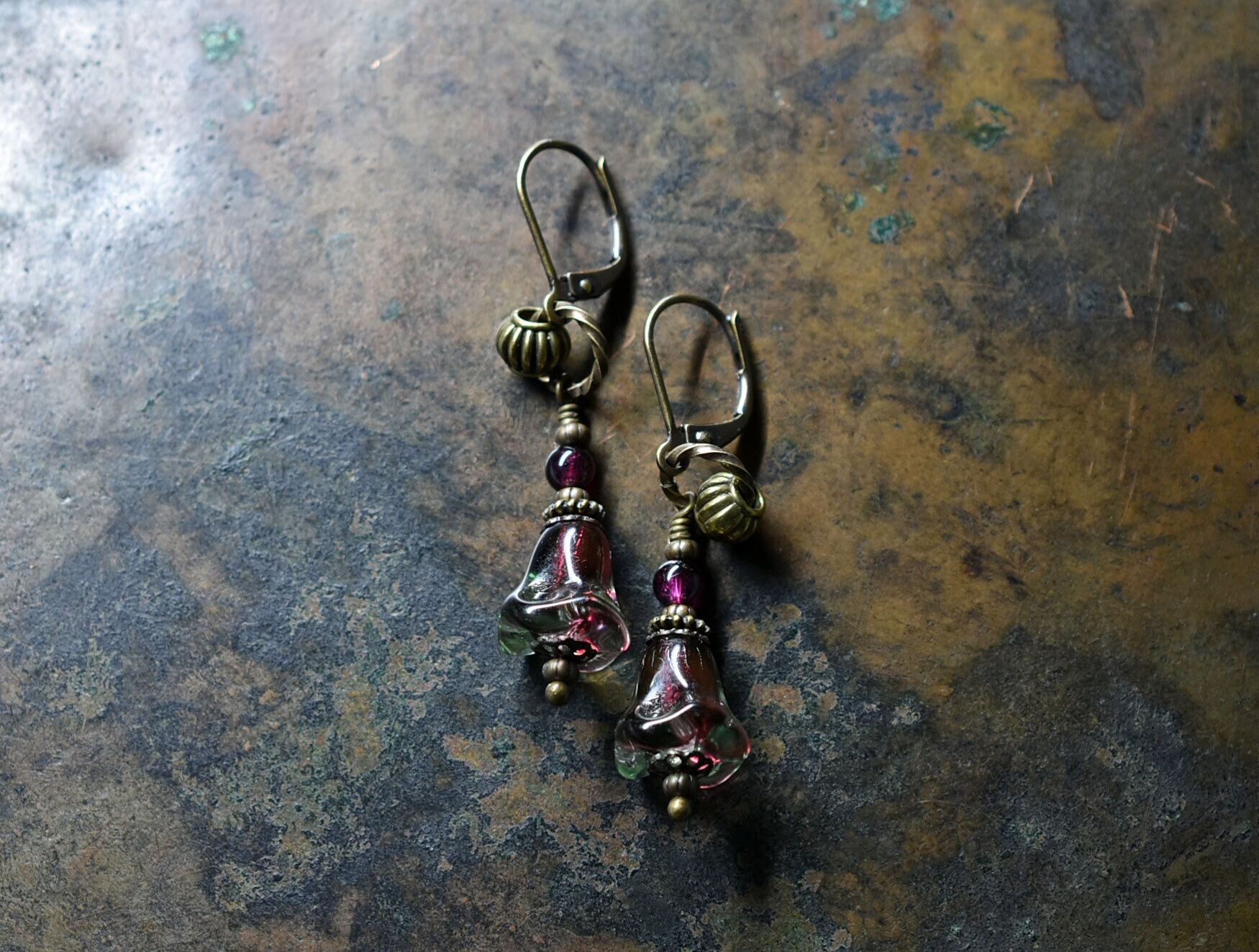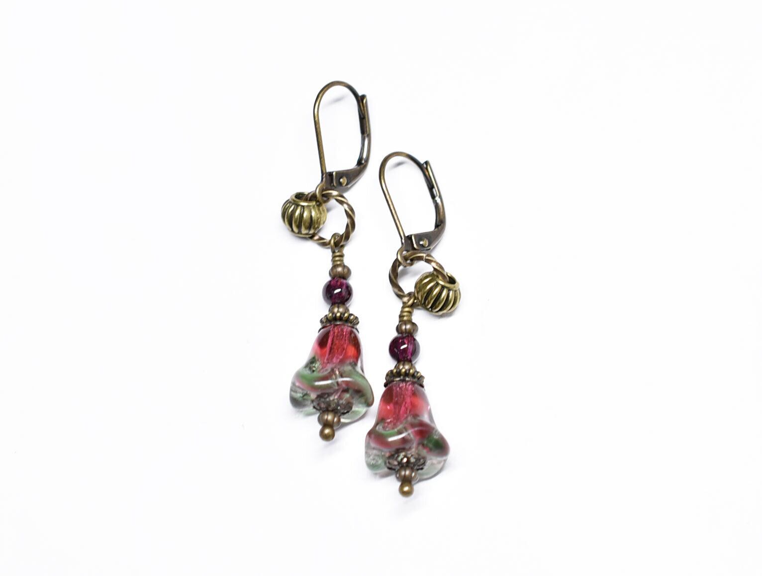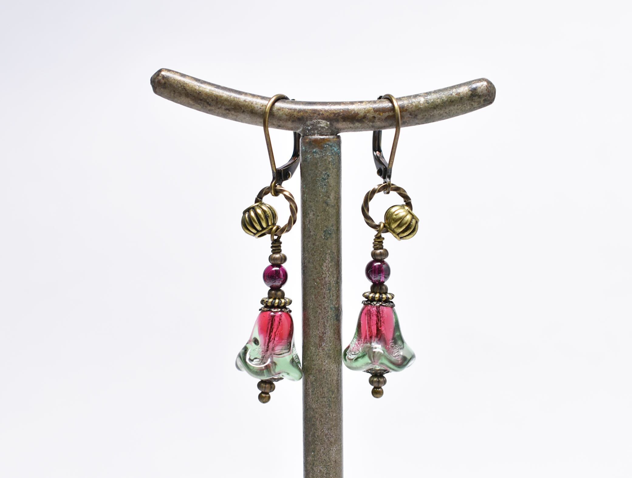 エンジェルトランペットの様なドイツヴィンテージビーズとガーネットなどを繋いだピアスです。
