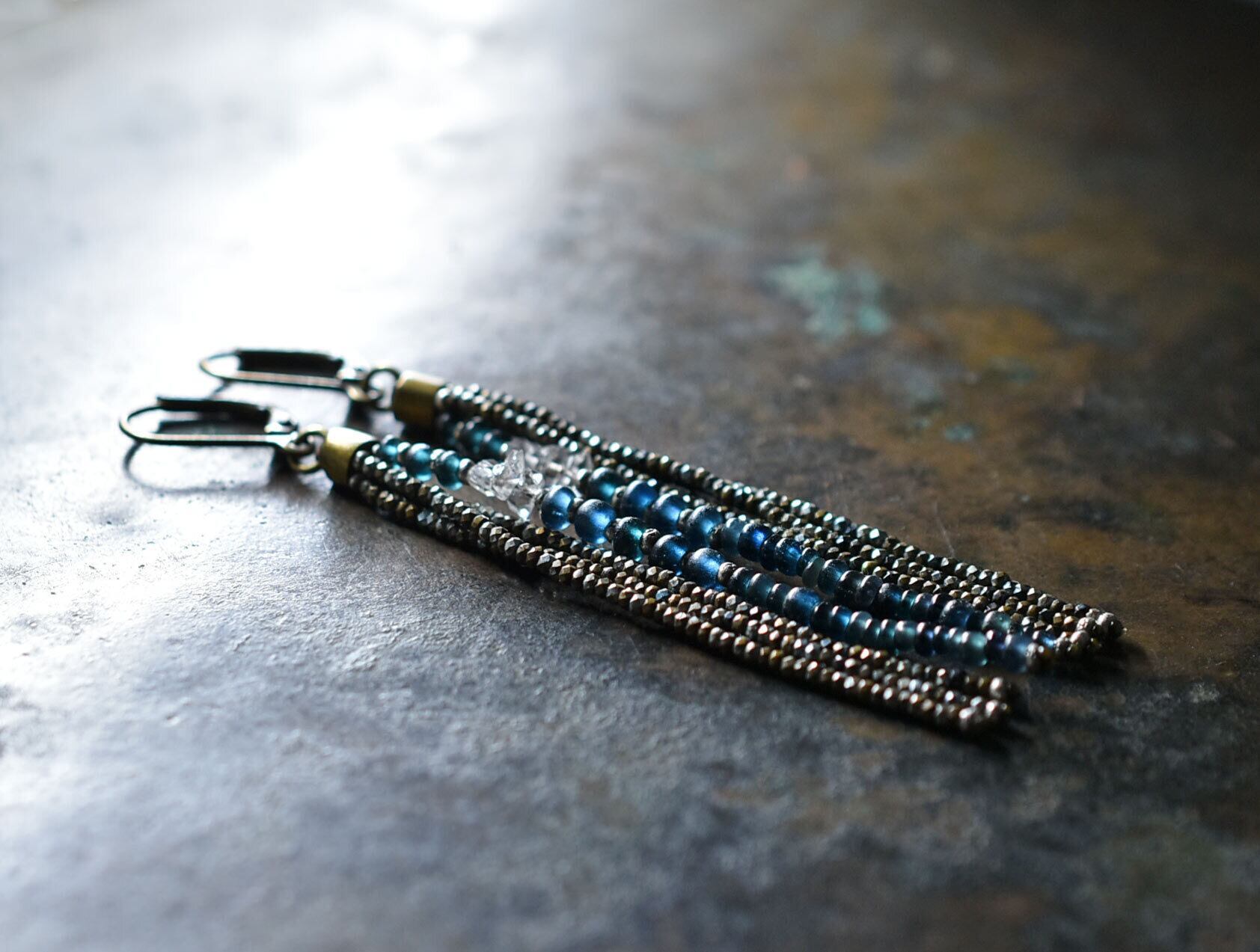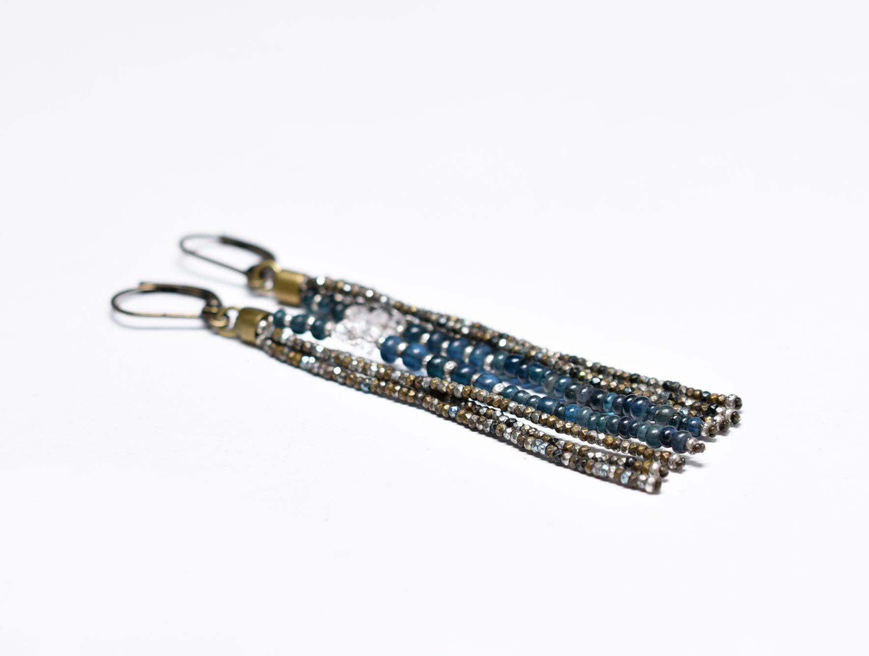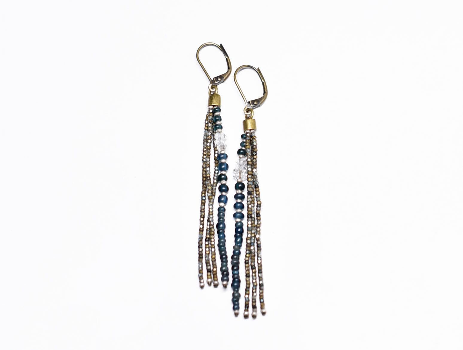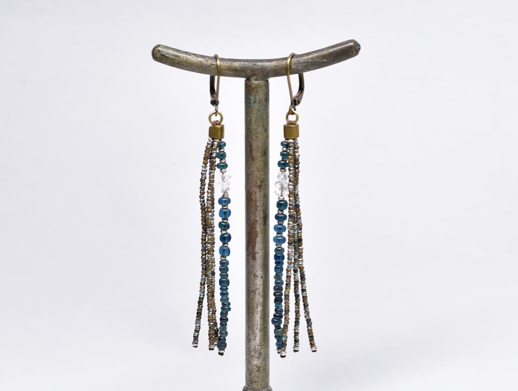 フランスアンティークカットメタルビーズとインディゴブルーアンティークビーズ、ハーキマーダイヤモンドを繋いだ4連のピアスです。