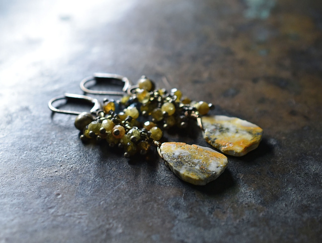カットが施された小さなラブラドライトをたわわに実らせました。黄色みがかったものなどシックな色合いのラブラドライトです。