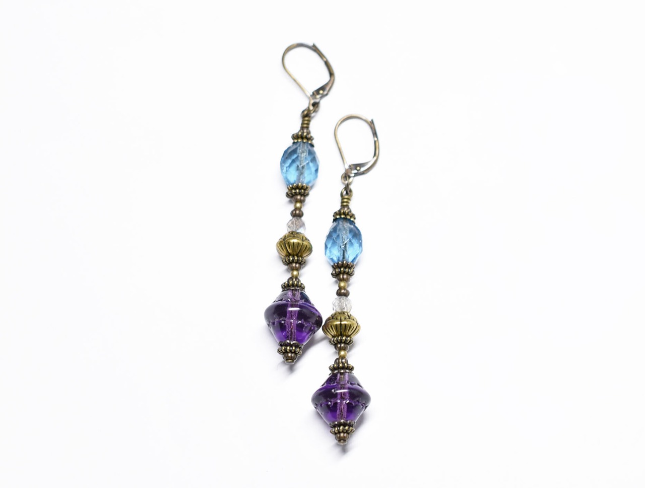 パープルドイツヴィンテージビーズとデニムブルーアンティークボヘミアビーズ、蓮華ブラス、ラブラドライトのピアス