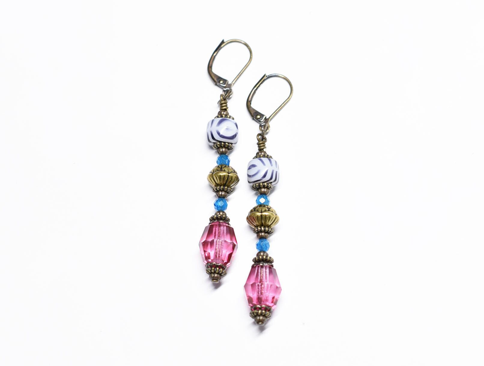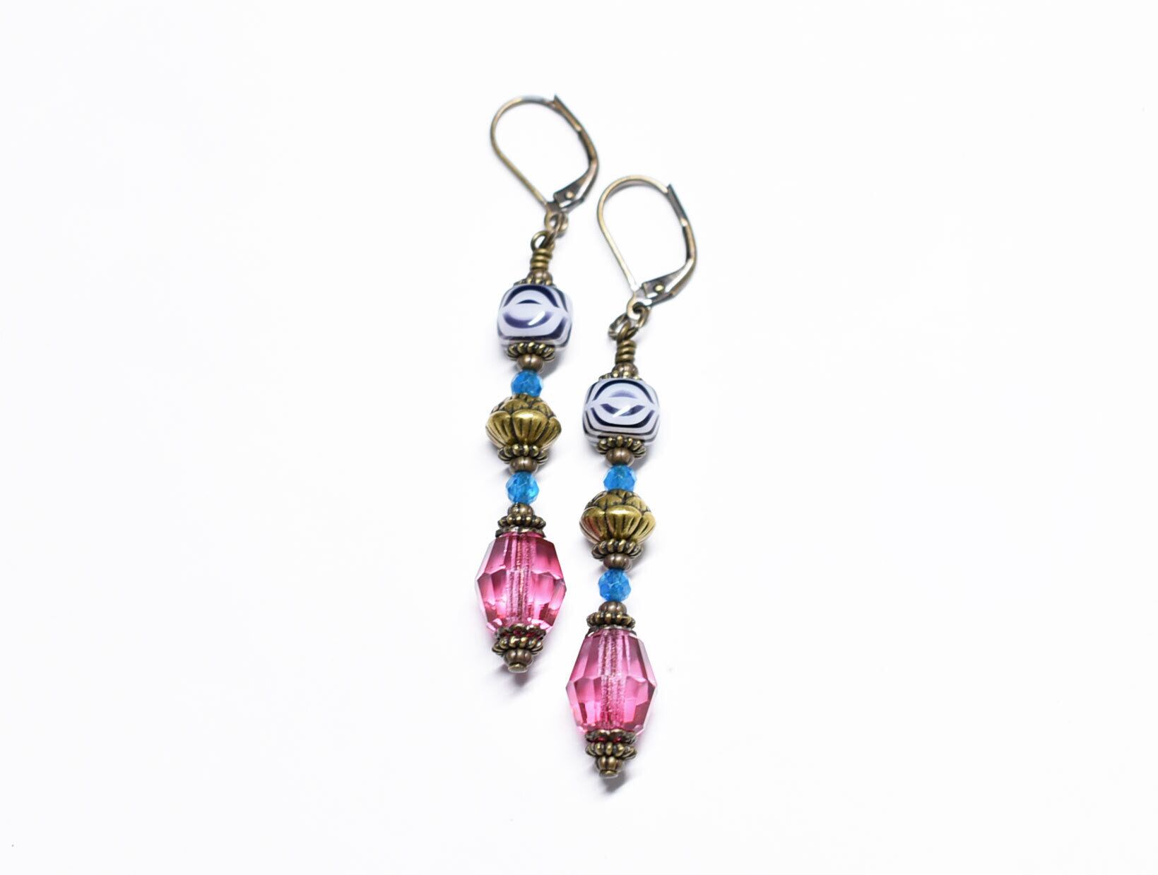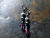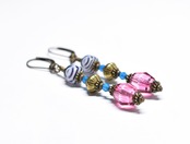 ラズベリーカラードイツヴィンテージとゼブラ柄ヴィンテージビーズ、蓮華ブラス、アパタイトのピアス