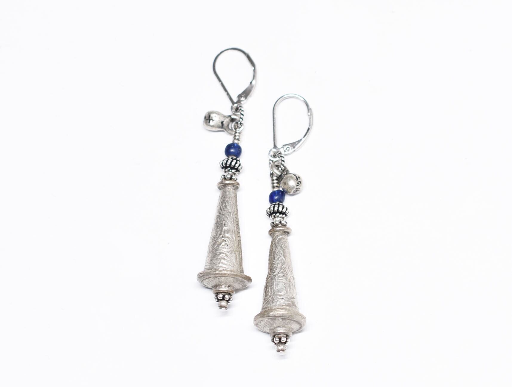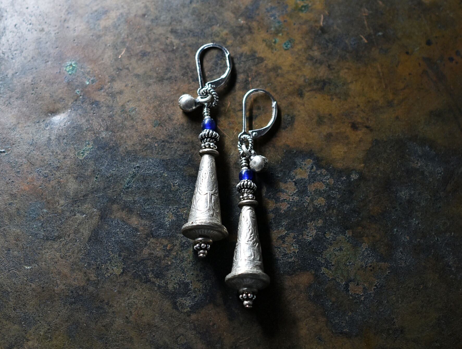 oldアフガンメタルとブルーアンティークビーズ、インドシルバー鈴のピアス
