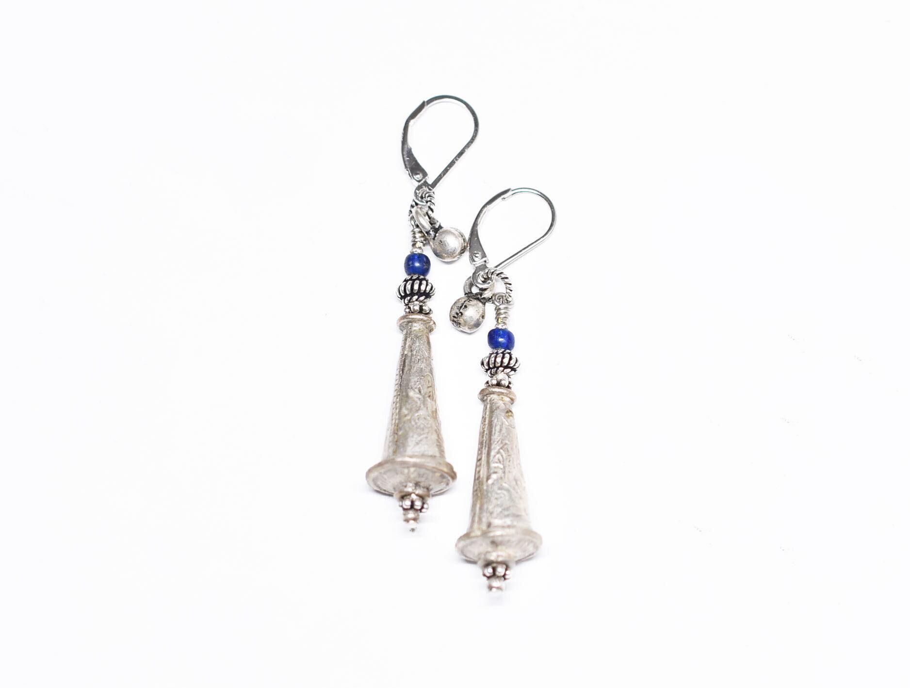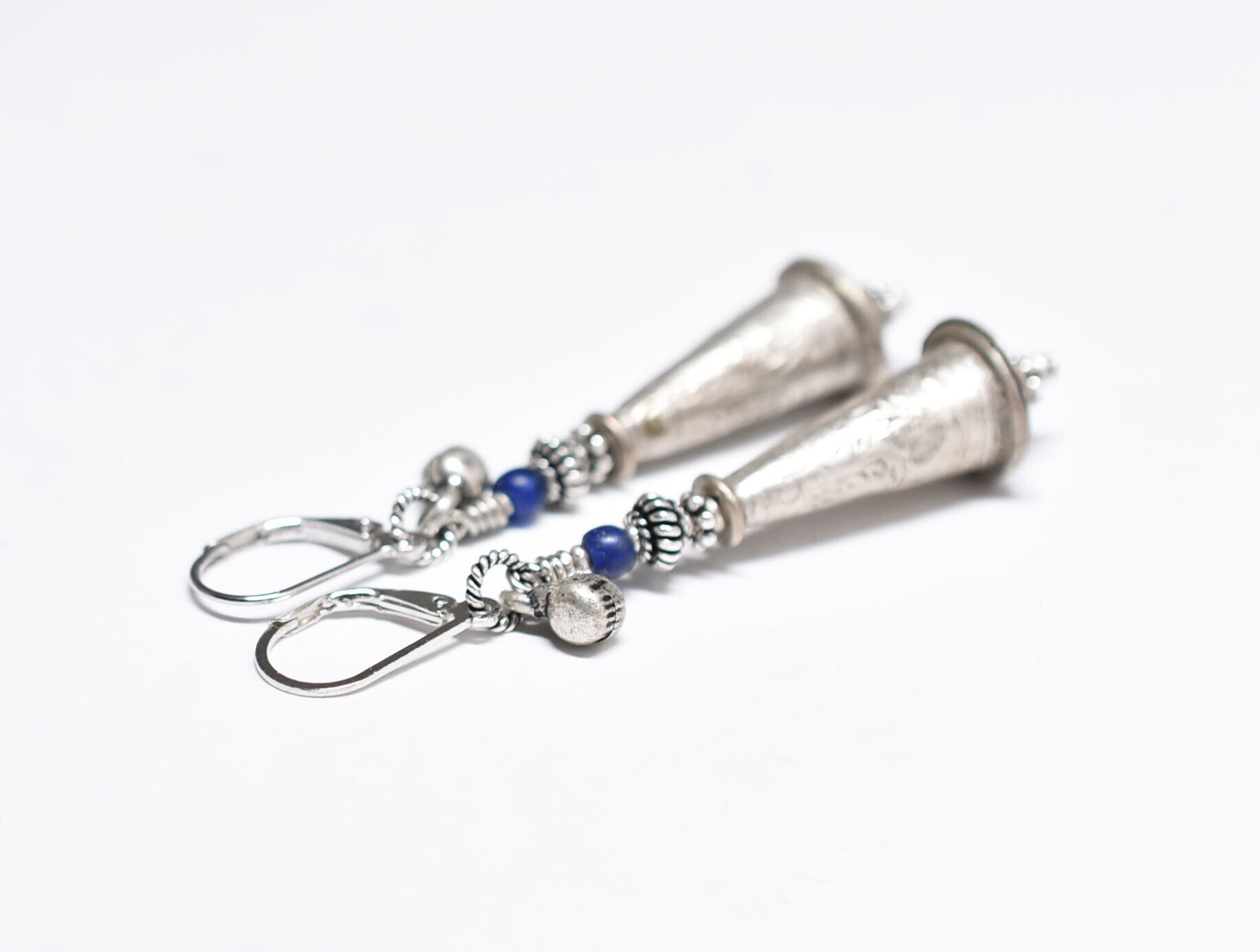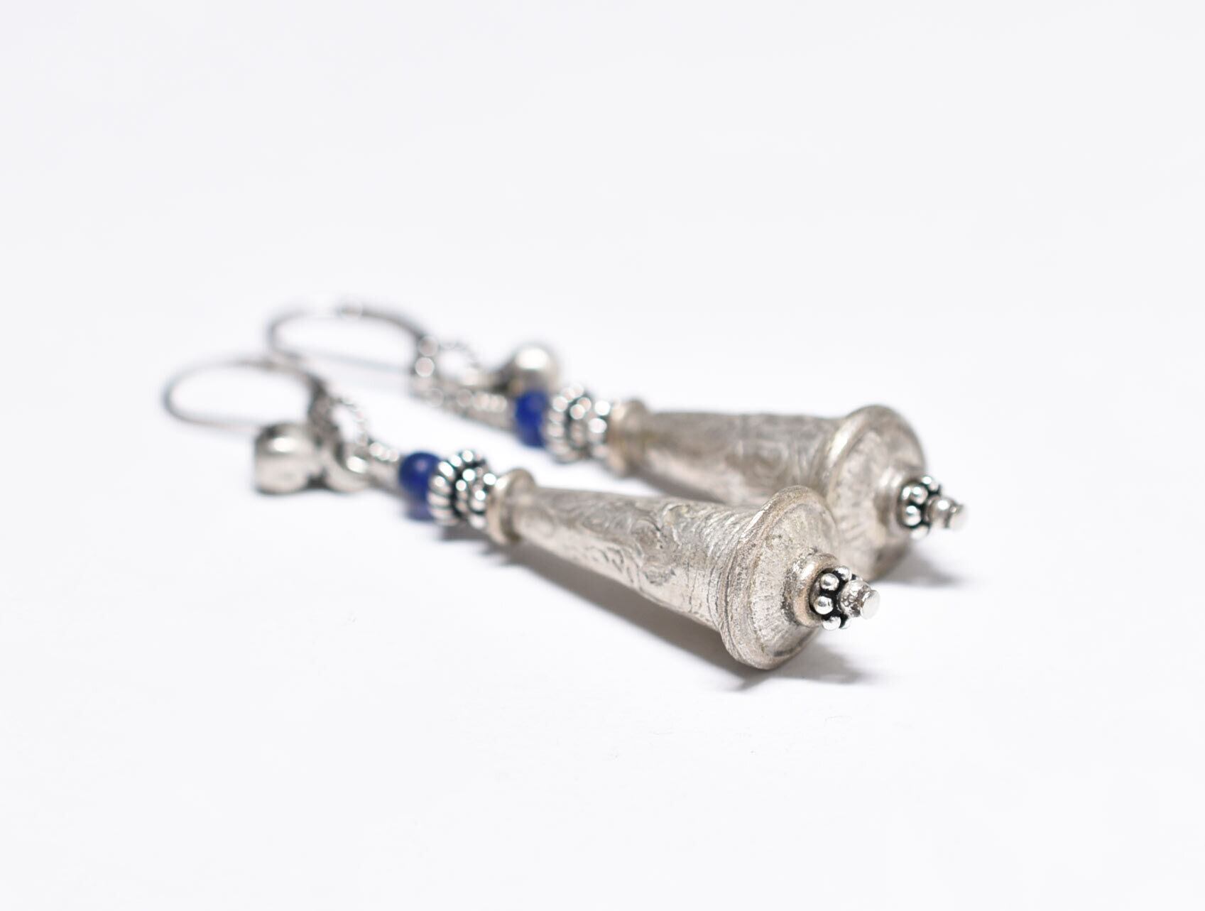 oldアフガンメタルとブルーアンティークビーズ、インドシルバー鈴を繋いだピアスです。