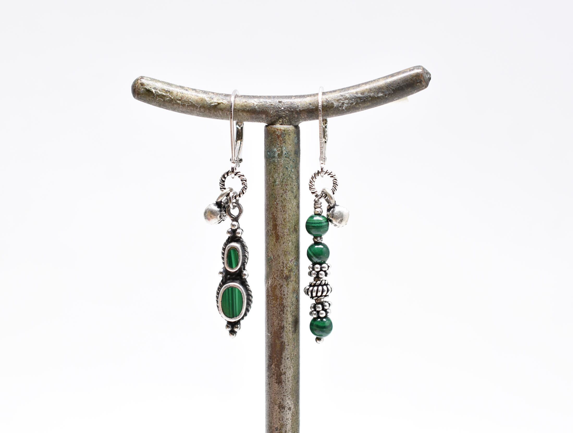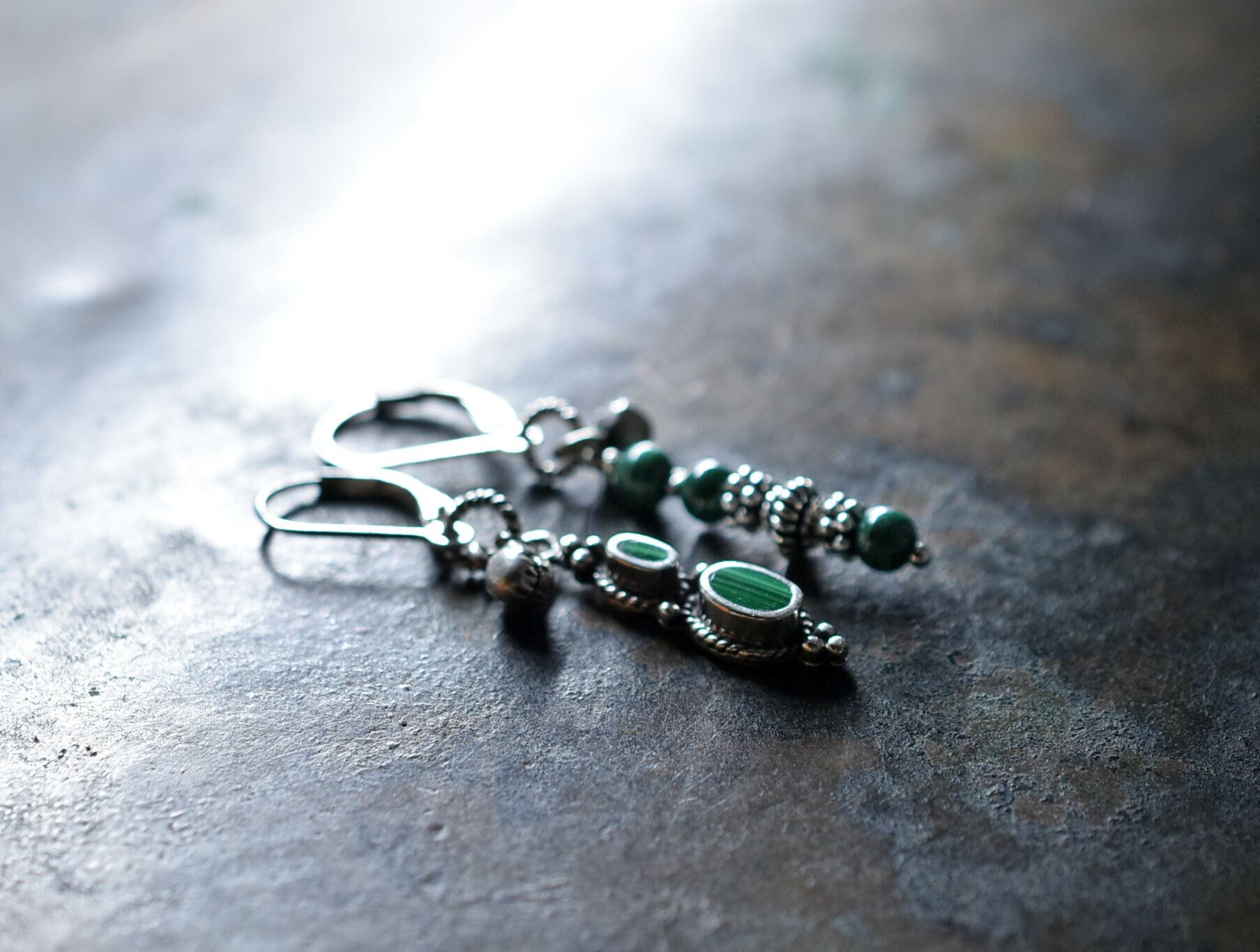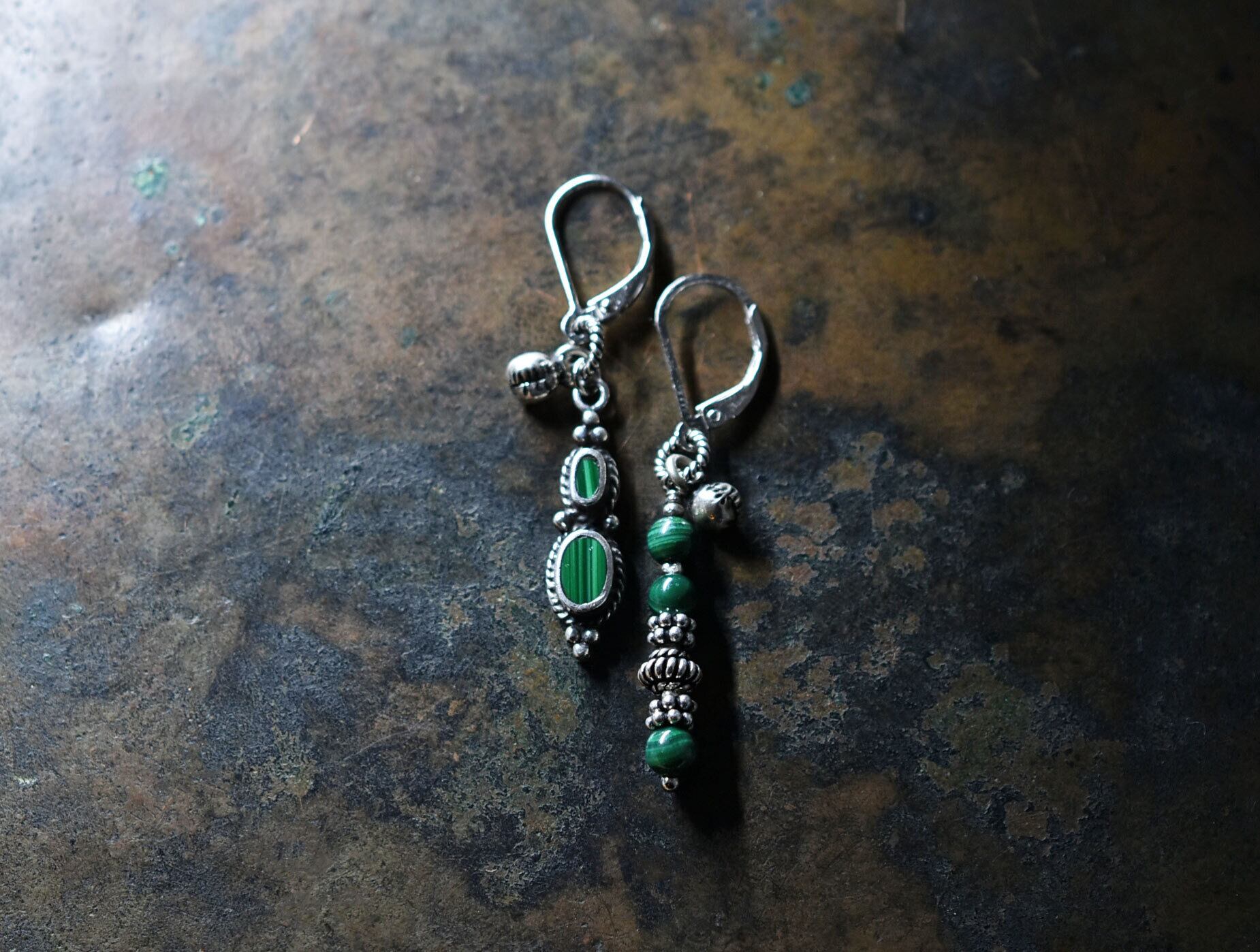片方はまん丸なマラカイトと、ハンドメイドで作られたシルバービーズを合わせました。