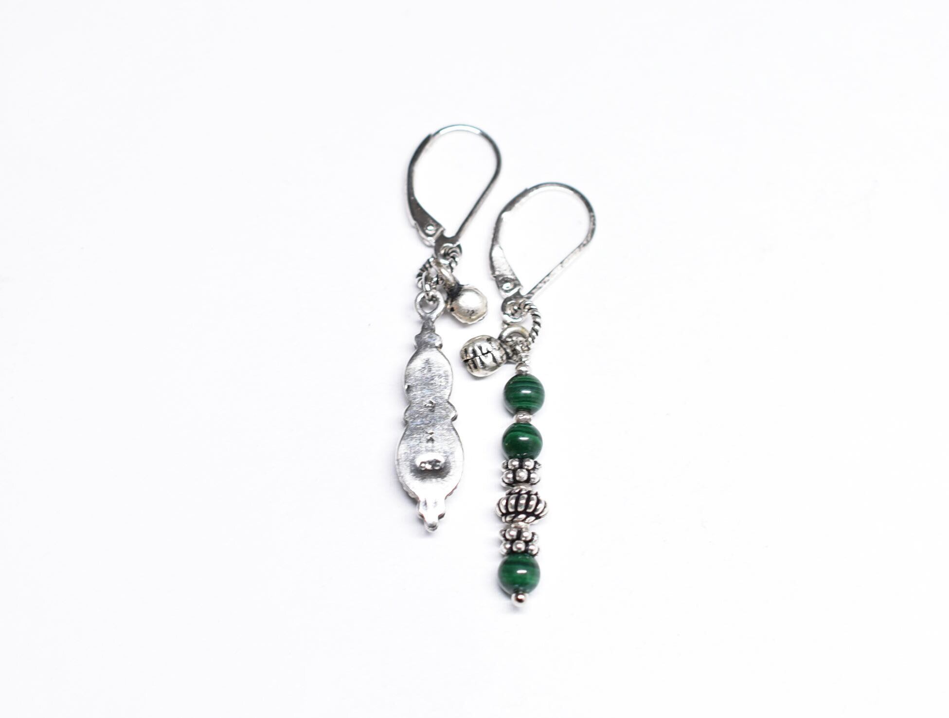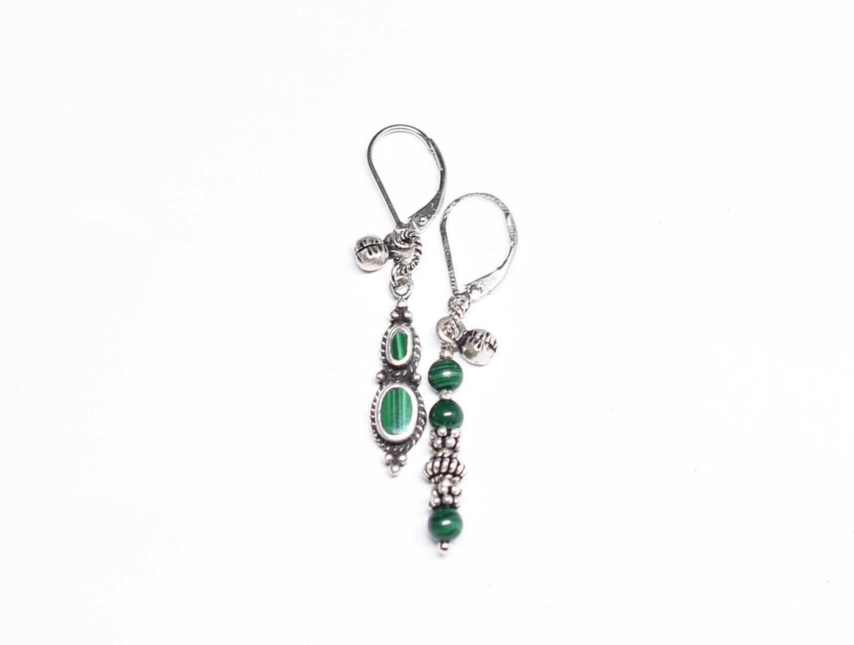 シルバー装飾&まん丸マラカイトとインドシルバー鈴を繋いだアンシメトリーなピアスです。