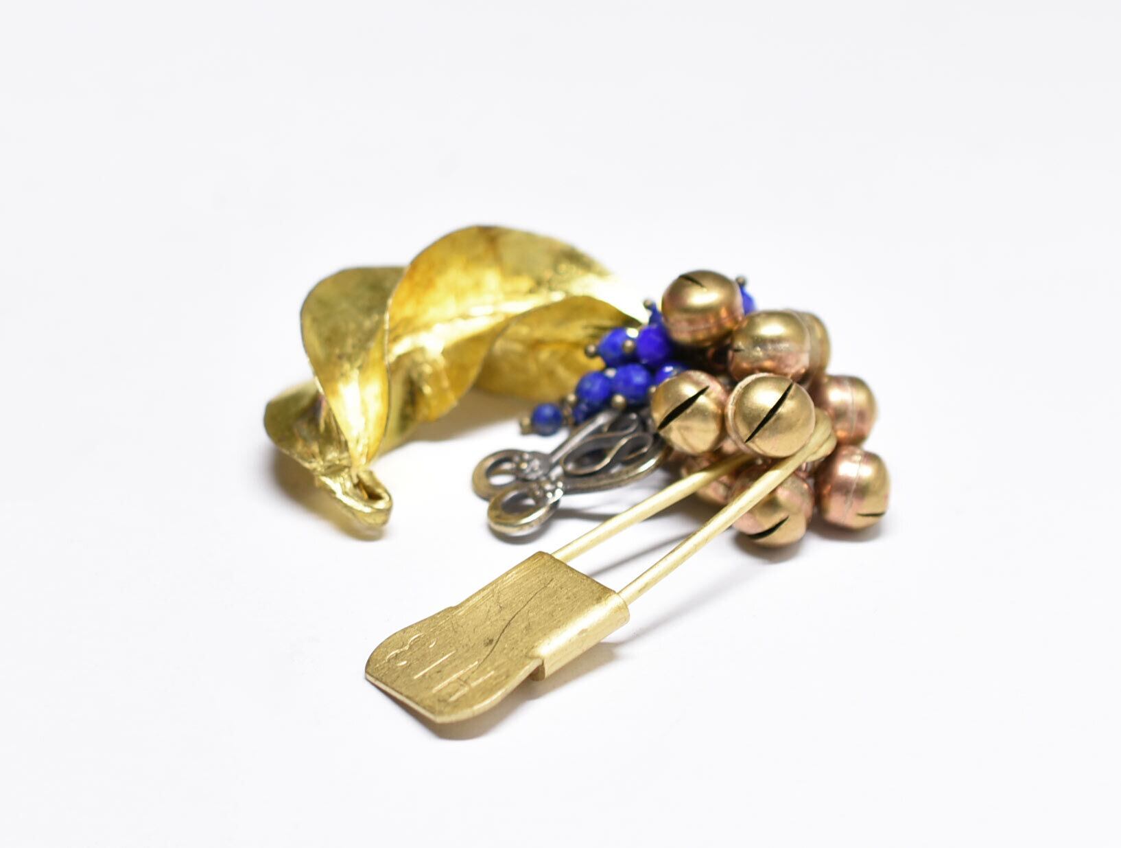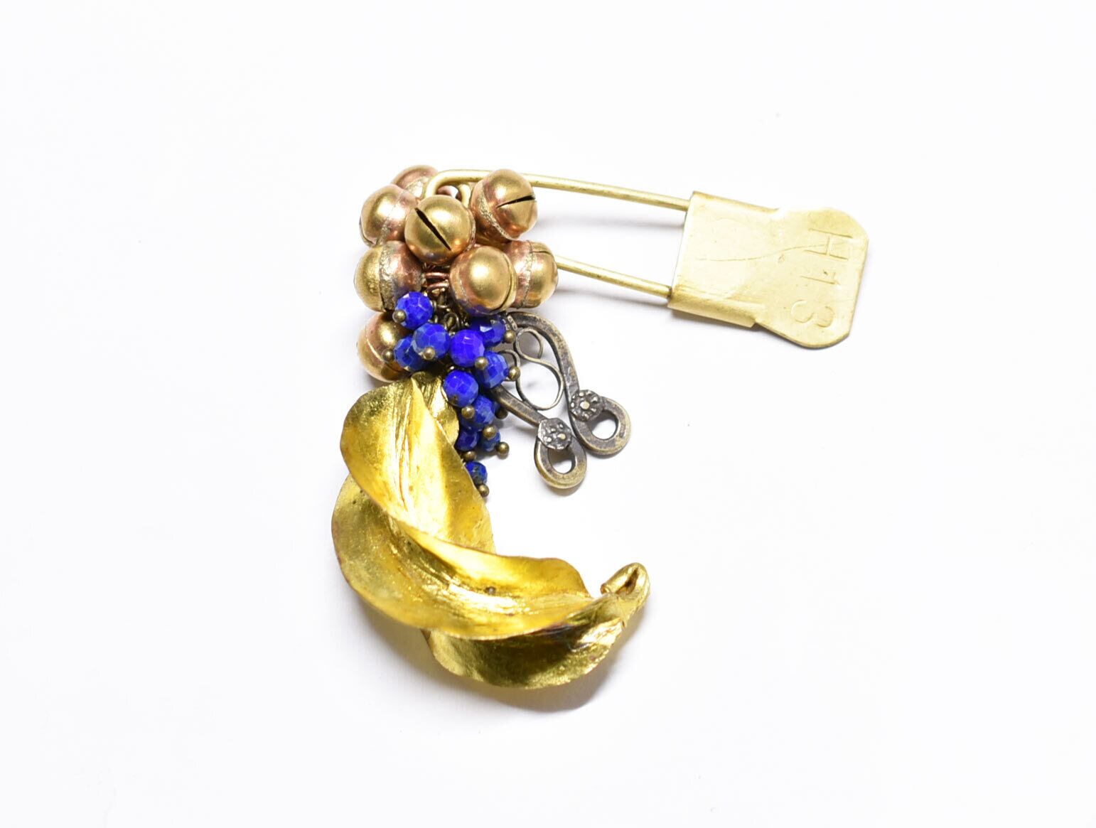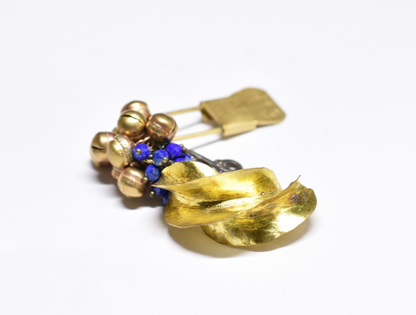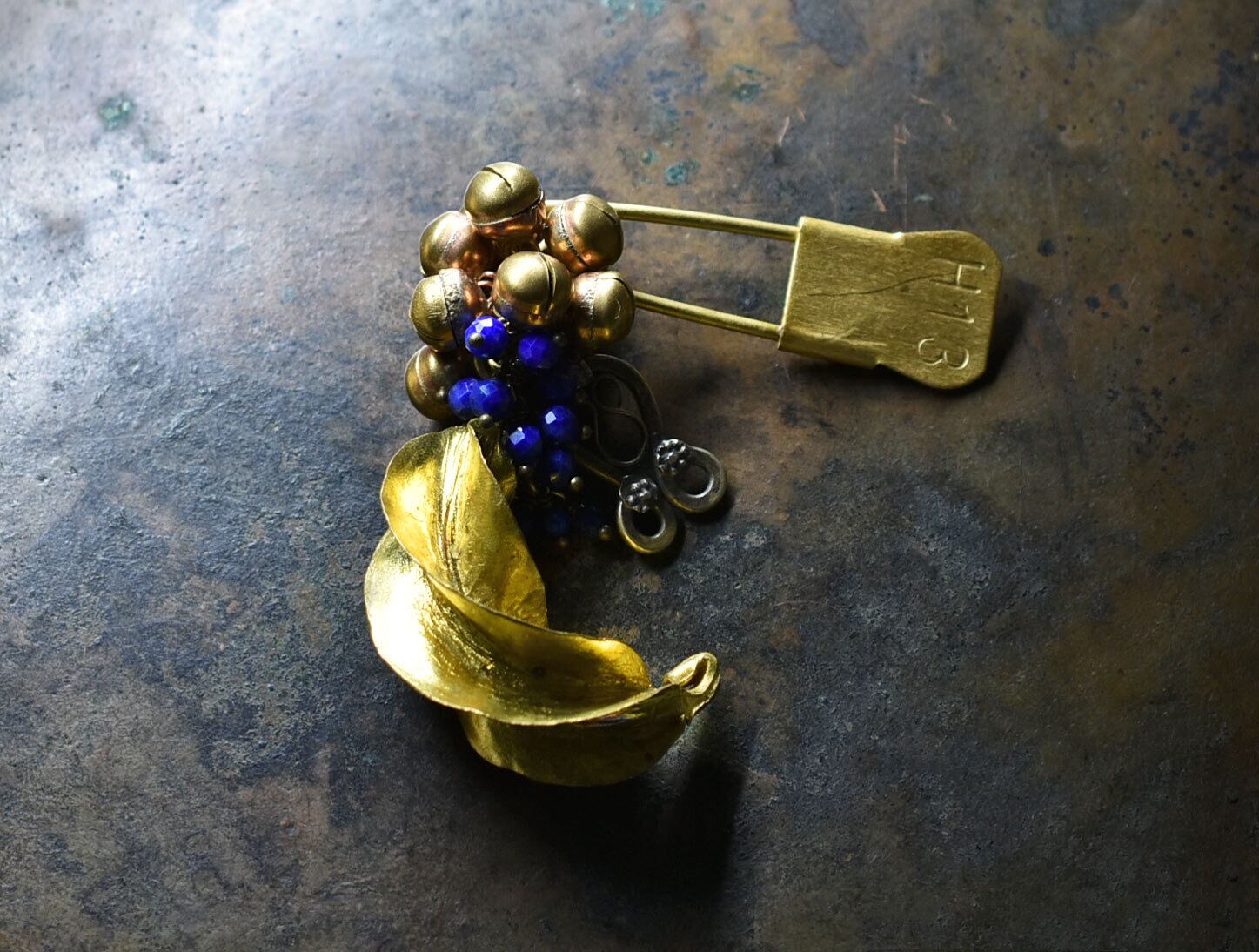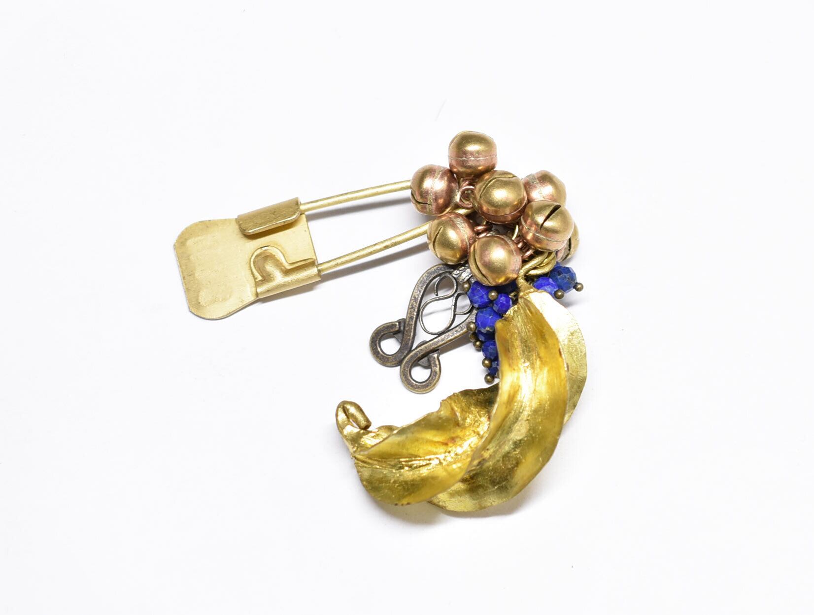 フラニ族金色パーツとたわわな鈴&ラピス、アフガンメタルのランドリーピンブローチ