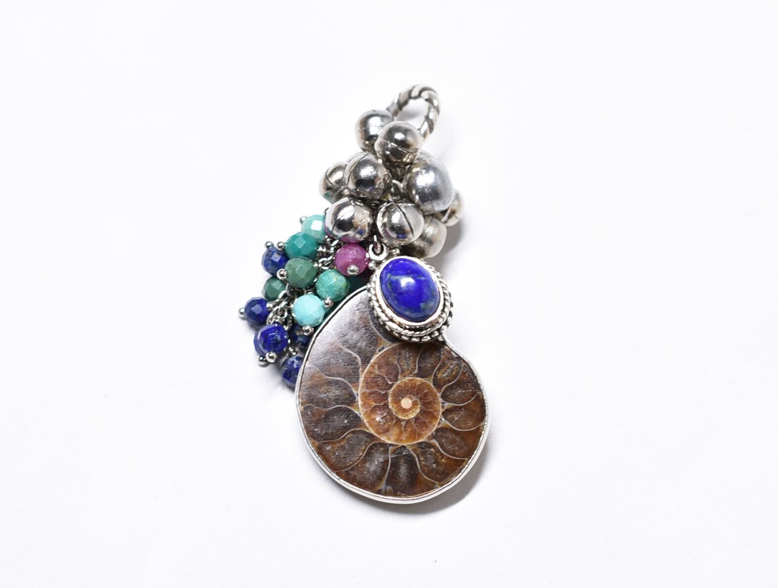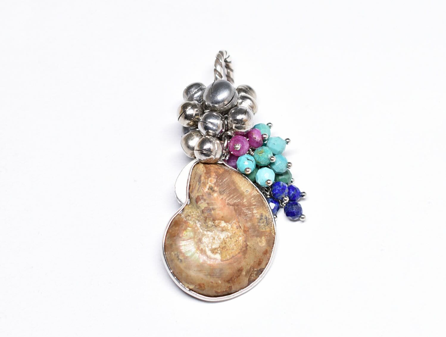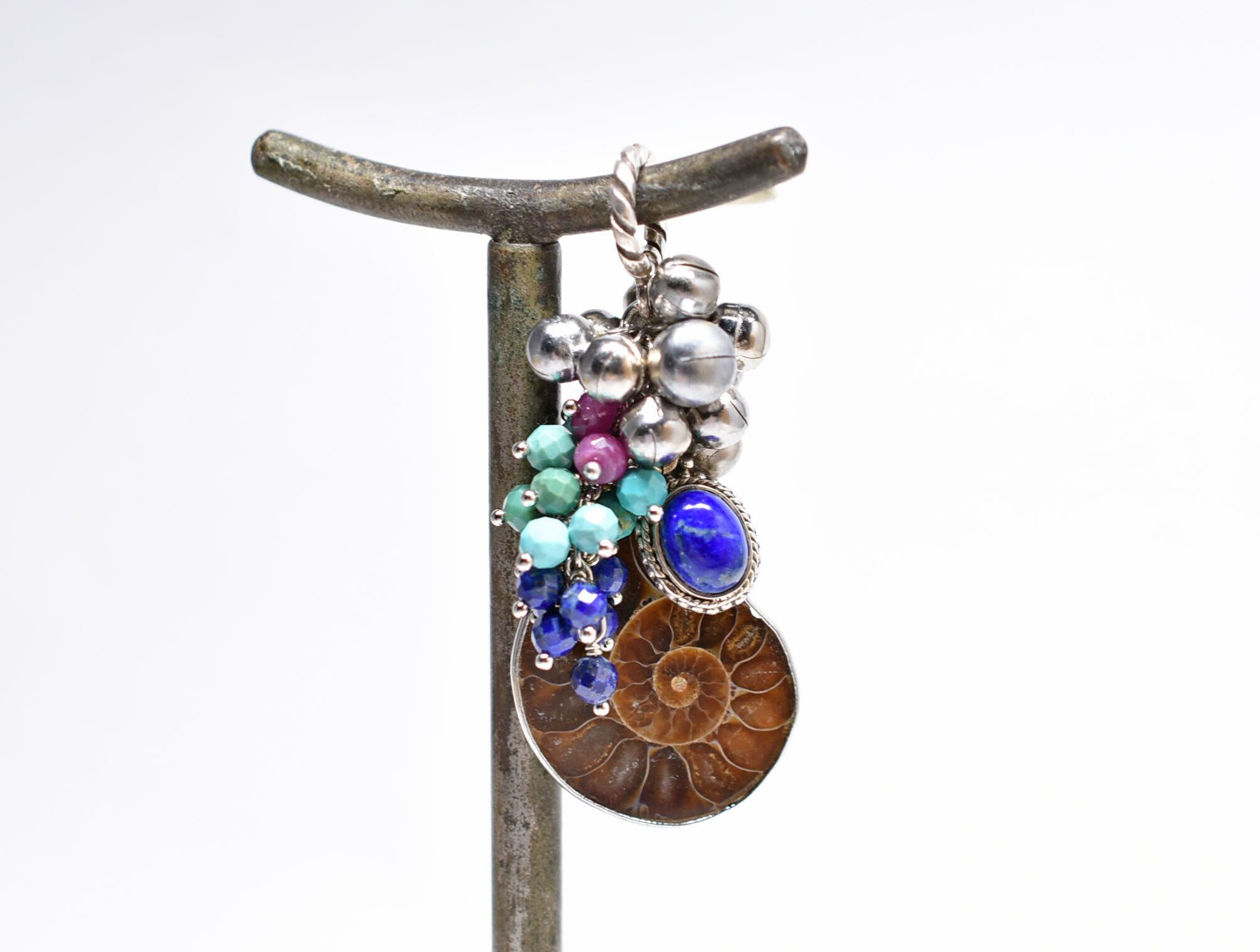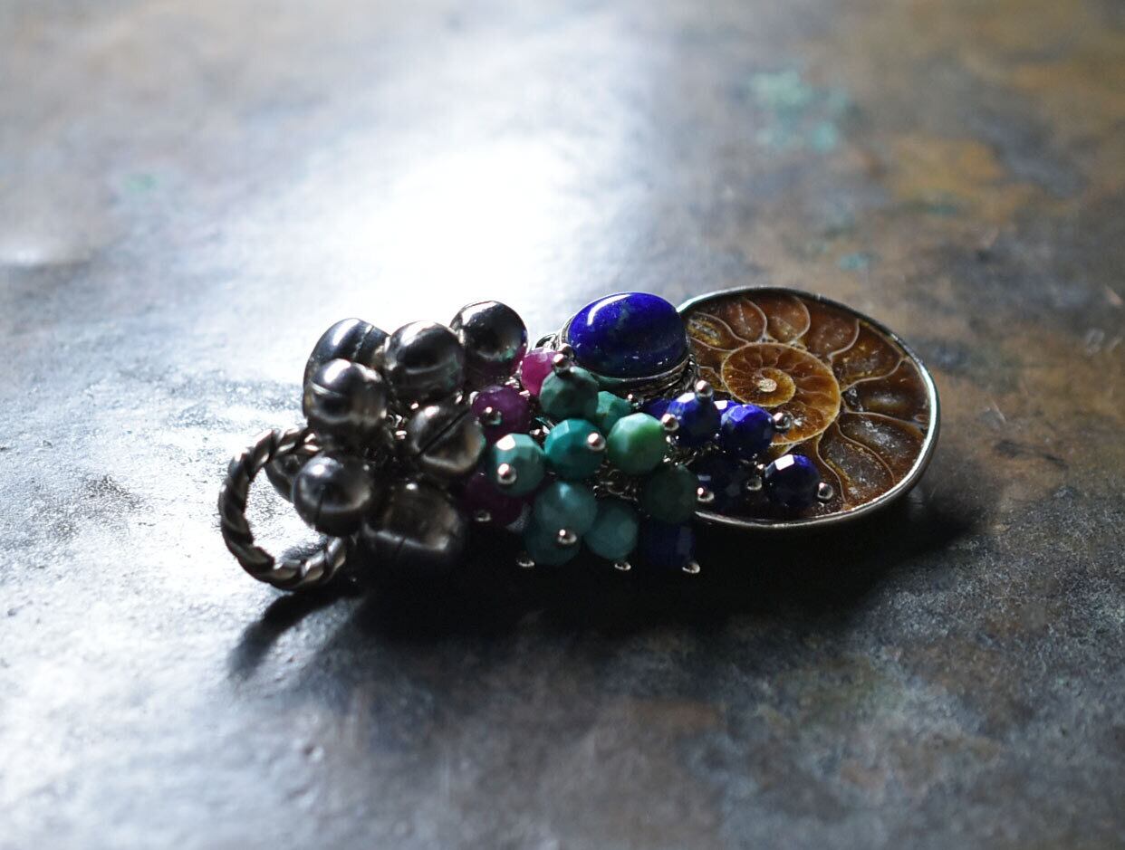アンモナイトと繊細シルバー装飾ラピス、とたわわな鈴とターコイズ&ラピス&ルビーのペンダントトップ