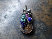 アンモナイトと繊細シルバー装飾ラピス、とたわわな鈴とターコイズ&ラピス&ルビーを繋いだペンダントトップです。