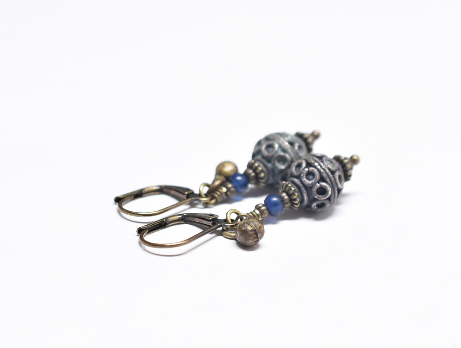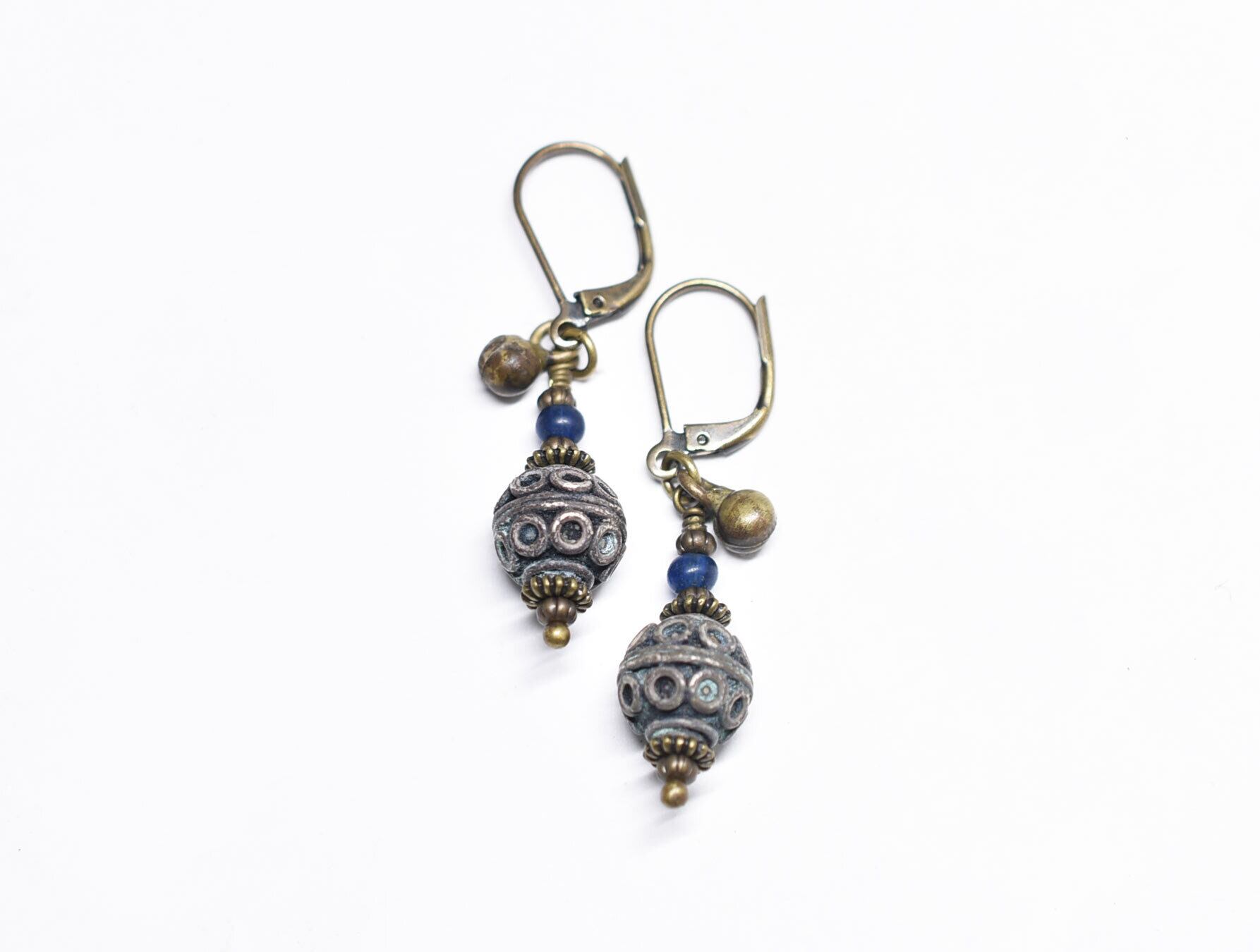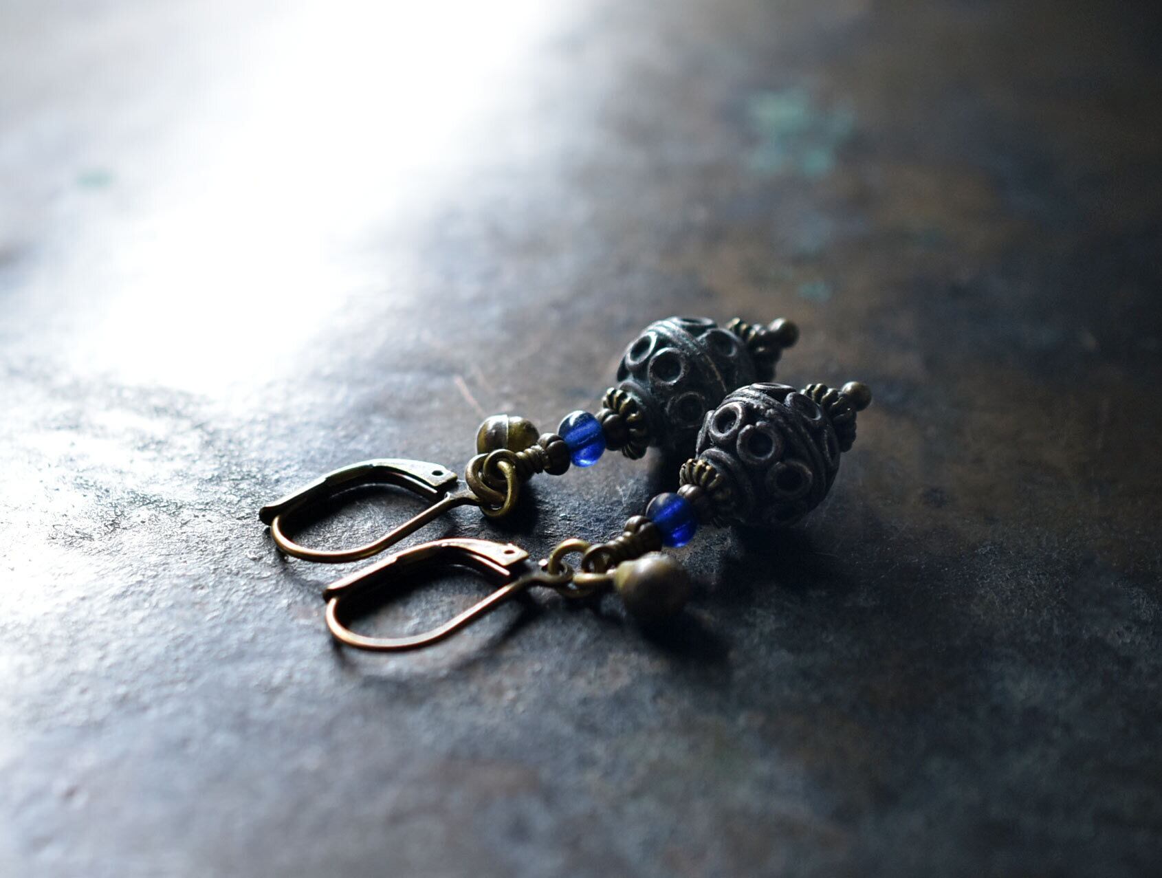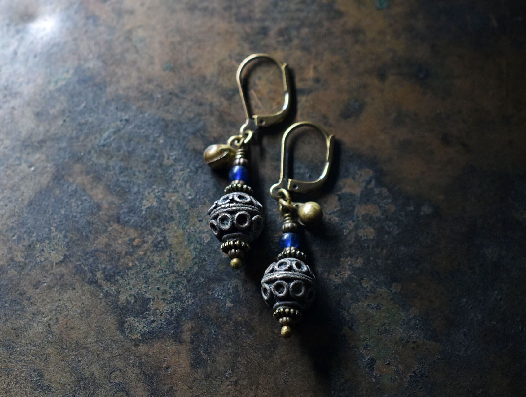 アフガニスタンメタルパーツとダークブルービーズ、小さな民族鈴のピアス