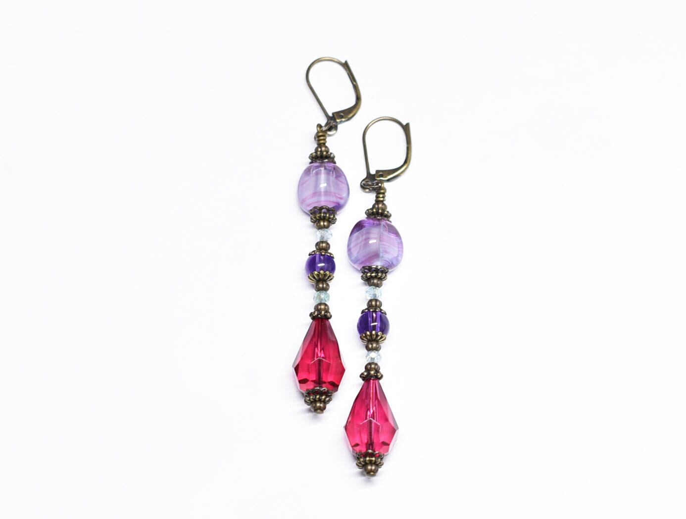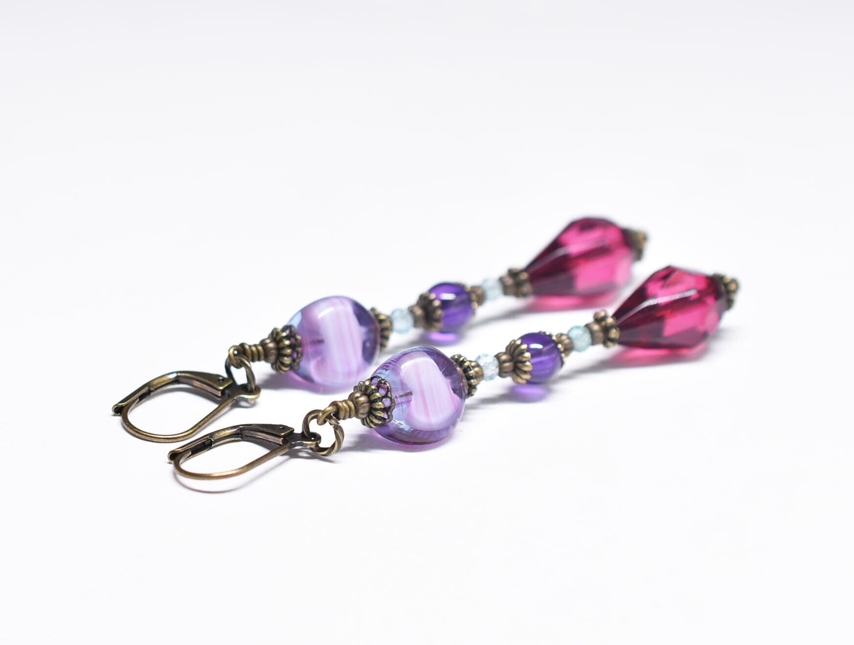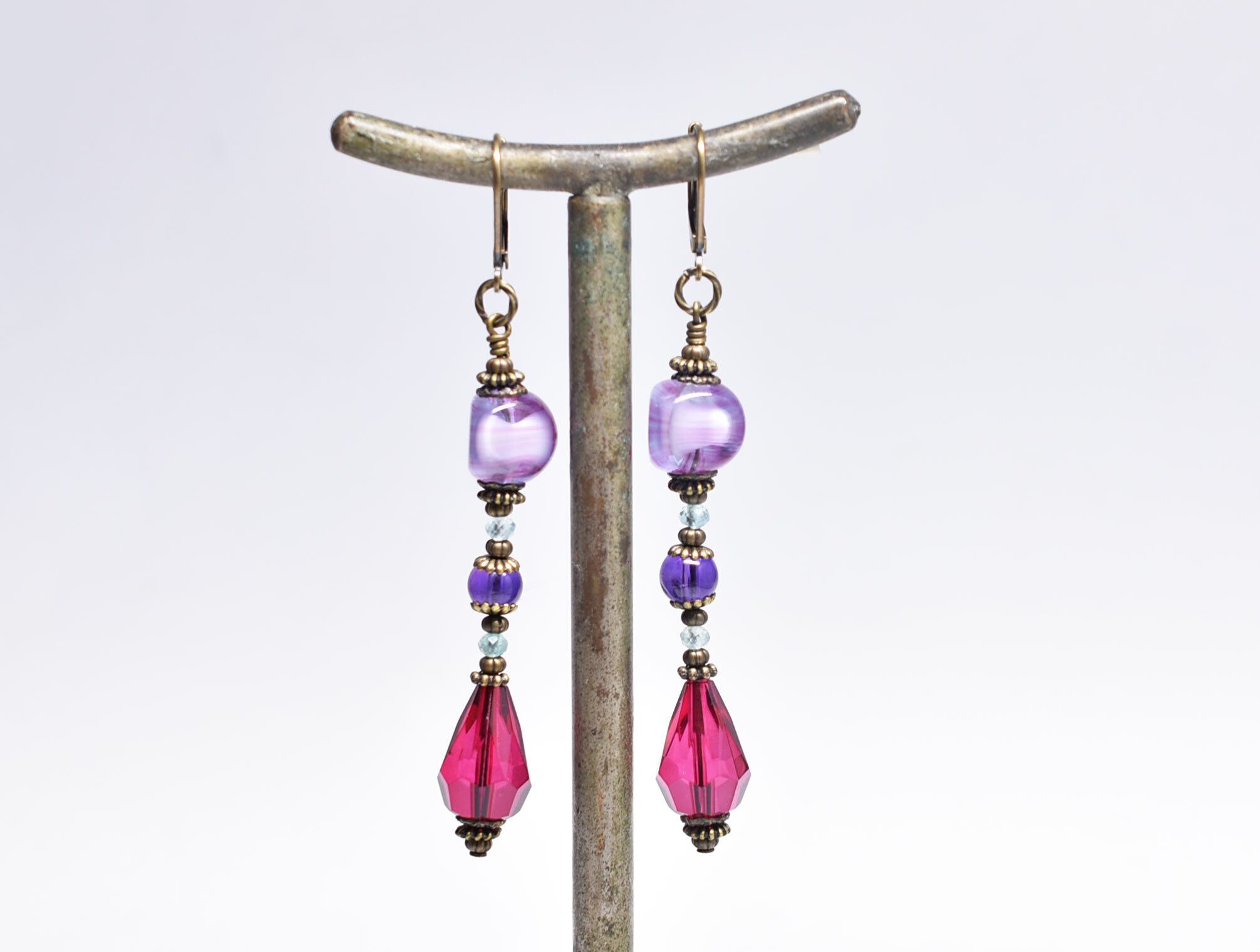 ラズベリーカラーフランス&パープルドイツヴィンテージビーズとアメジスト、アパタイトのピアス