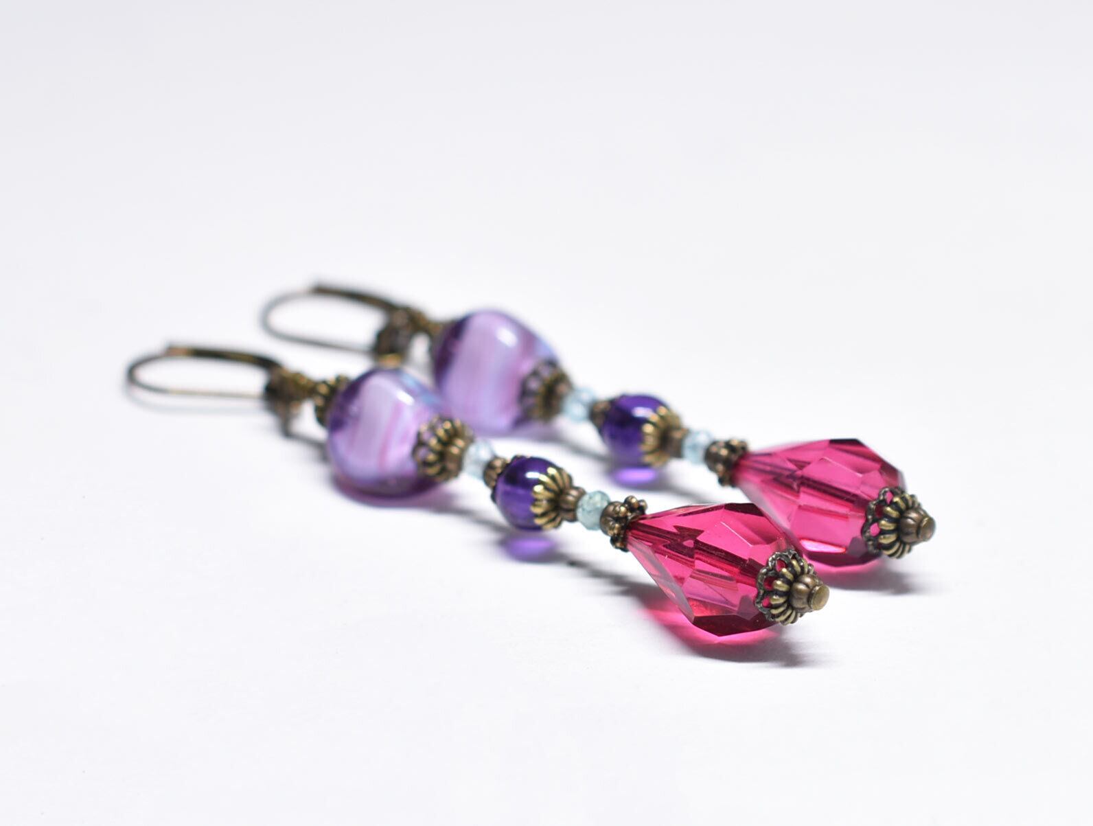 ラズベリーカラーフランス&パープルドイツヴィンテージビーズとアメジスト、アパタイトを繋いだピアスです。