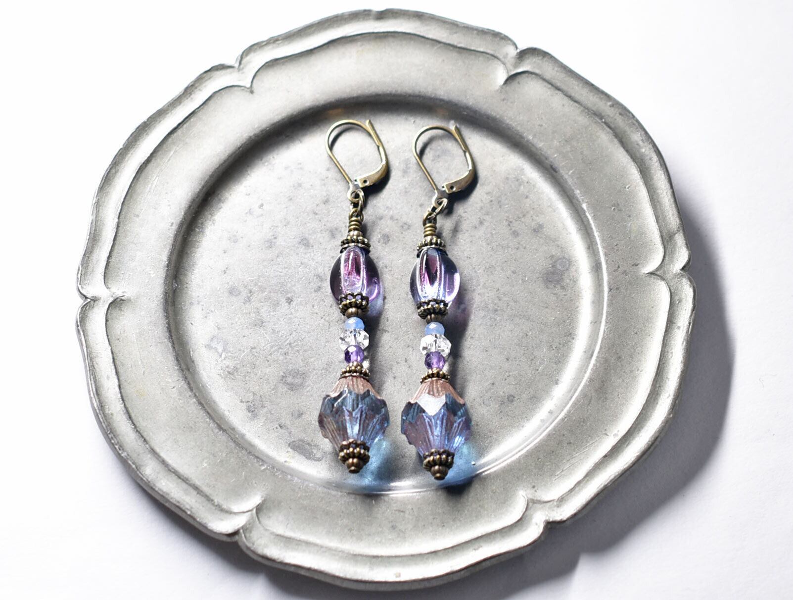ゼニスブルーチェコビーズとパープルドイツビーズとアメジスト、ブルージェイドのピアス