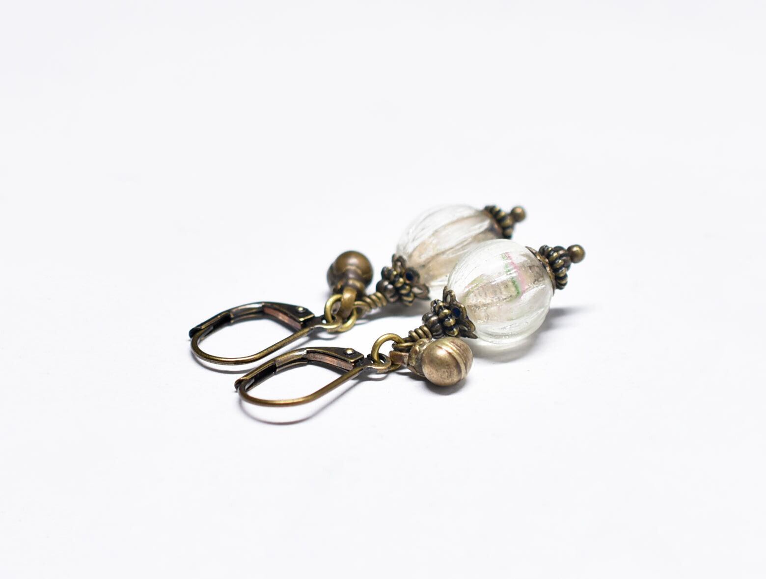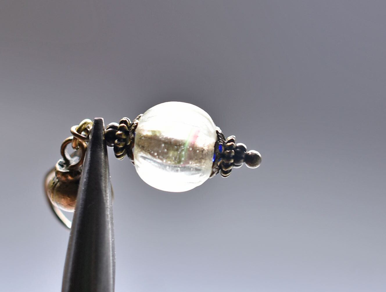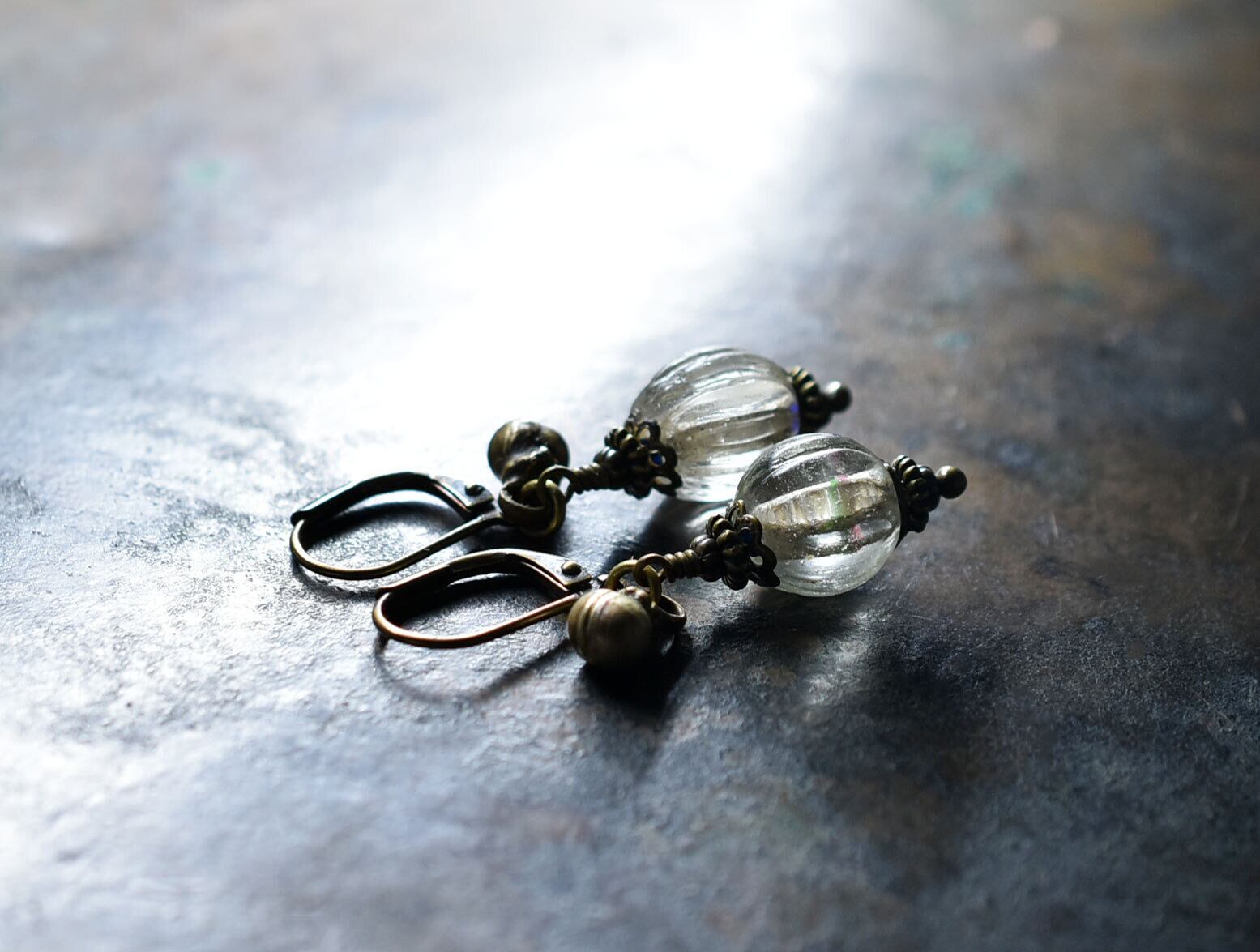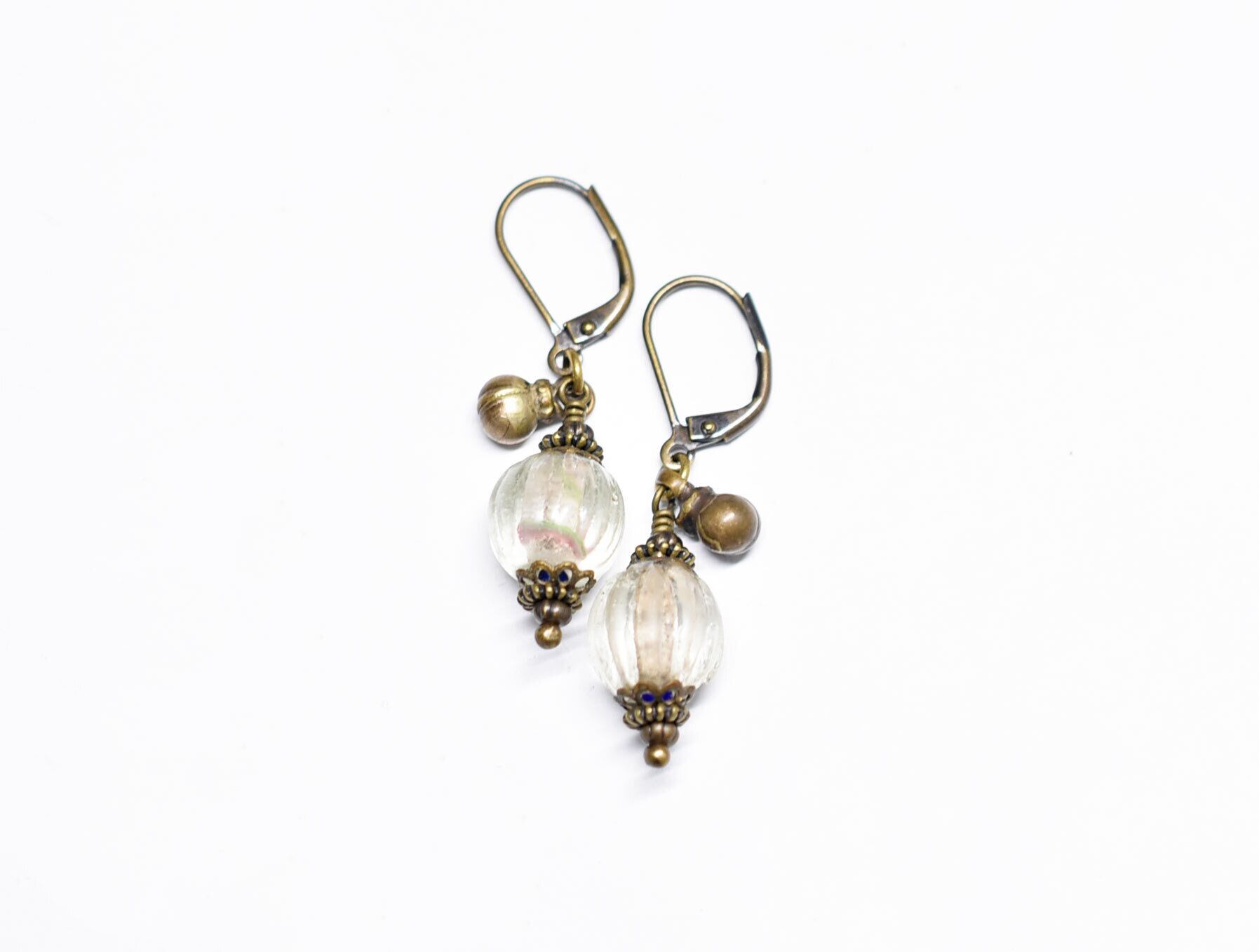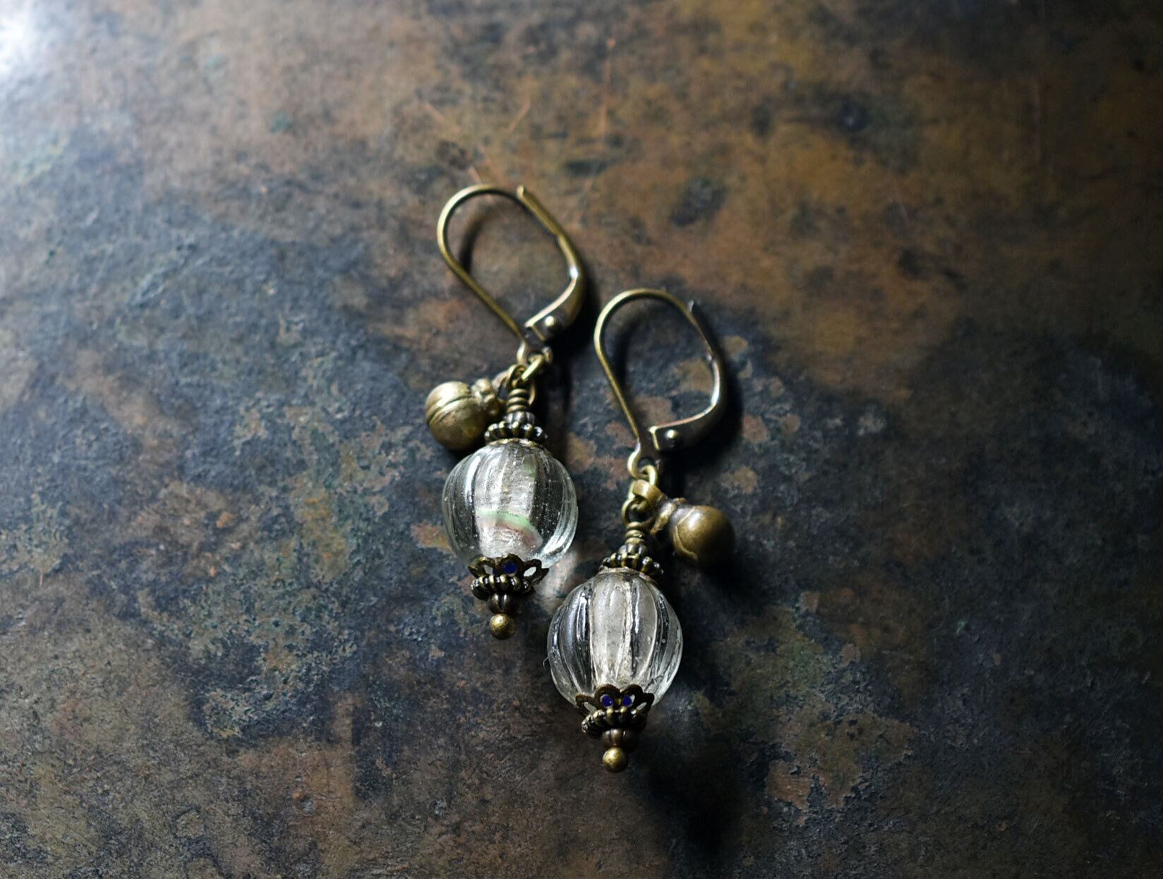 oldクリア蜜柑玉と隠しブルービーズ、民族鈴を繋いだピアスです。