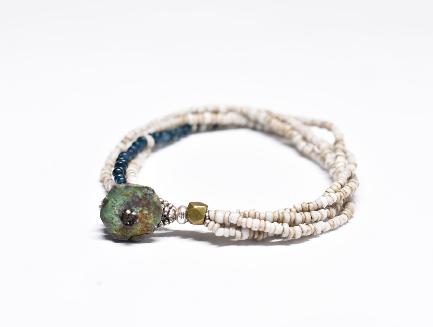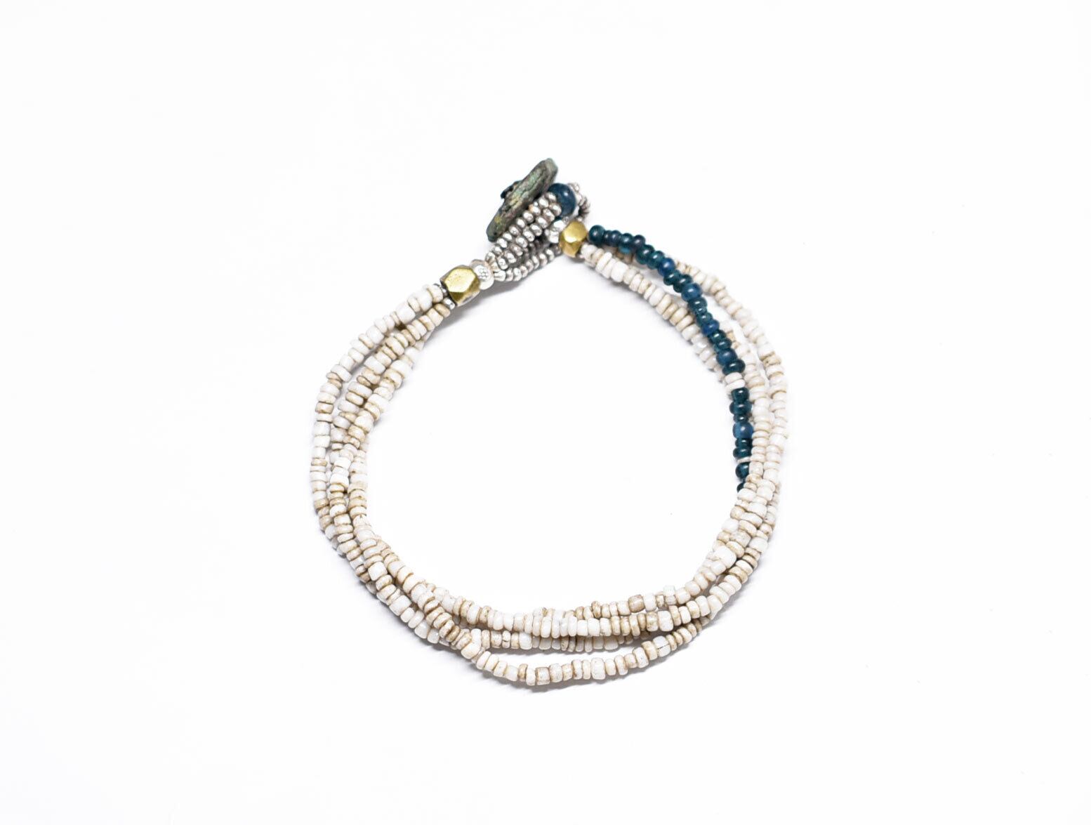 アンティークホワイトシードビーズとインディゴブルービーズの4連ブレス(oldコイン留め金)