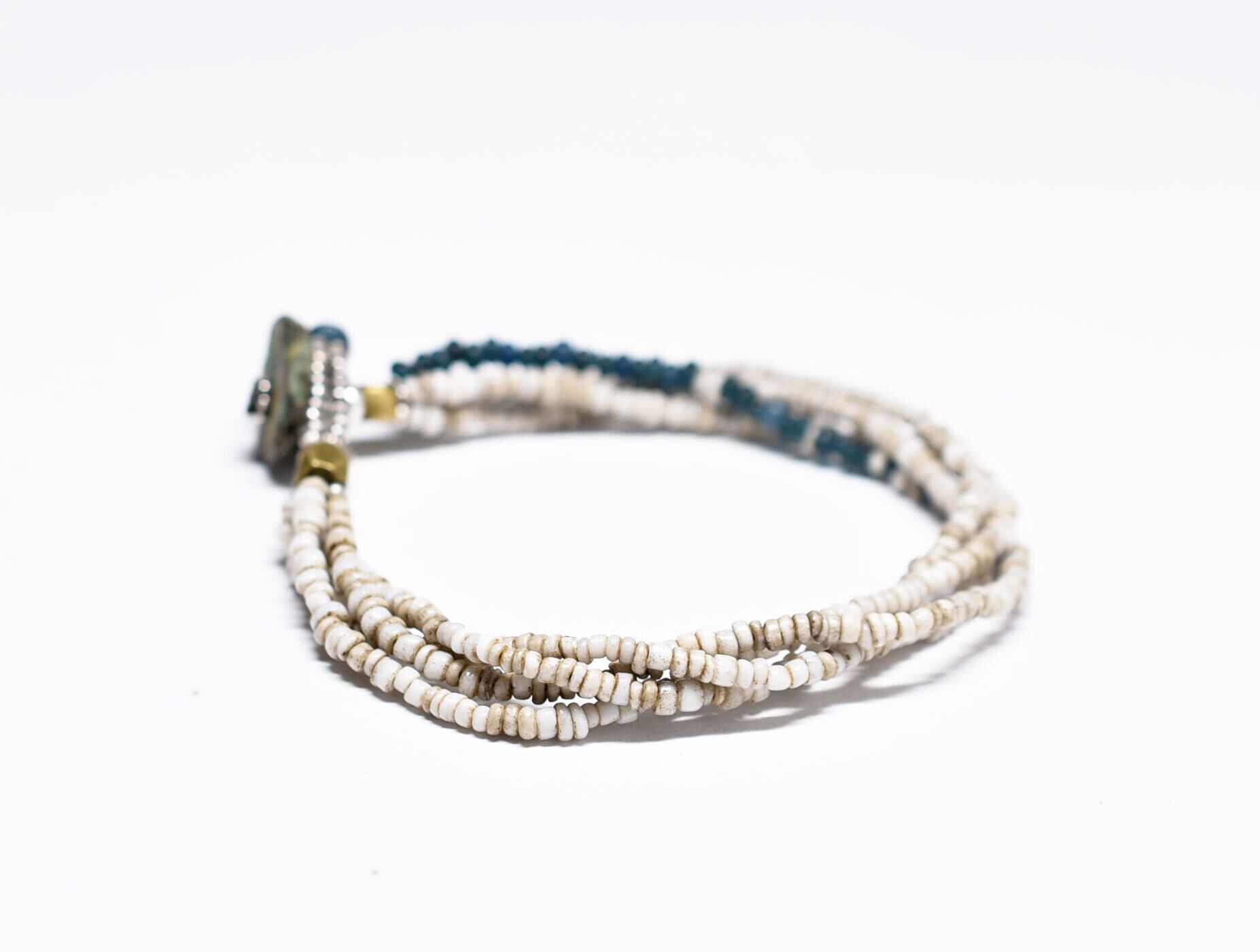 4連部分の一部と、留め金の輪っか部分にはブルーグレーのインドパシフィックビーズを入れました。