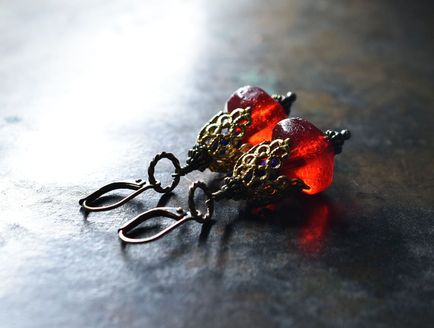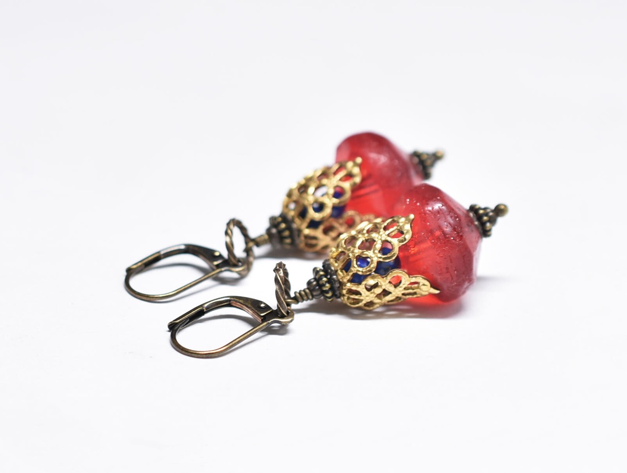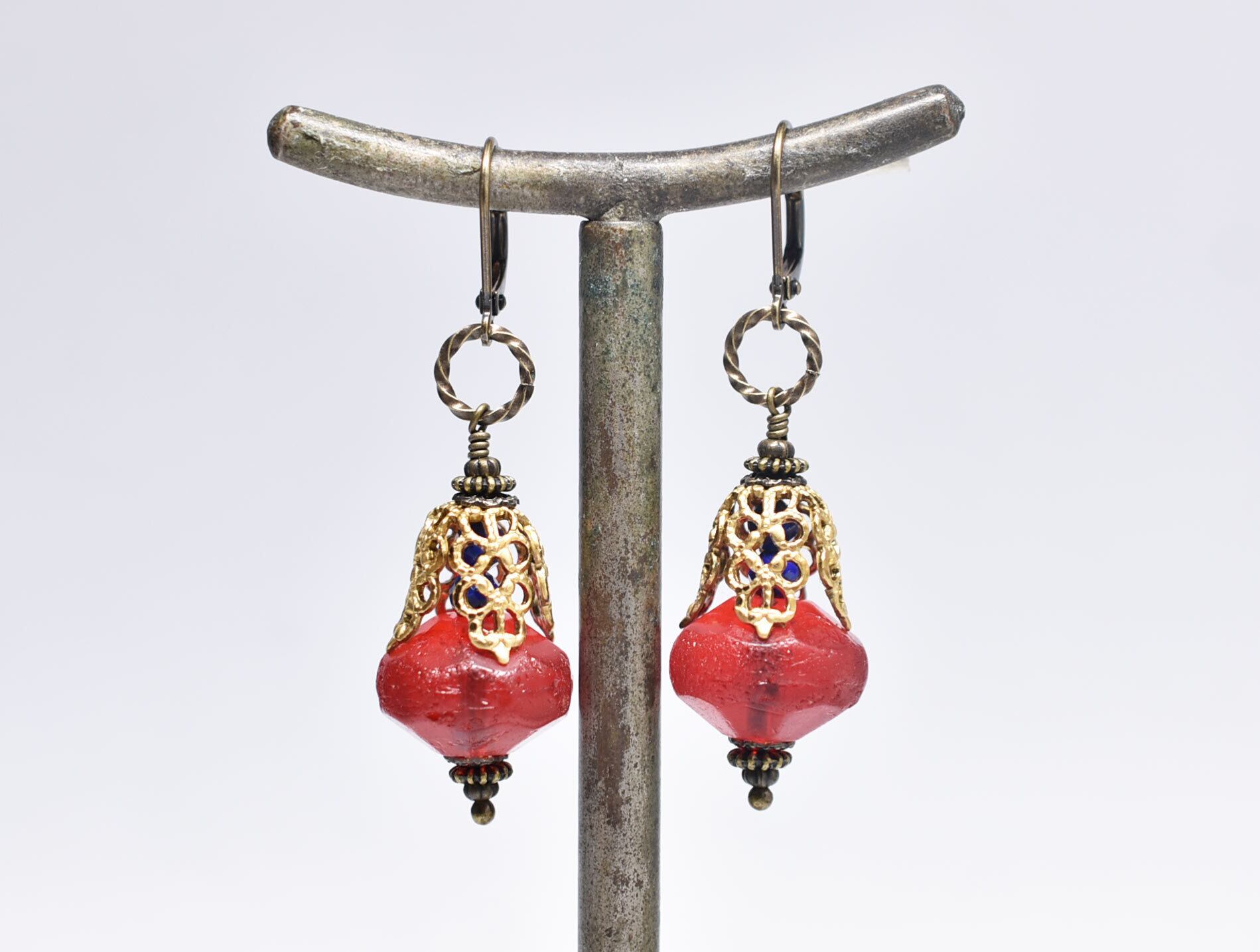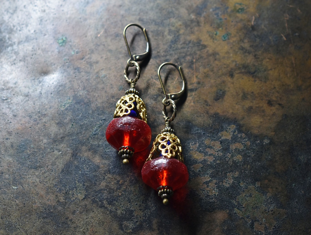 真っ赤な算盤型アンティークボヘミアビーズと繊細装飾ブラスキャップ、ラピスをっ繋いだボリュームのあるピアスです。