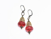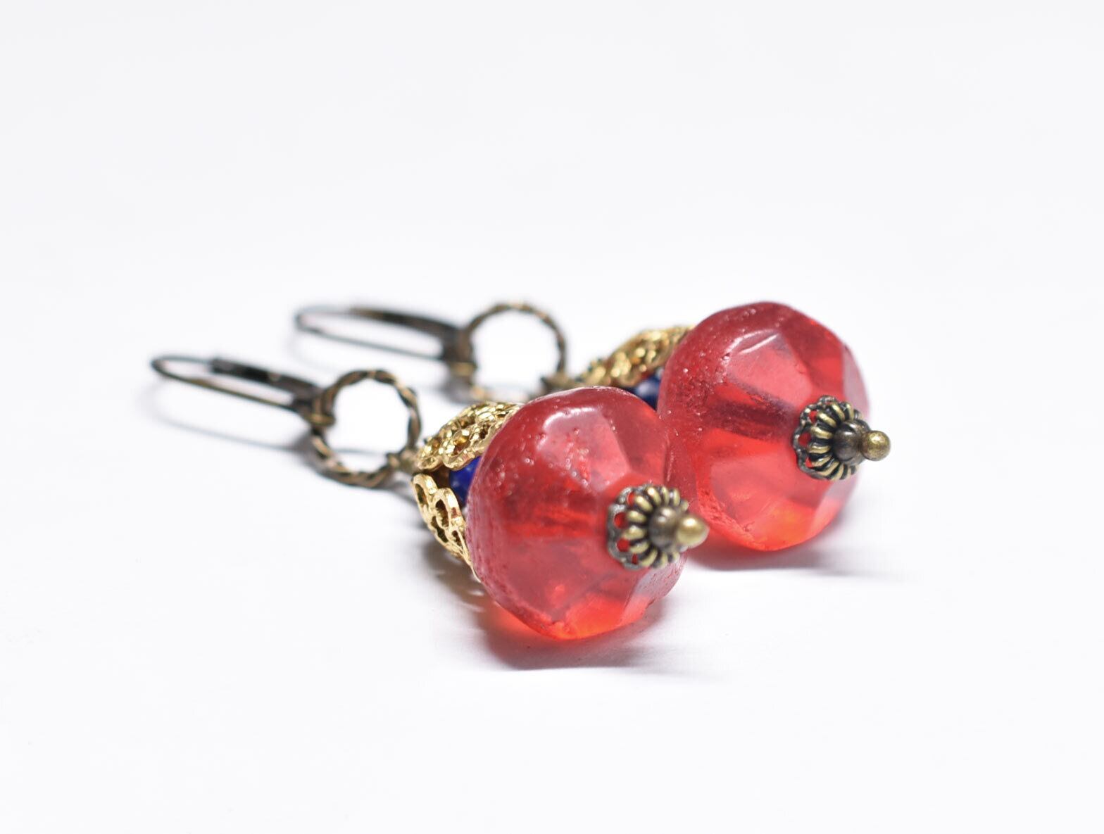 真っ赤な算盤型アンティークボヘミアビーズと繊細装飾ブラスキャップ、ラピスのピアス