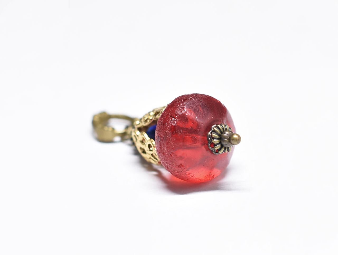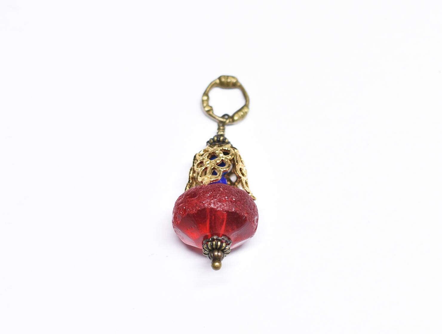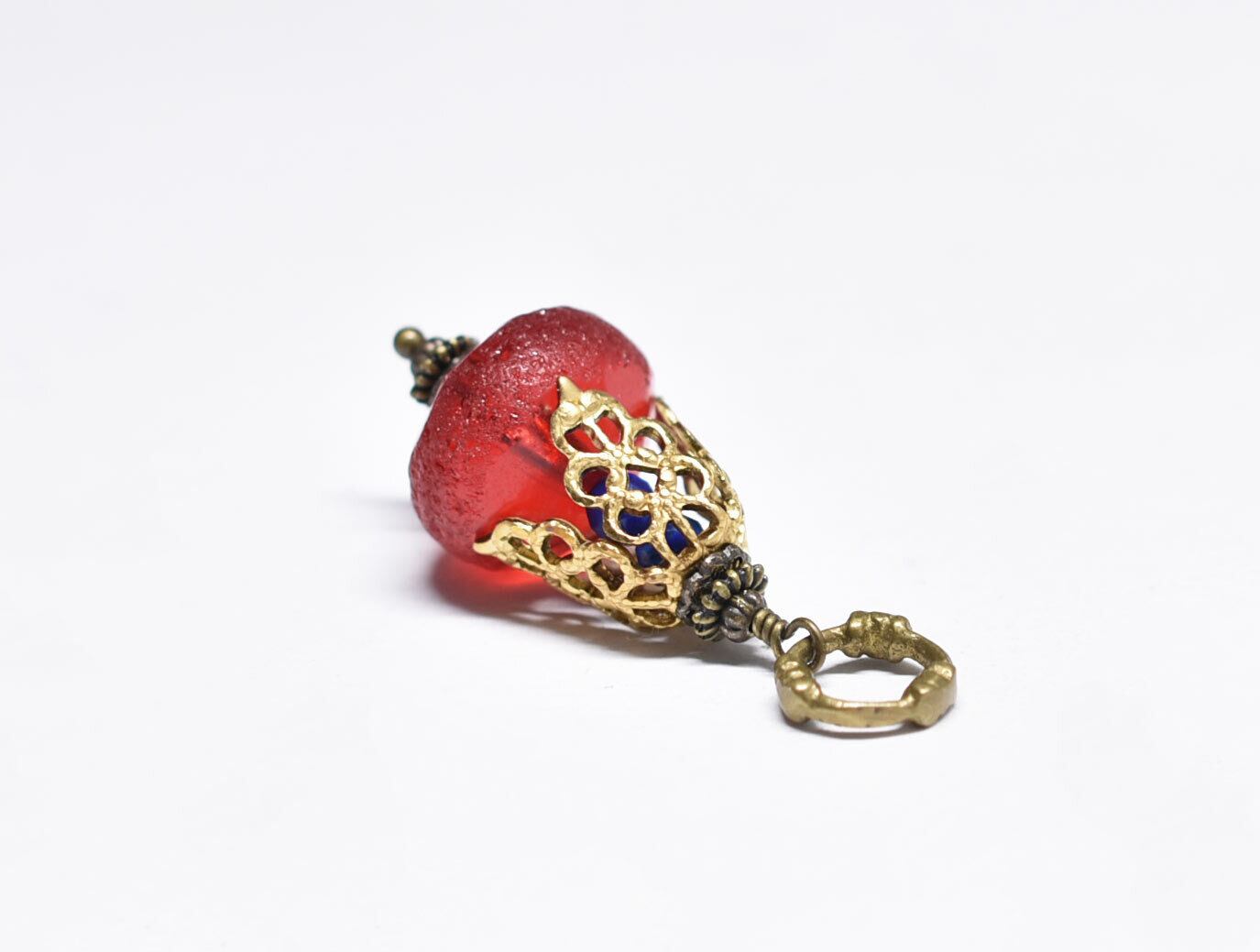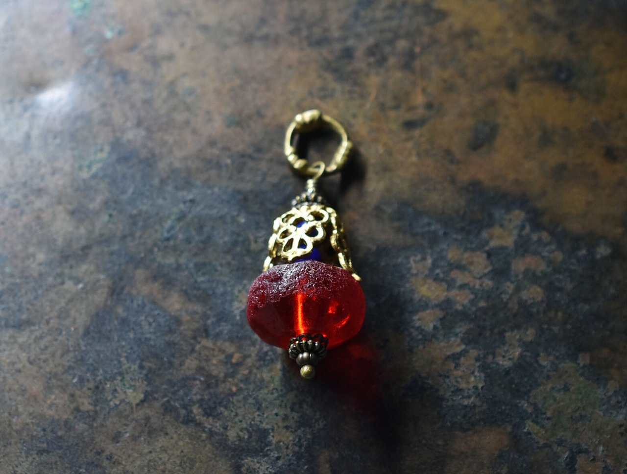 真っ赤な算盤型アンティークボヘミアビーズと繊細装飾ブラスキャップ、ラピスのペンダントトップ
