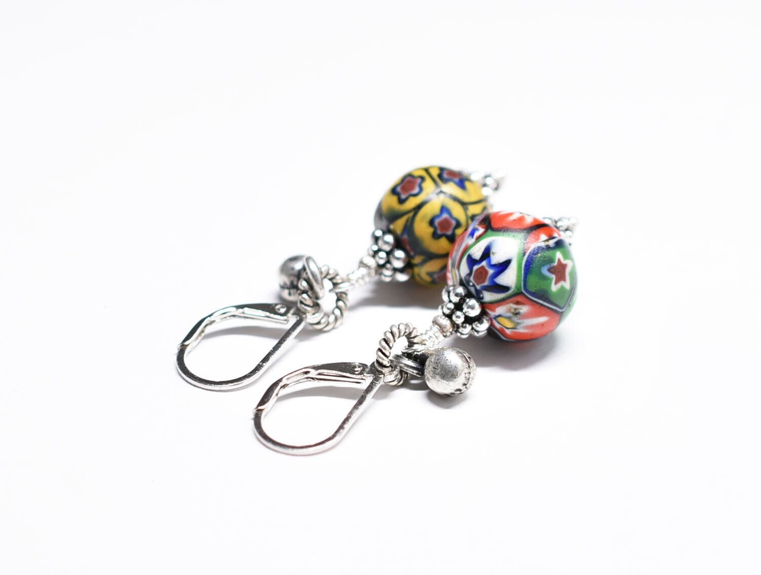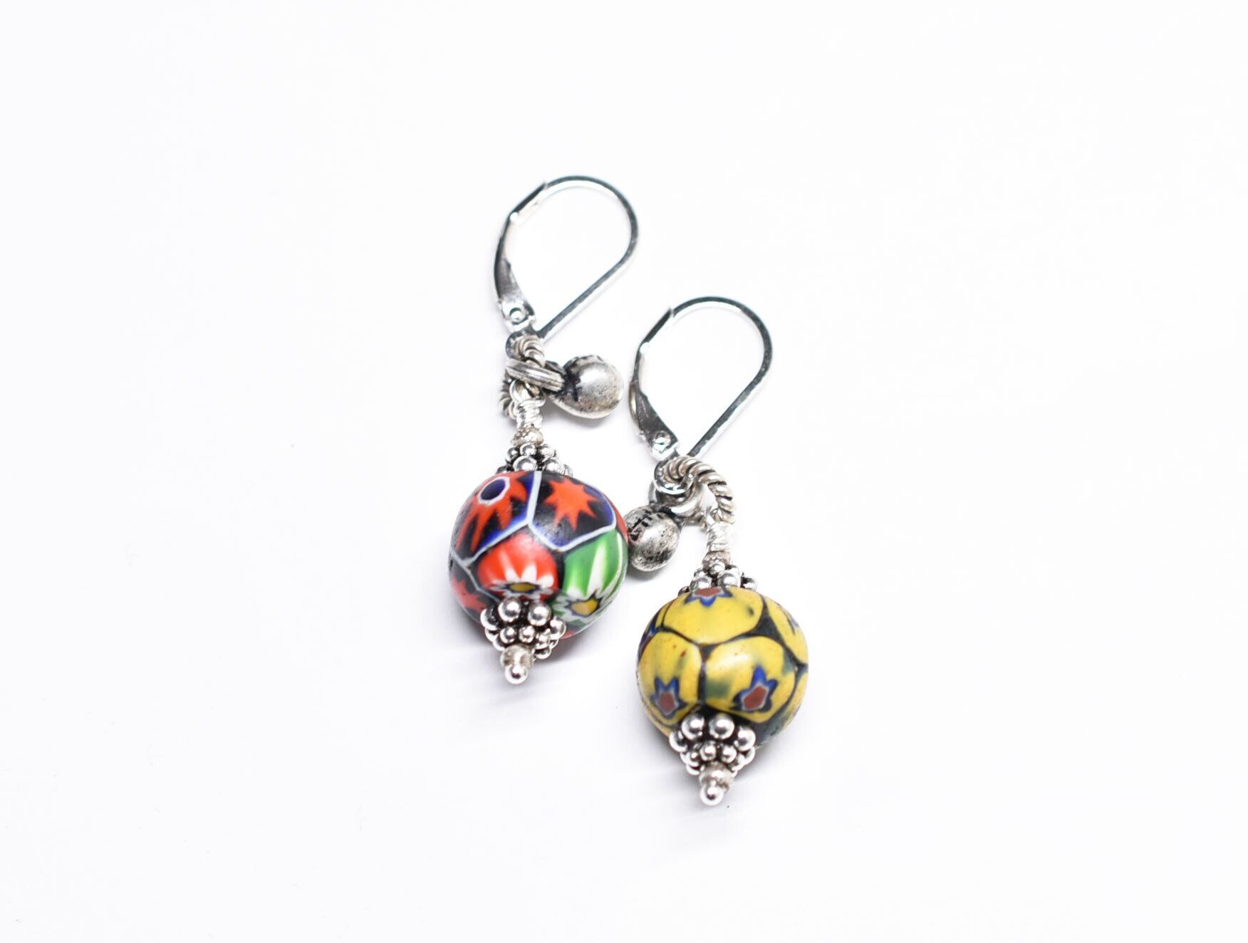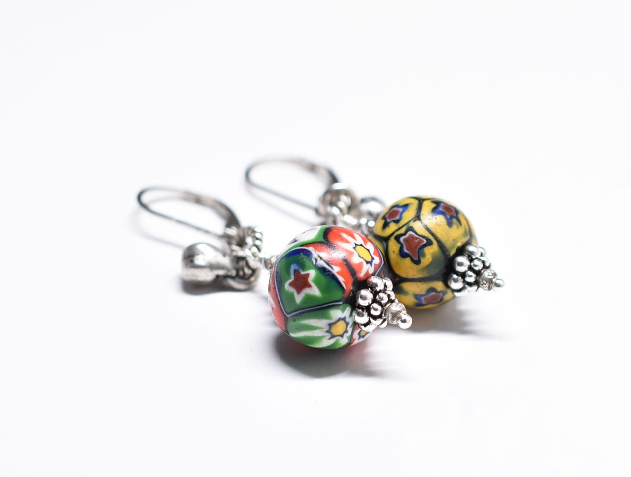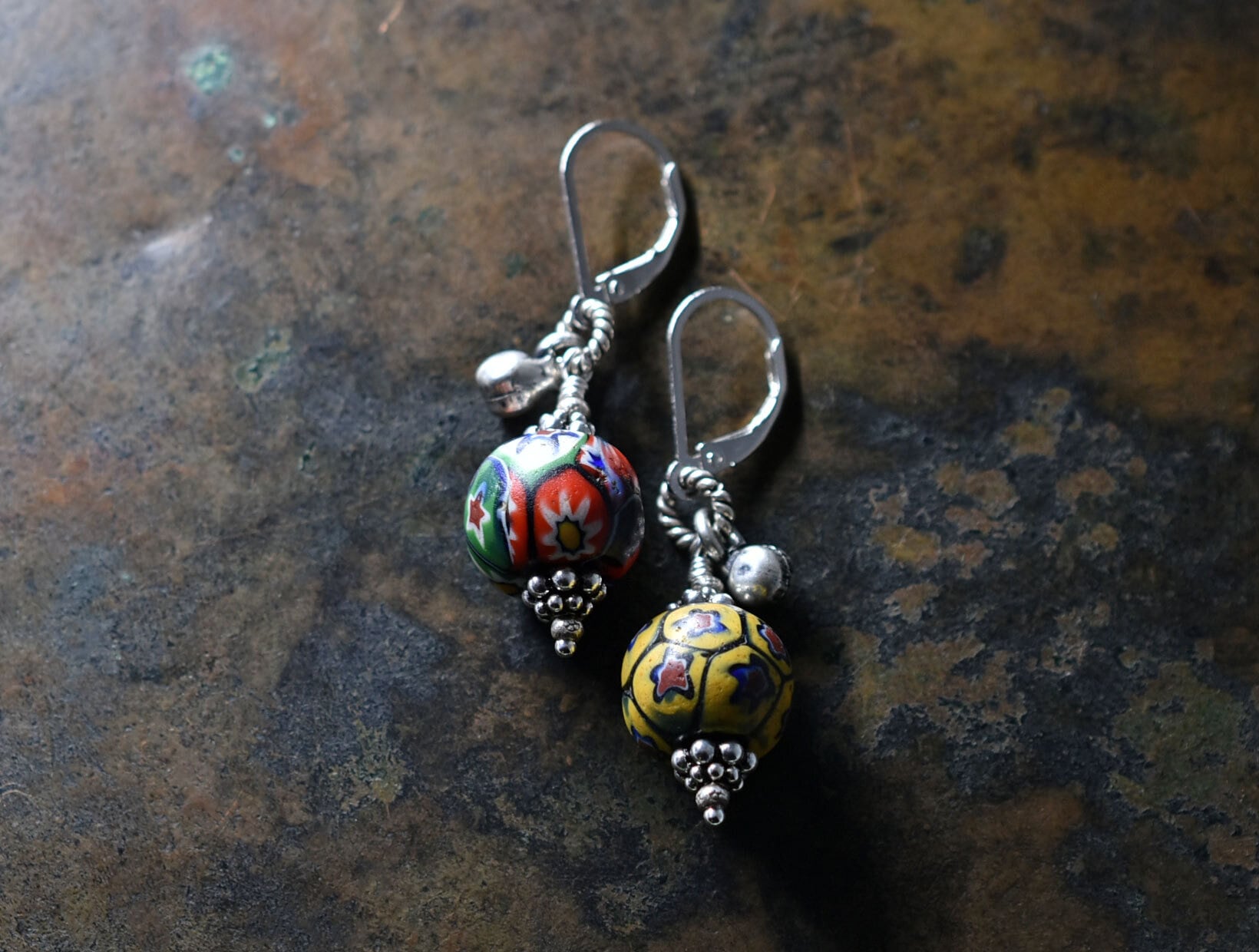 ぷっくりアンティークヴェネチアミルフィオリとインドシルバー鈴のピアス