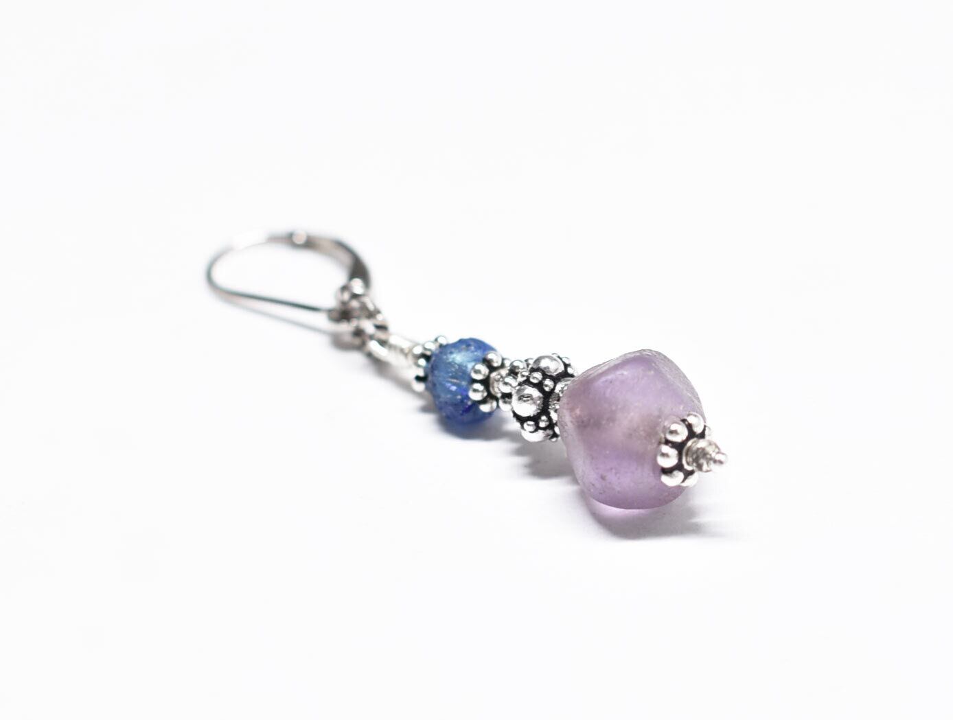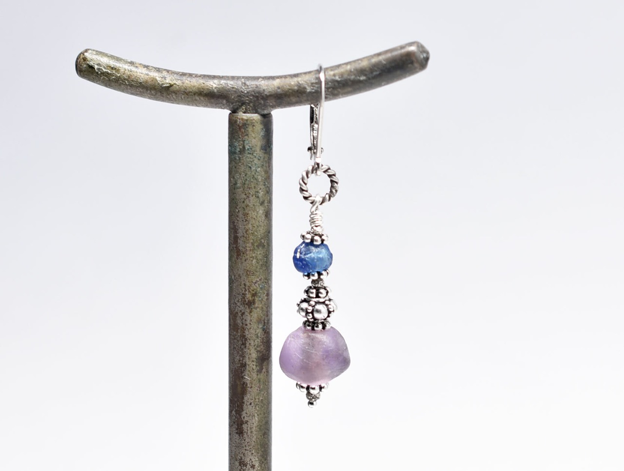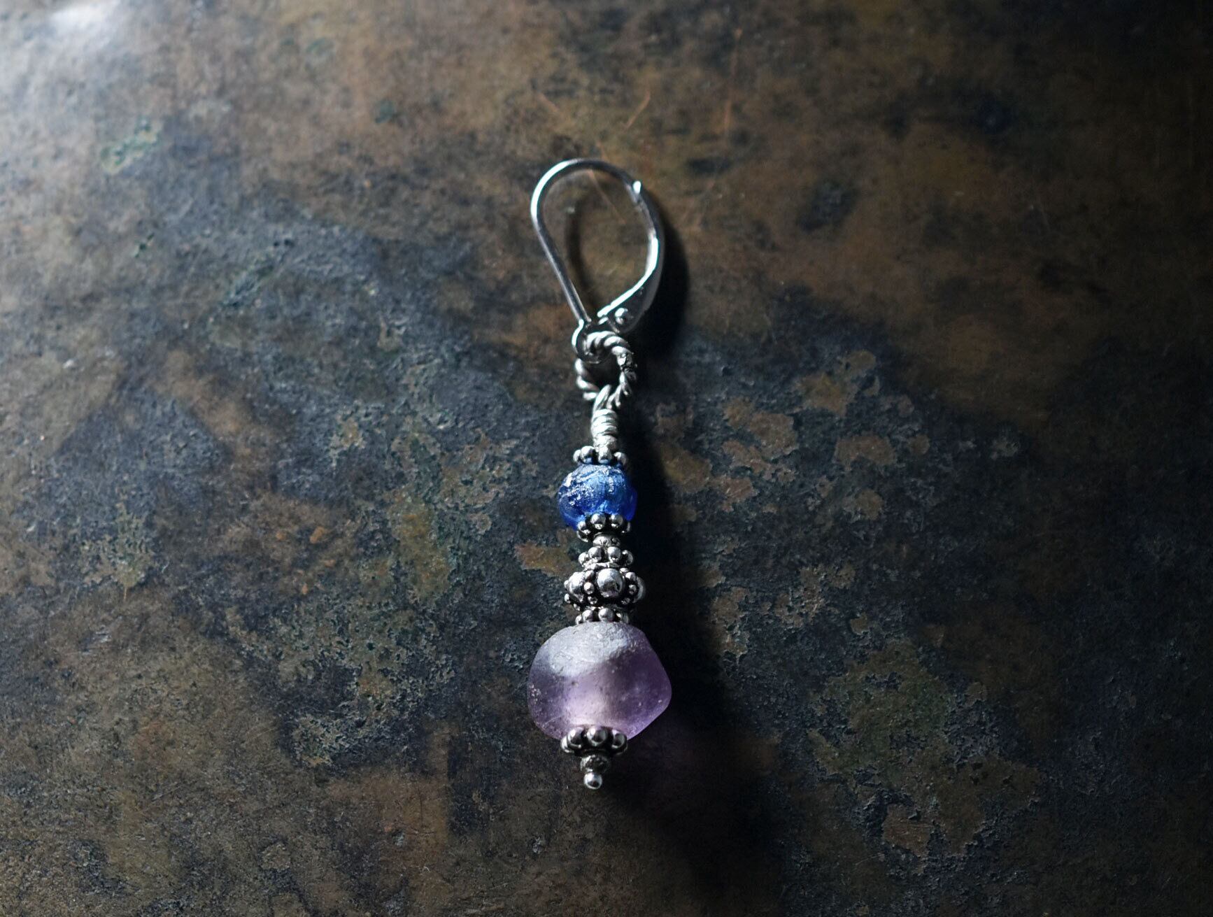 ドゴン族すみれ色ビーズと銀化ローマングラスビーズの片耳ピアス