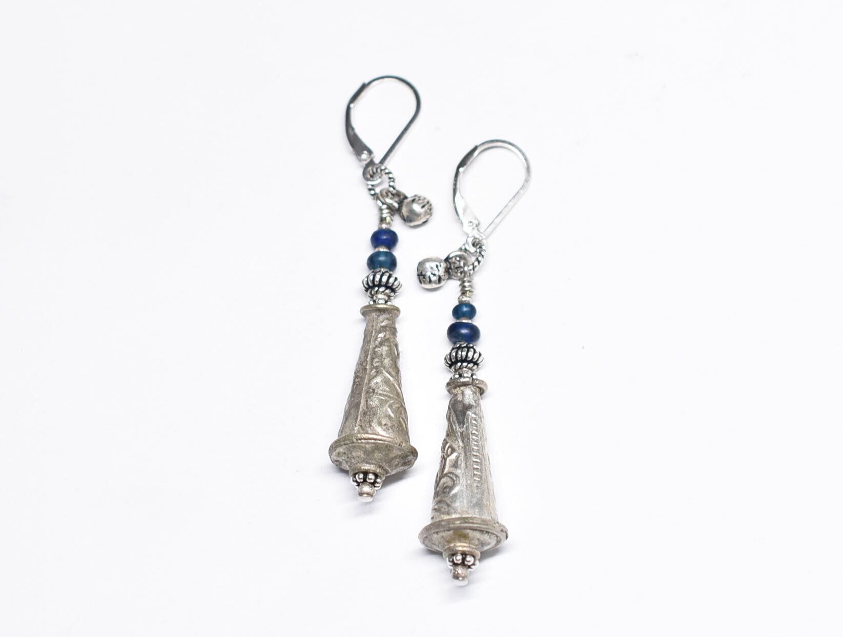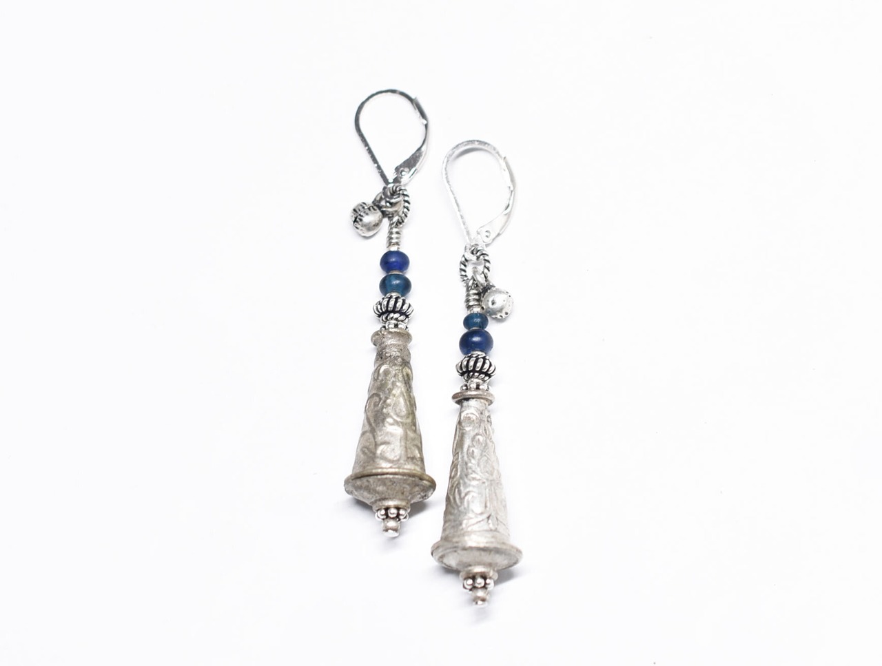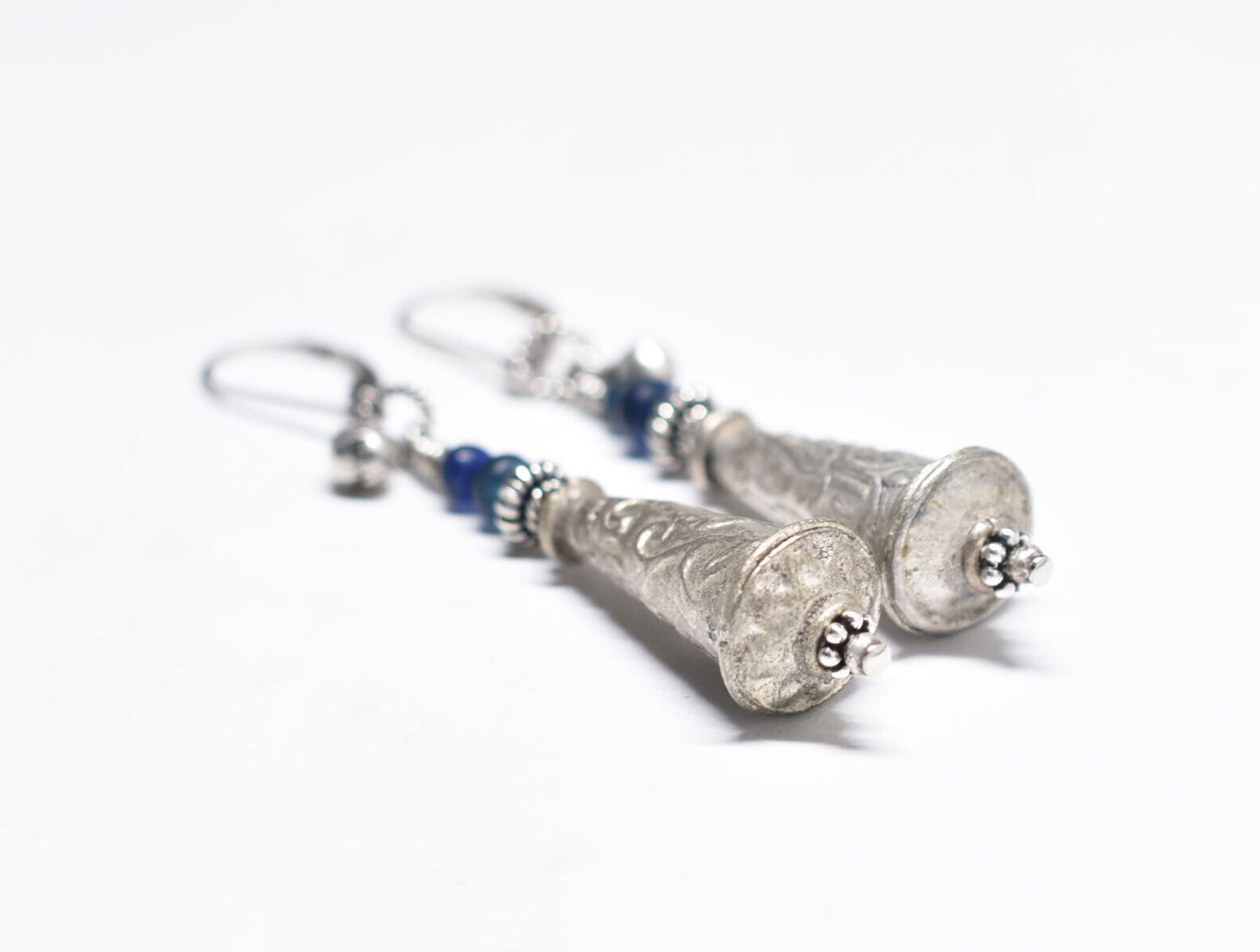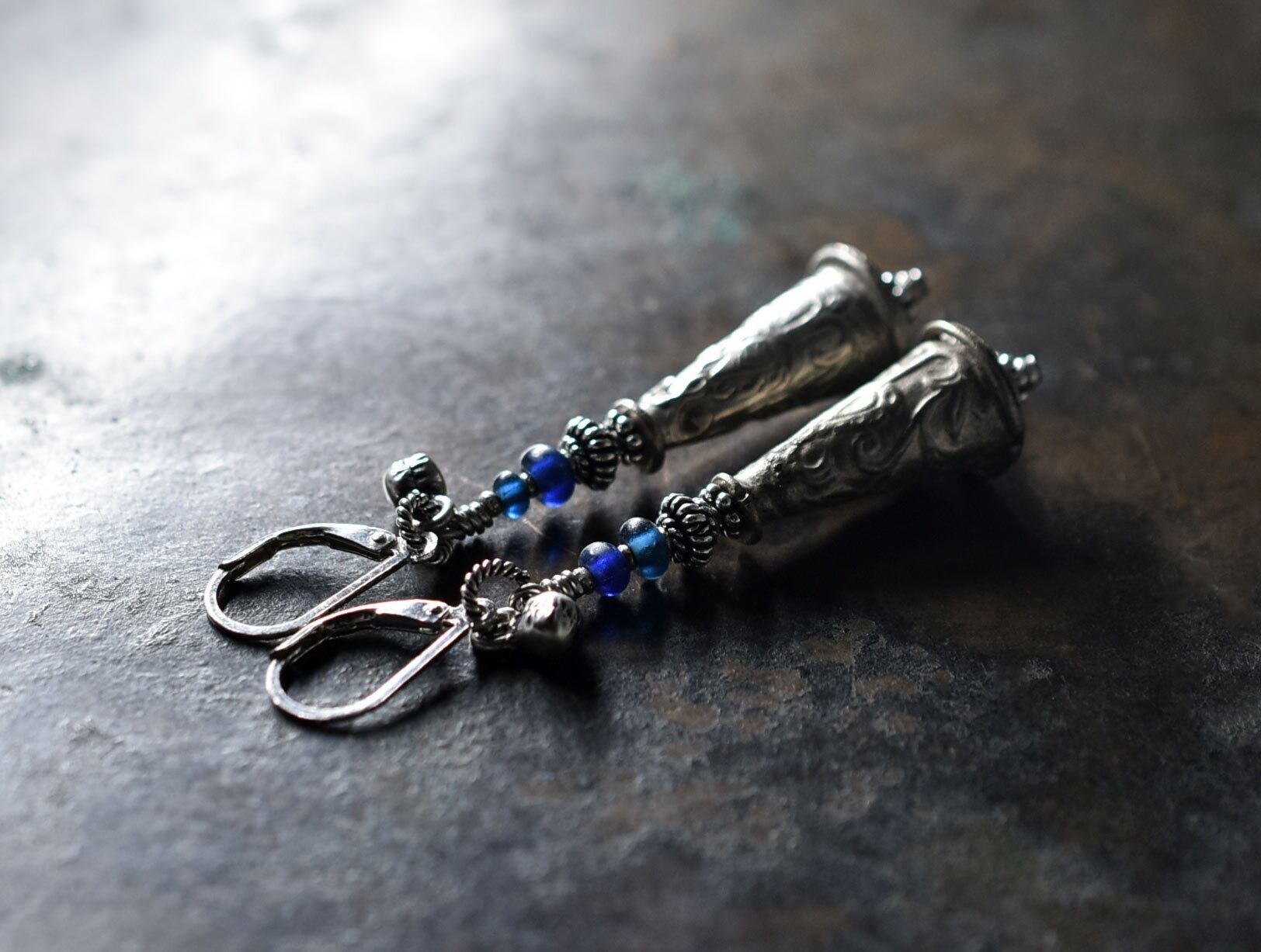 oldアフガンメタルとブルー&インディゴブルーアンティークビーズ、インドシルバー鈴のピアス
