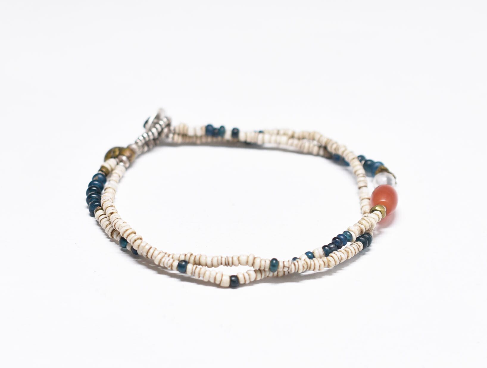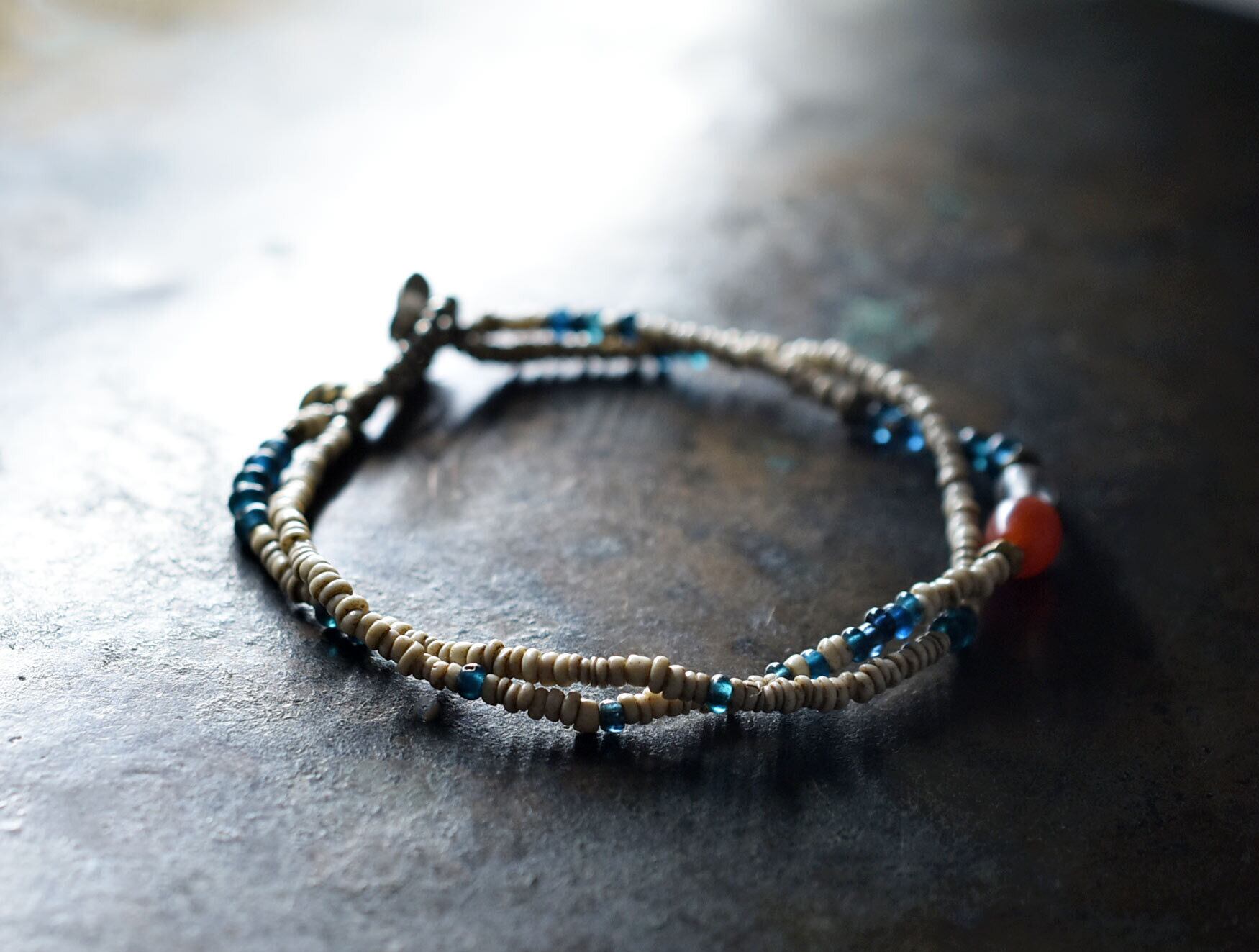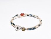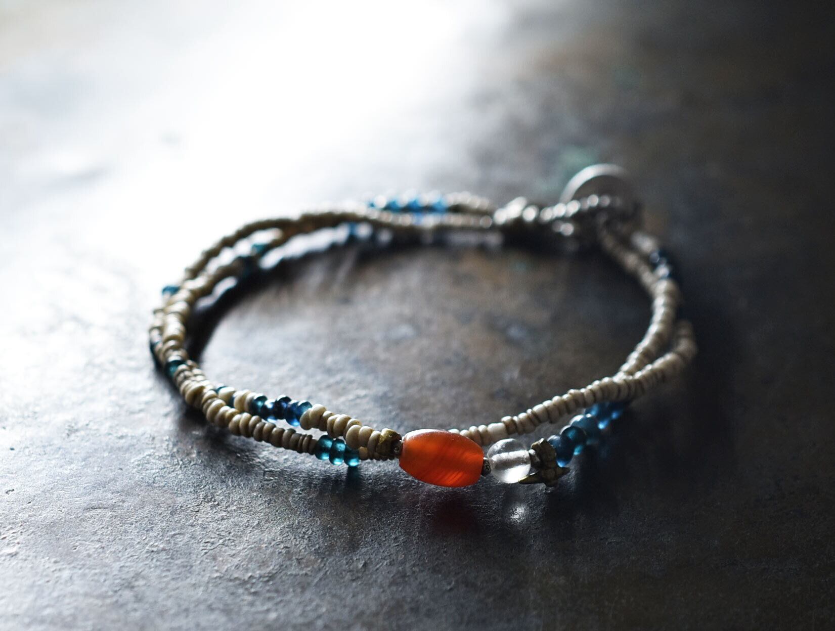シャン族ヴィンテージカーネリアン&古代水晶、ホワイトシードビーズ、インディゴブルーブルービーズ、oldオリッサブラスを繋いだ華奢な2連ブレスです。
