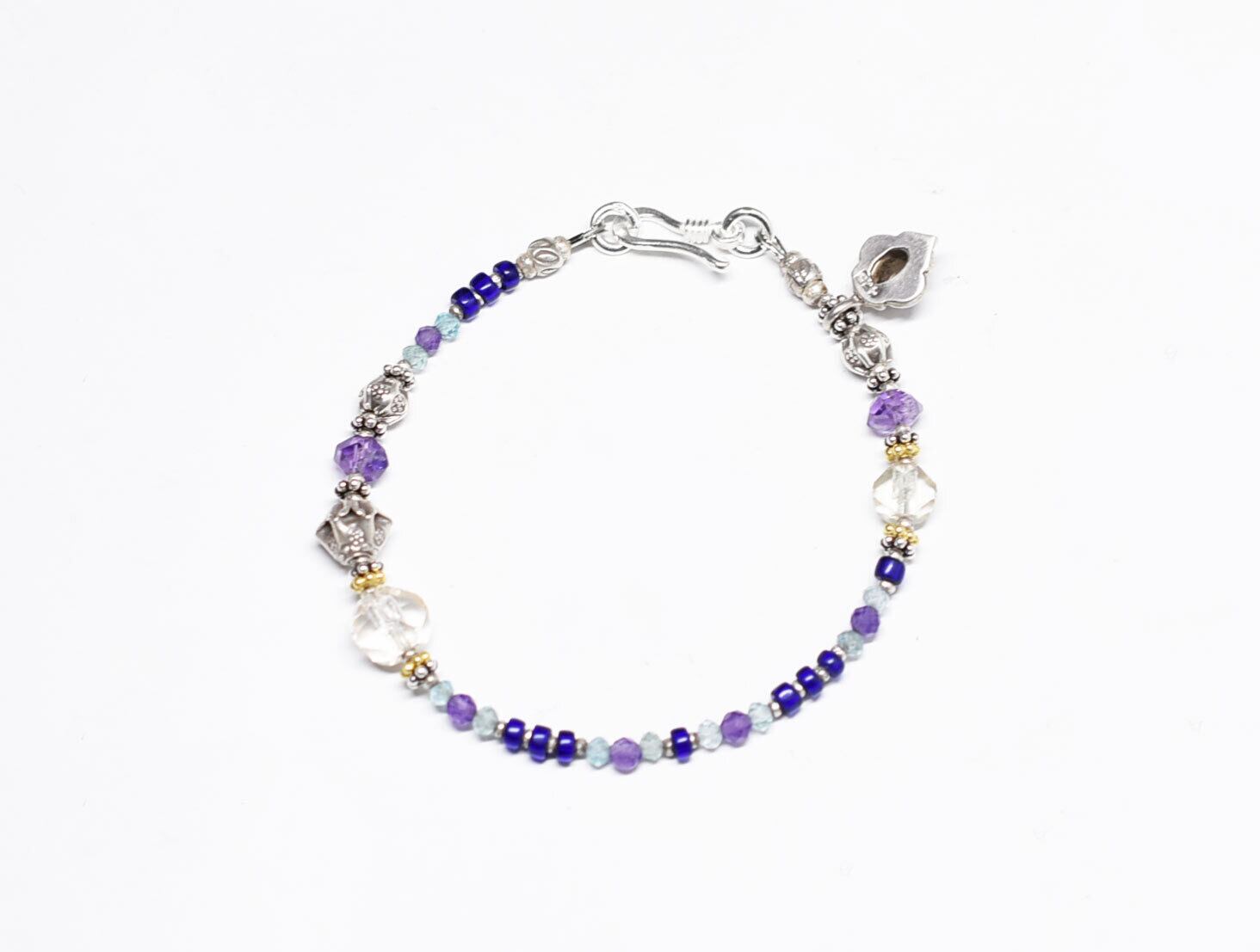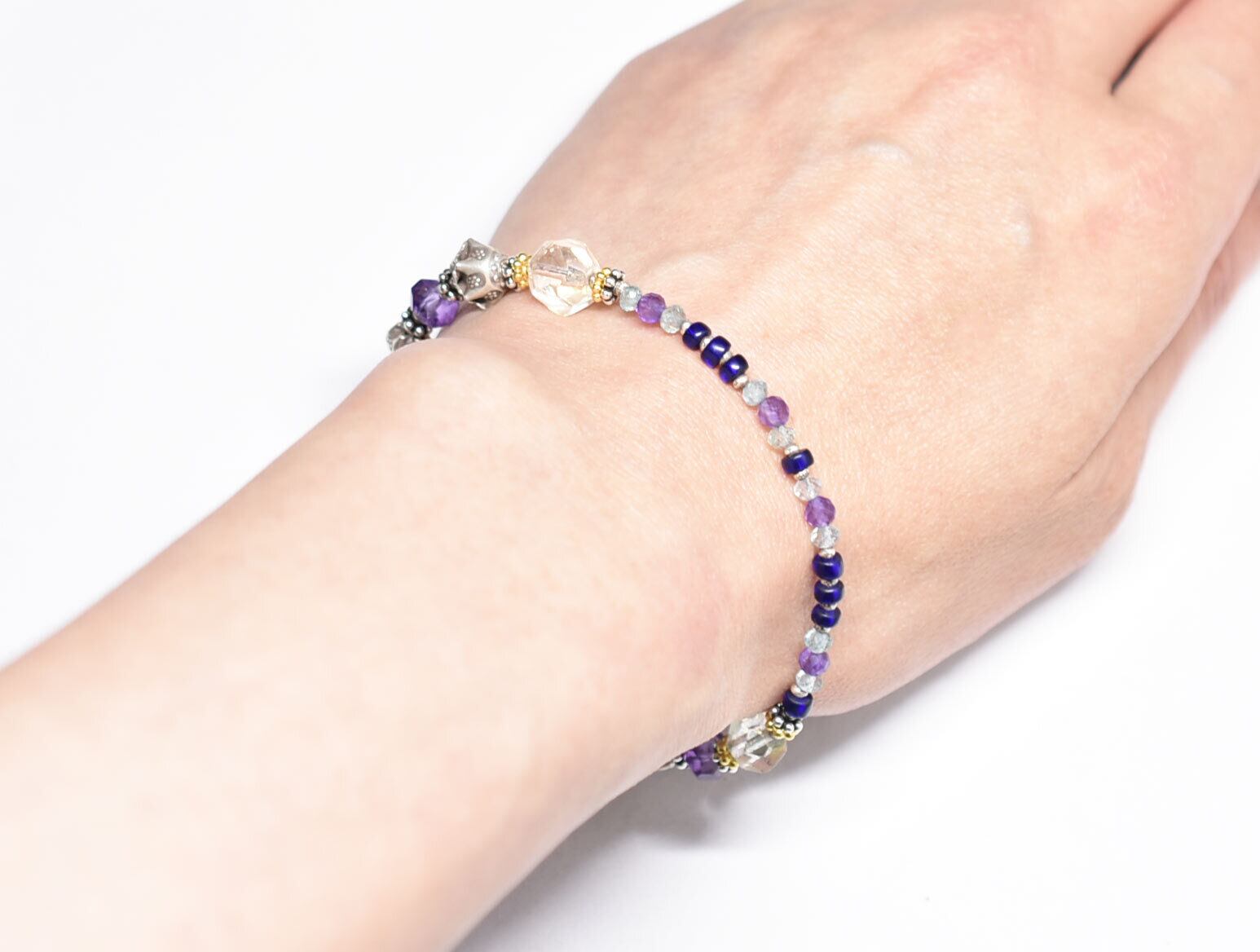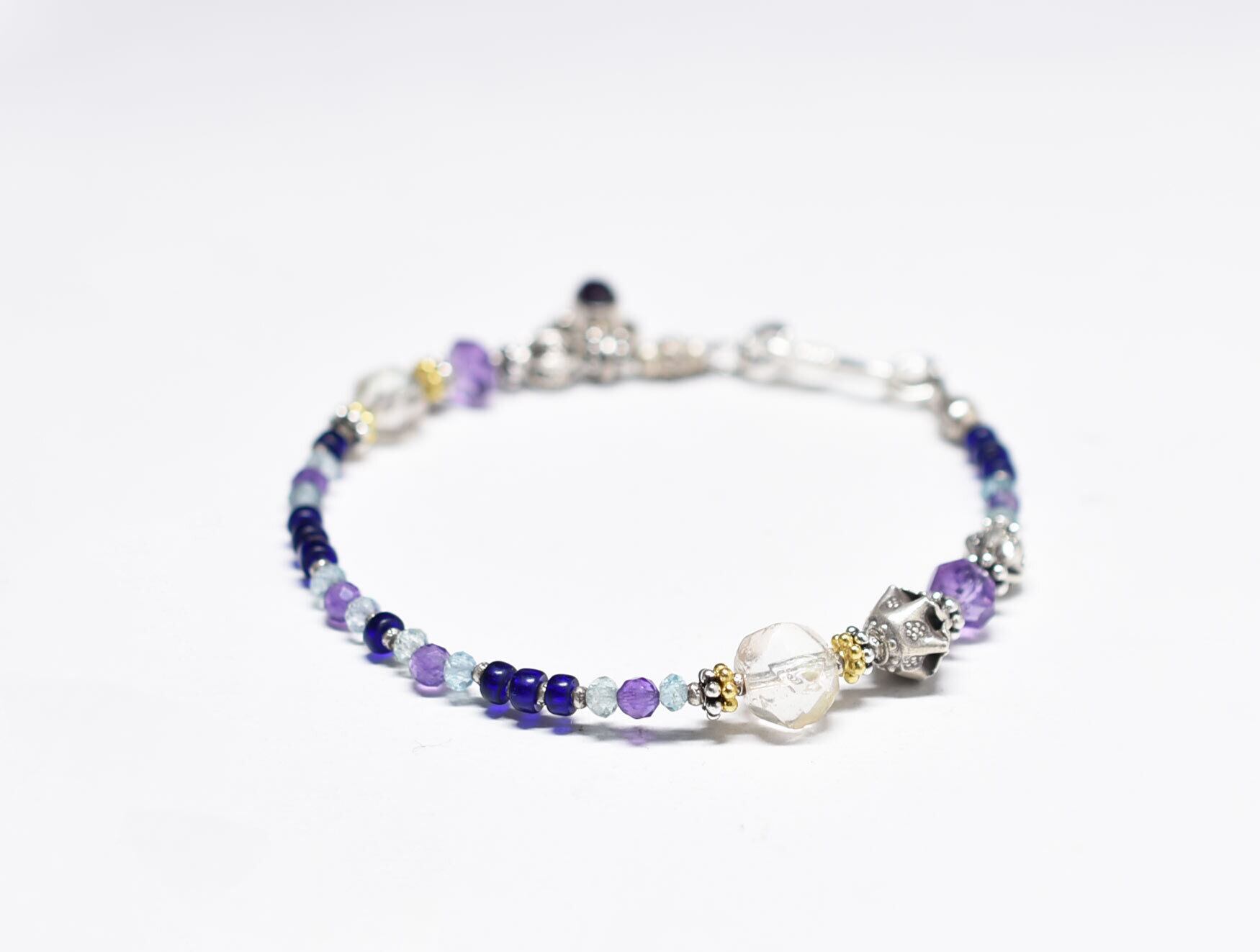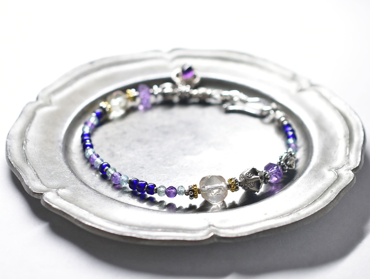 ヴィンテージオーロラビーズとカレンシルバー 、アパタイトとアメジスト、瑠璃色ビーズ、シルバー装飾アメジストチャームを繋いだブレスです。