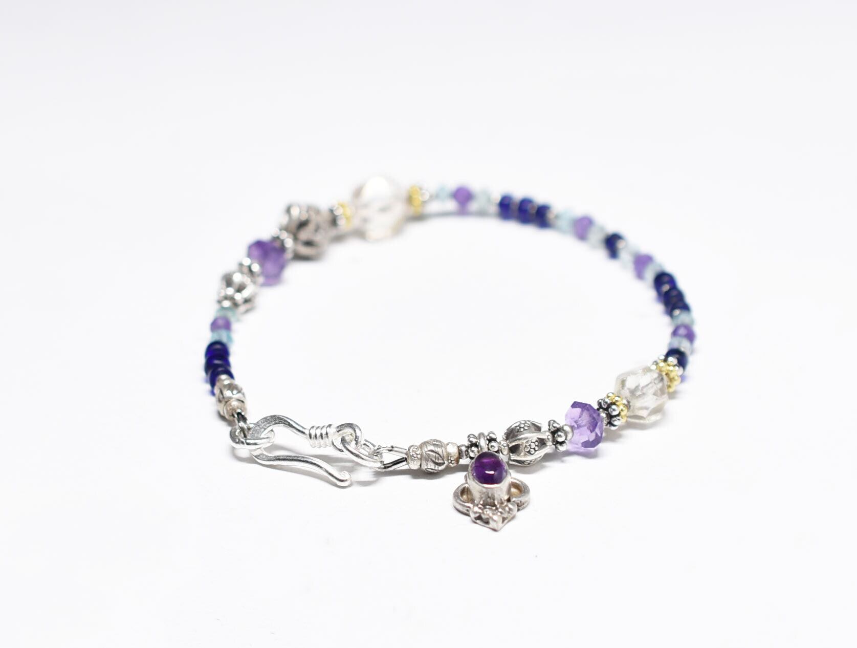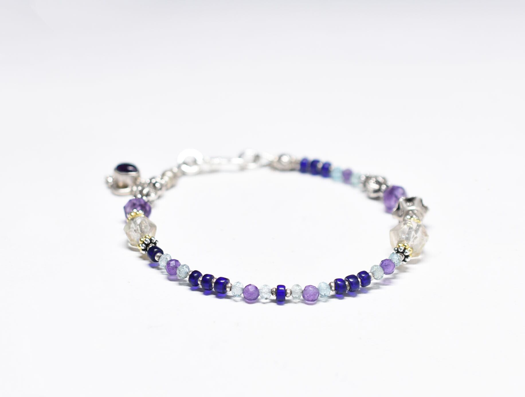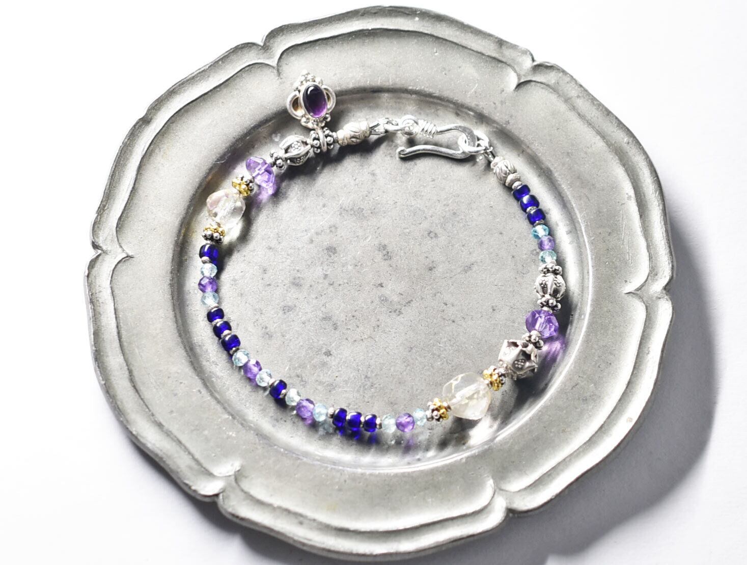 ヴィンテージオーロラビーズとカレンシルバー 、アパタイトとアメジスト、瑠璃色ビーズ、シルバー装飾アメジストチャームのブレス