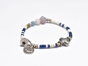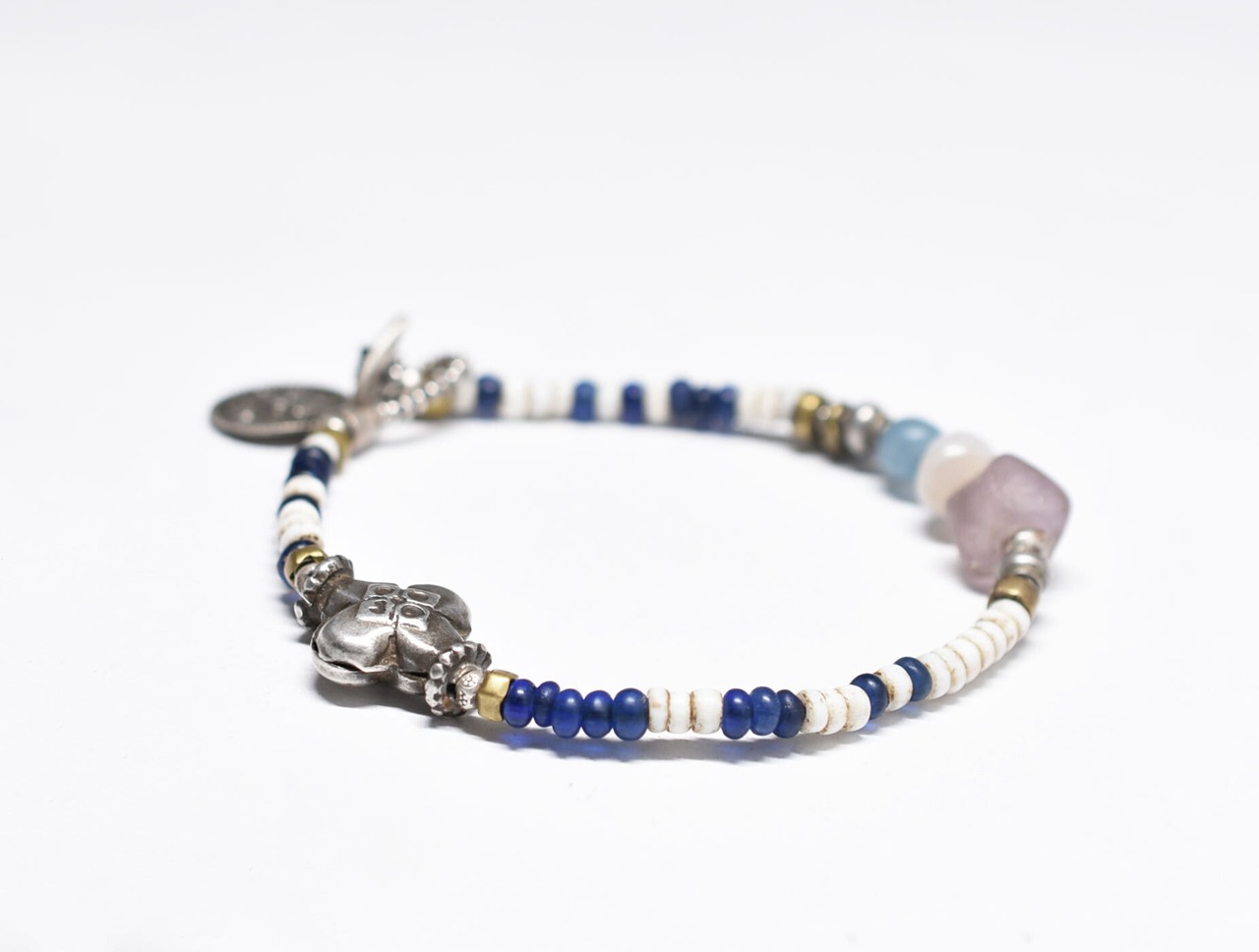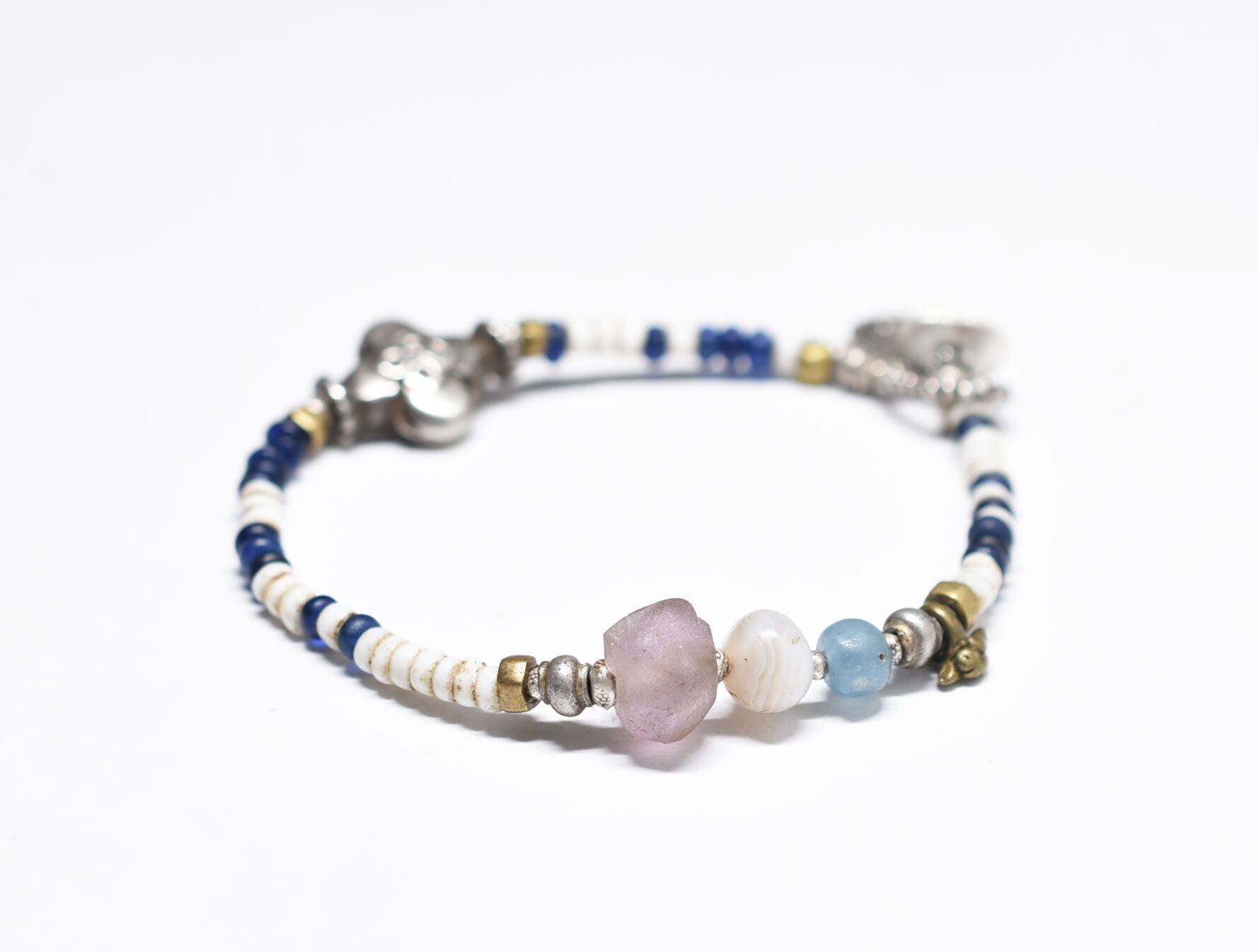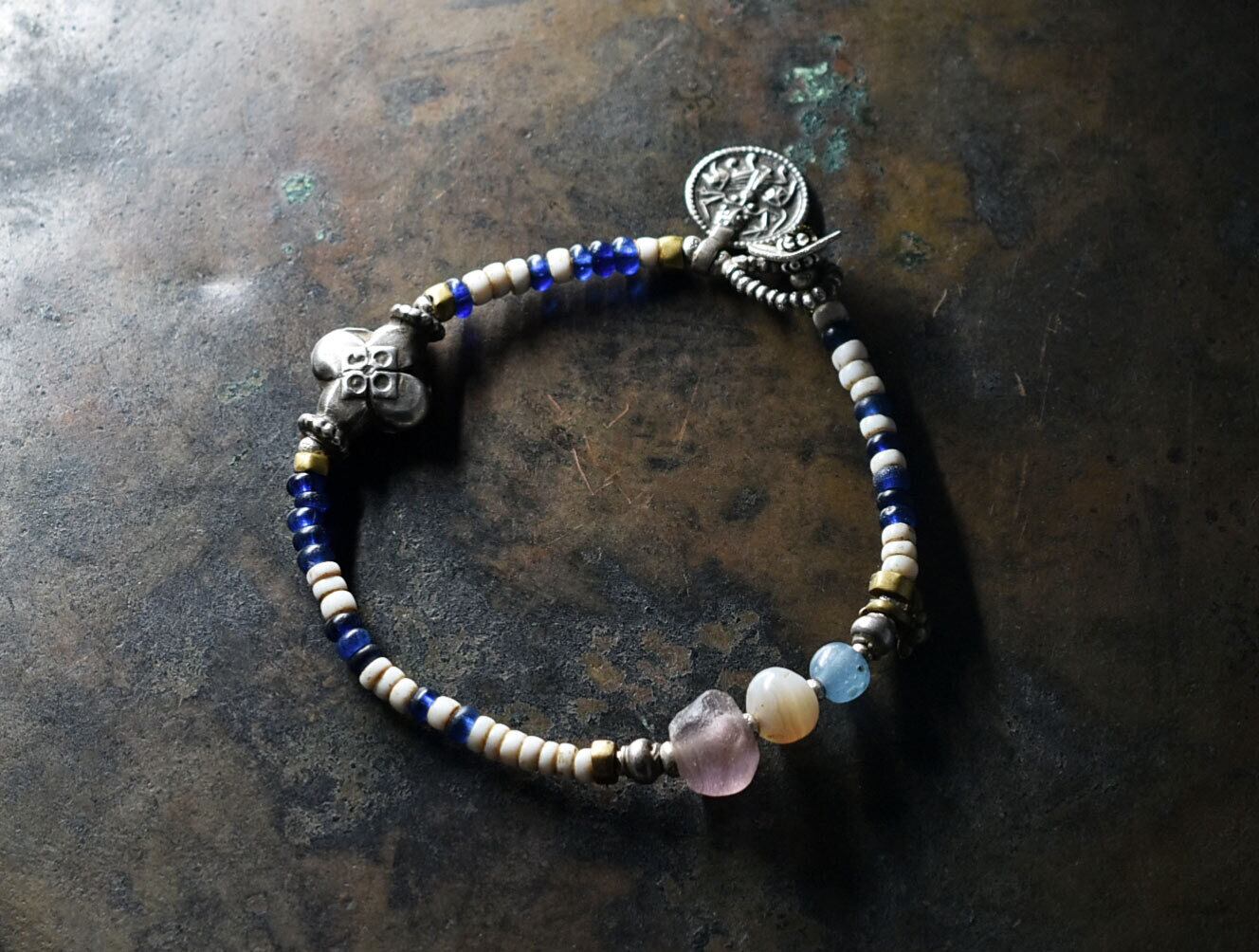 ドゴン族すみれ色ビーズと古代瑪瑙、oldヒマーチャルシルバー、ブルー&ベビーブルー&ホワイトビーズ、oldインドシルバーチャームを繋いだブレスです。