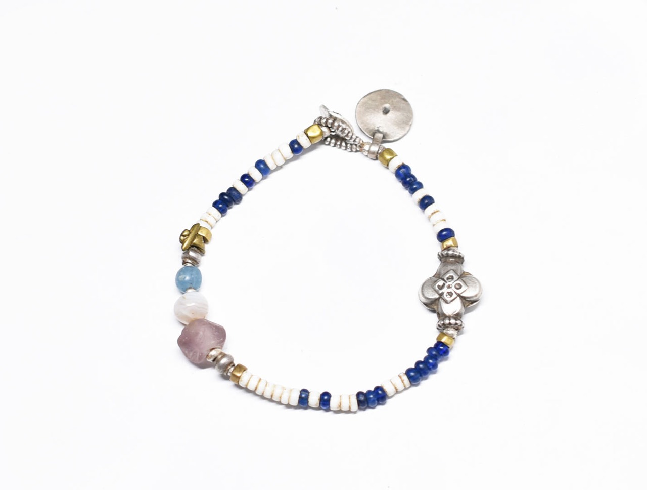 ドゴン族すみれ色ビーズと古代瑪瑙、oldヒマーチャルシルバー、ブルー&ベビーブルー&ホワイトビーズ、oldインドシルバーチャームのブレス