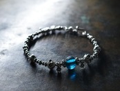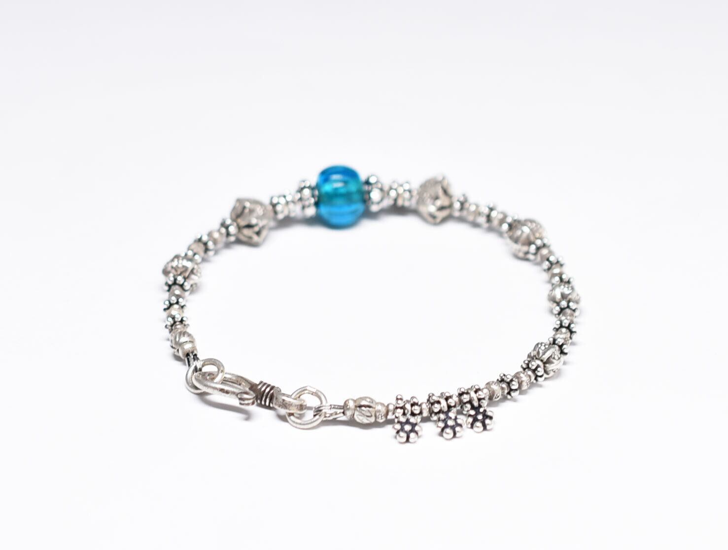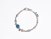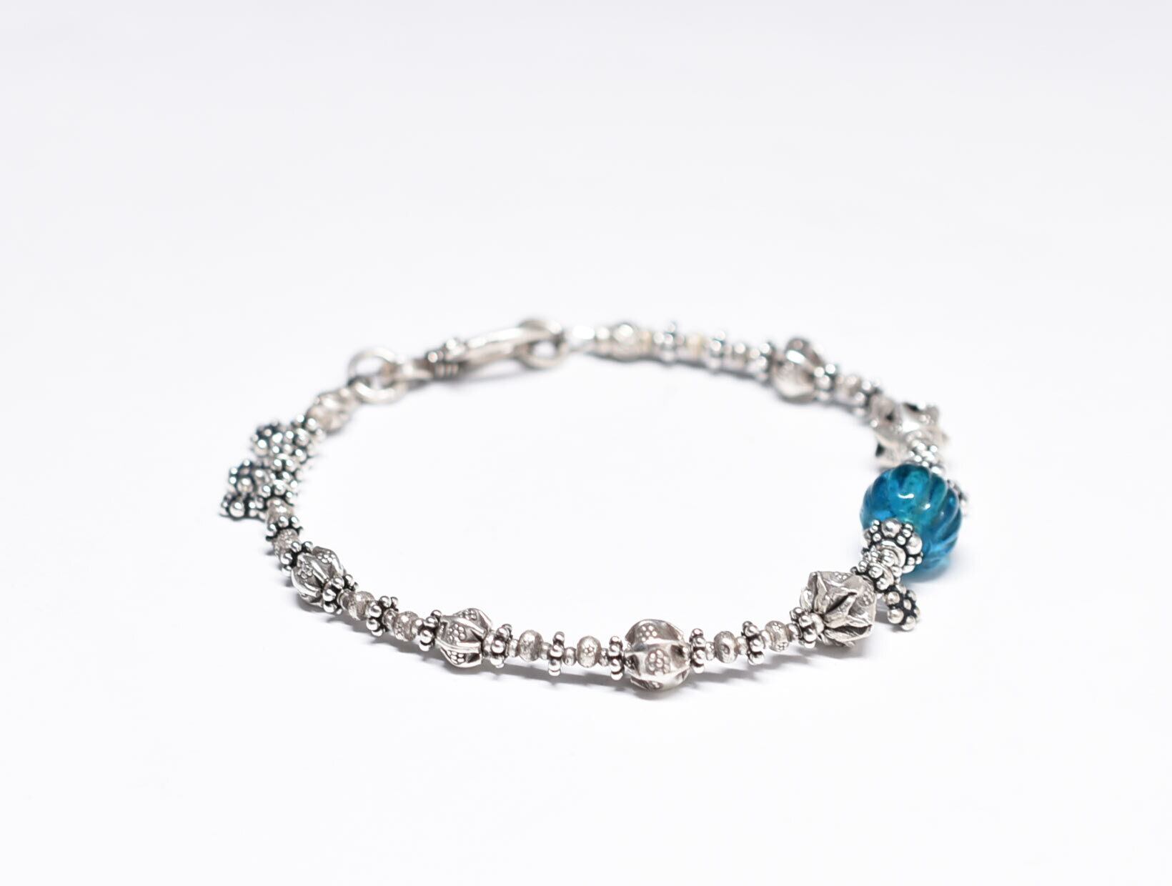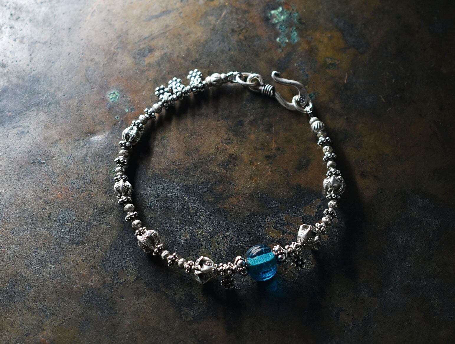一粒のブルービーズを様々なシルバーで飾り付けたブレスです。