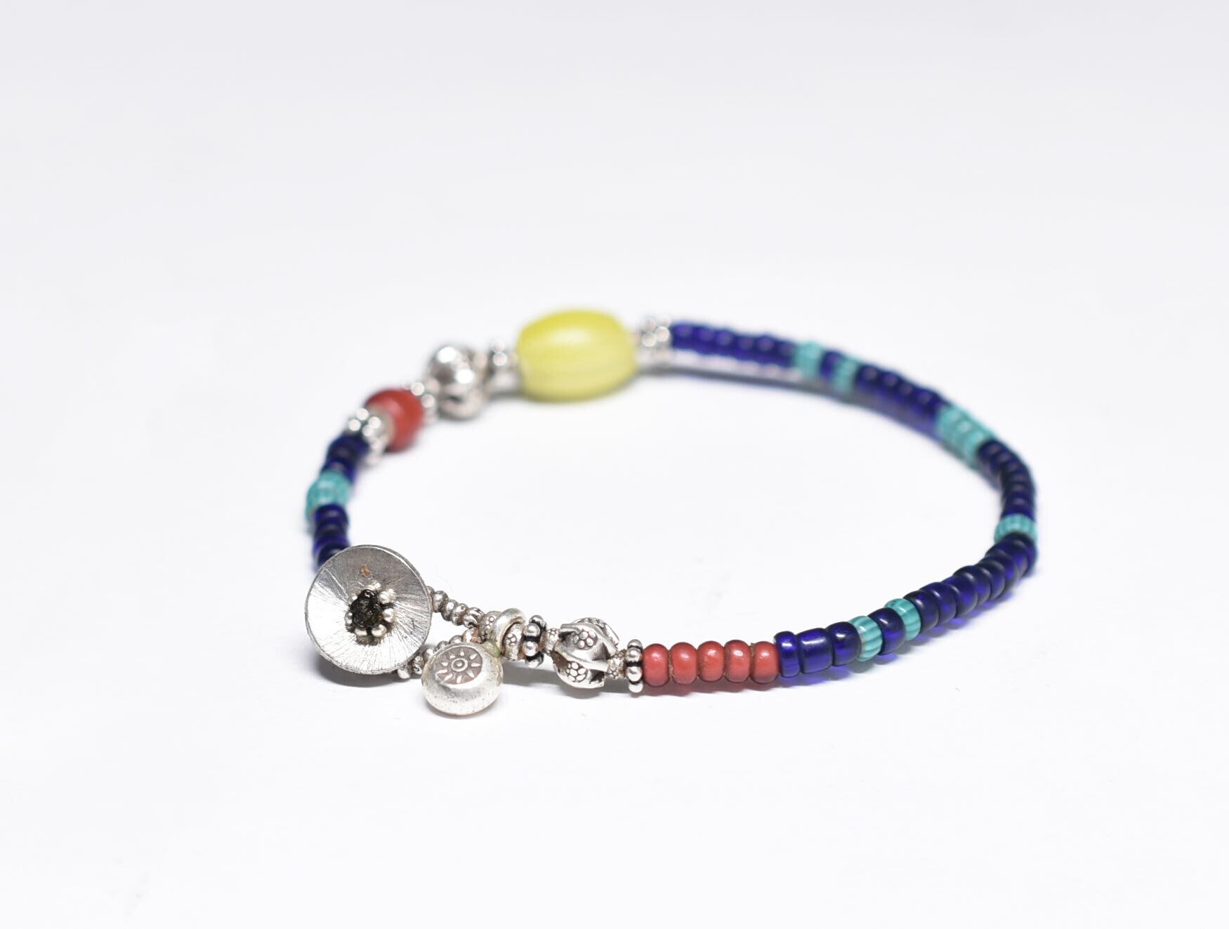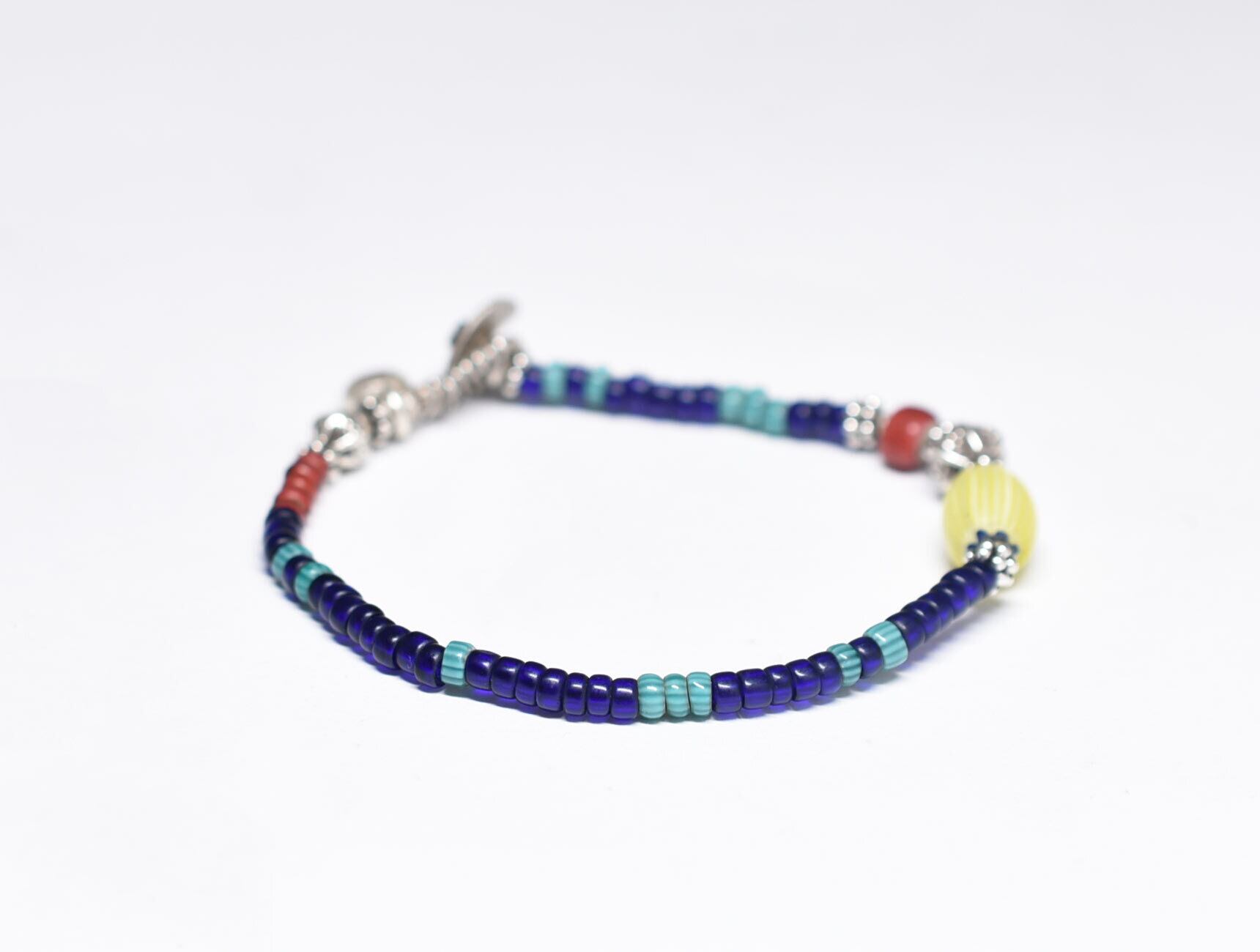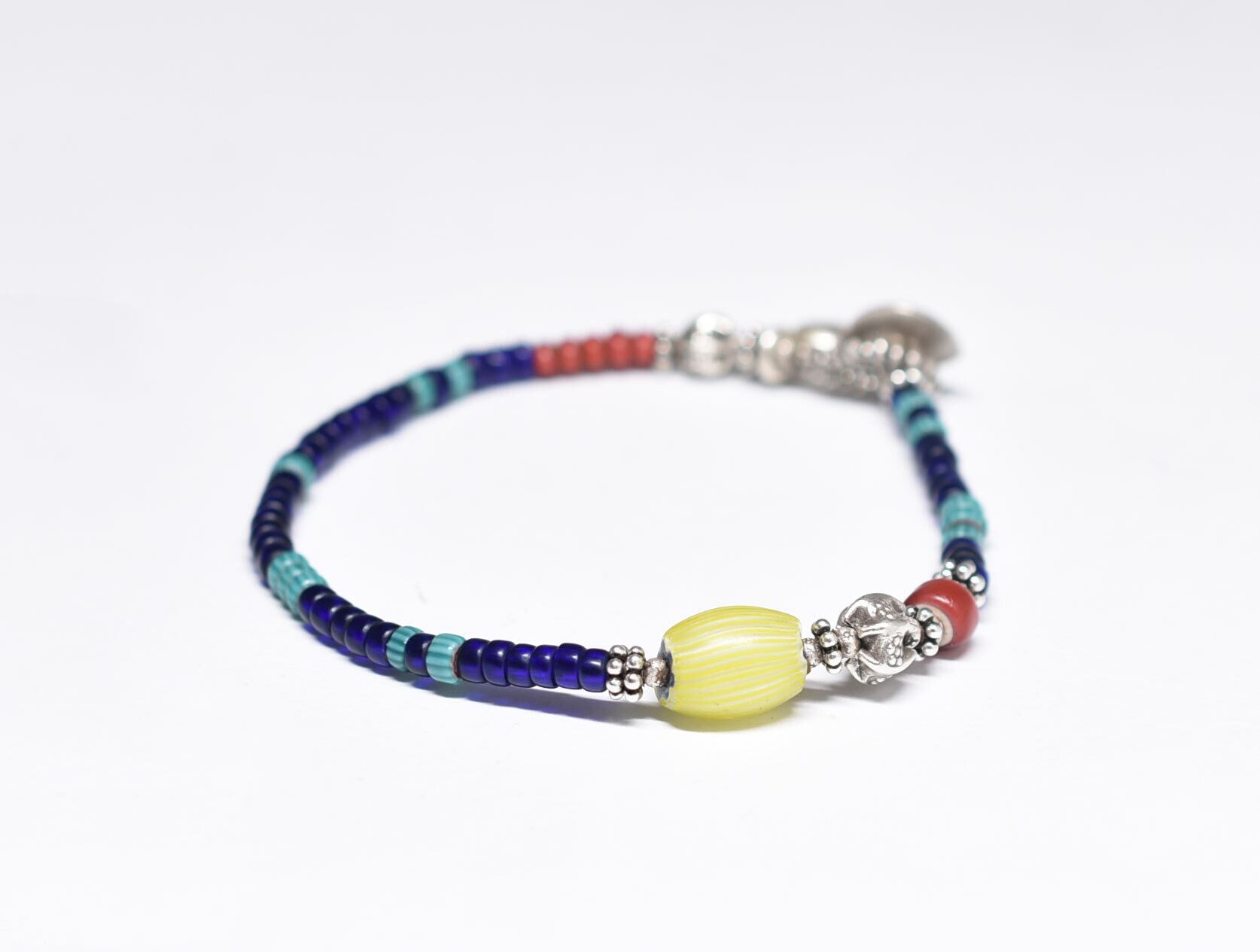 レモン色オニオンスキンと金赤ホワイトハーツとカレンシルバー、ターコイズブルーシェブロン、瑠璃色ビーズのブレス