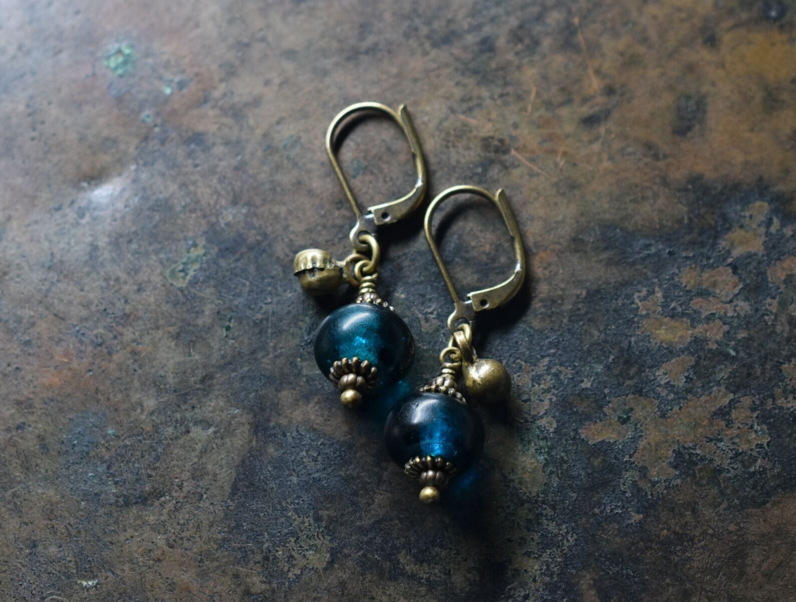 インディゴブルーヴィンテージビーズと民族鈴のピアス